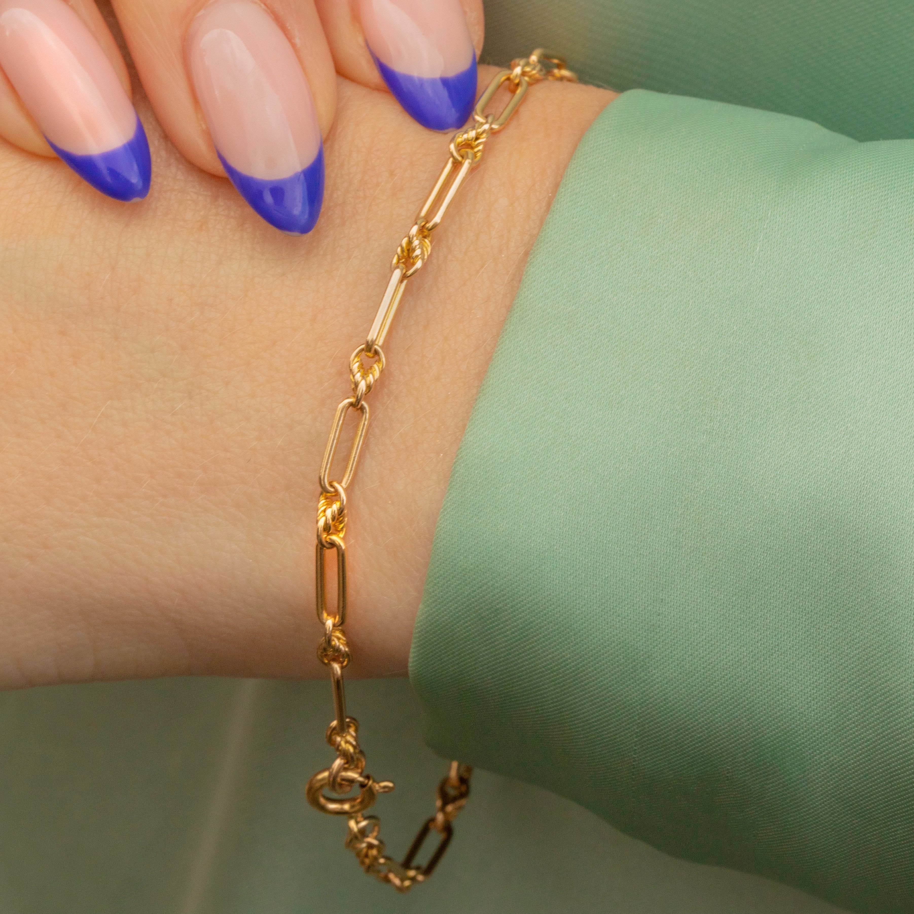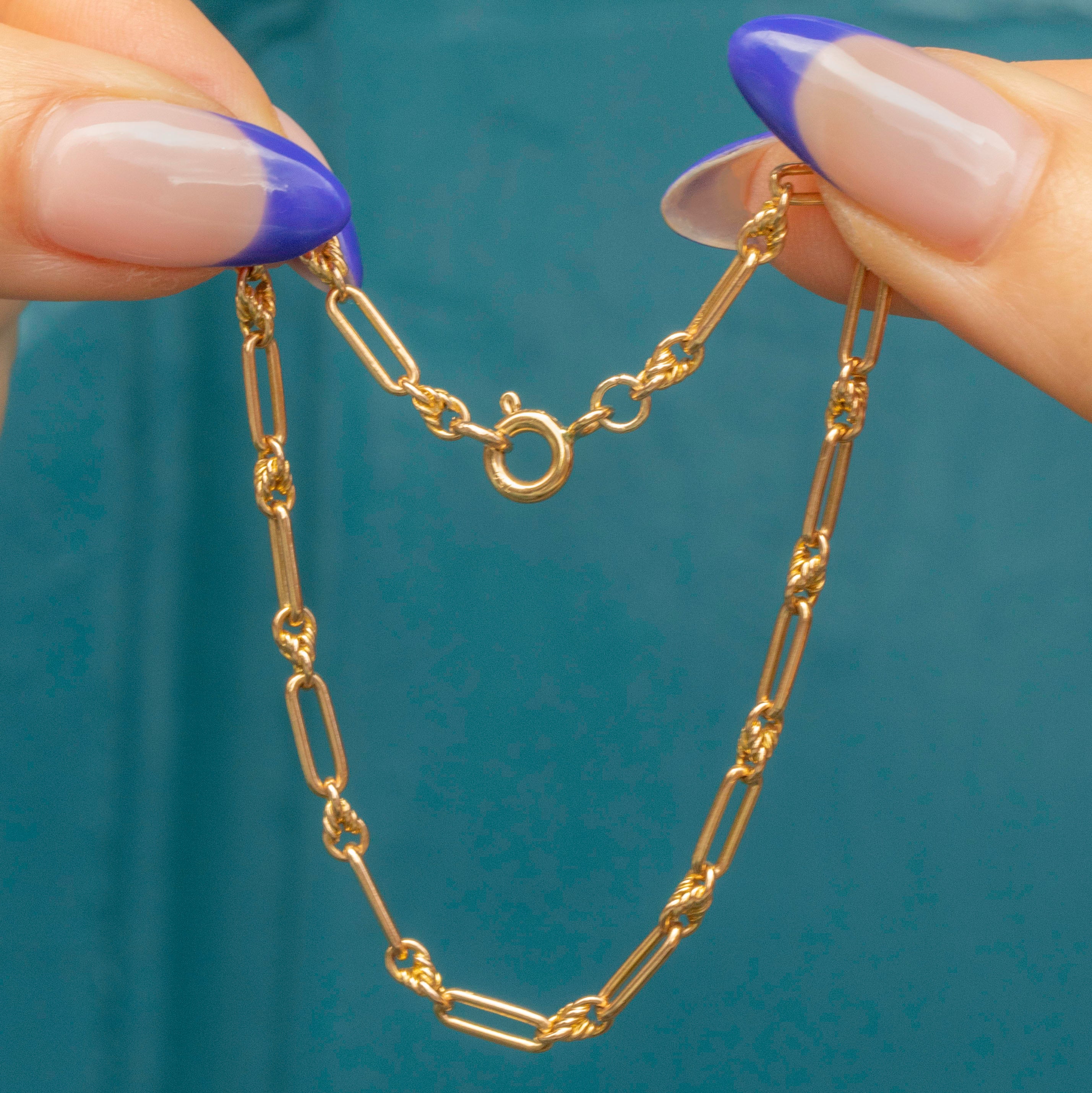 Bring something different to your wrist stack with this antique 15ct Gold lover's knot trombone link bracelet! Dainty lover's knots are interwined with slender trombone links forming a sleek design that gracefully adorns your wrist.