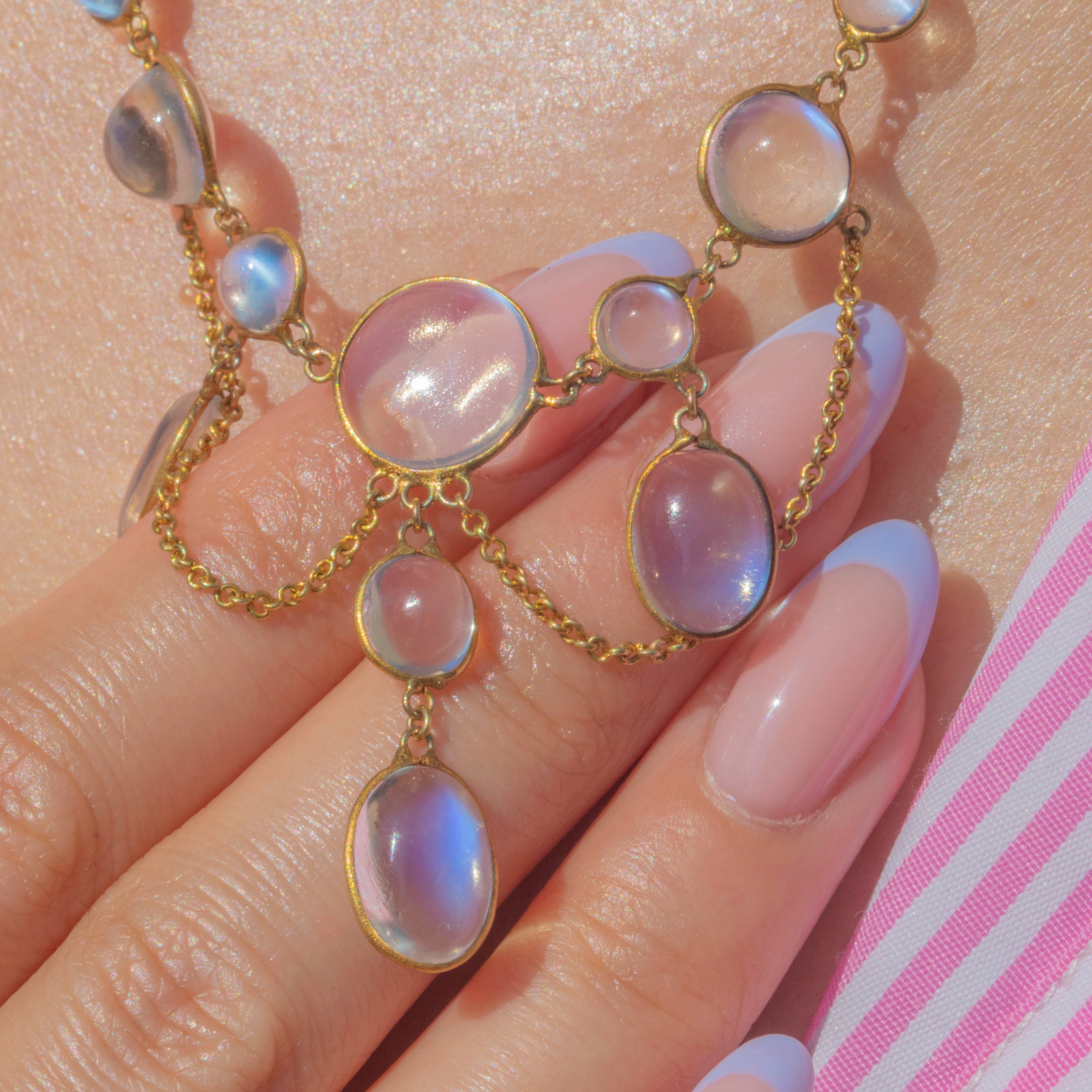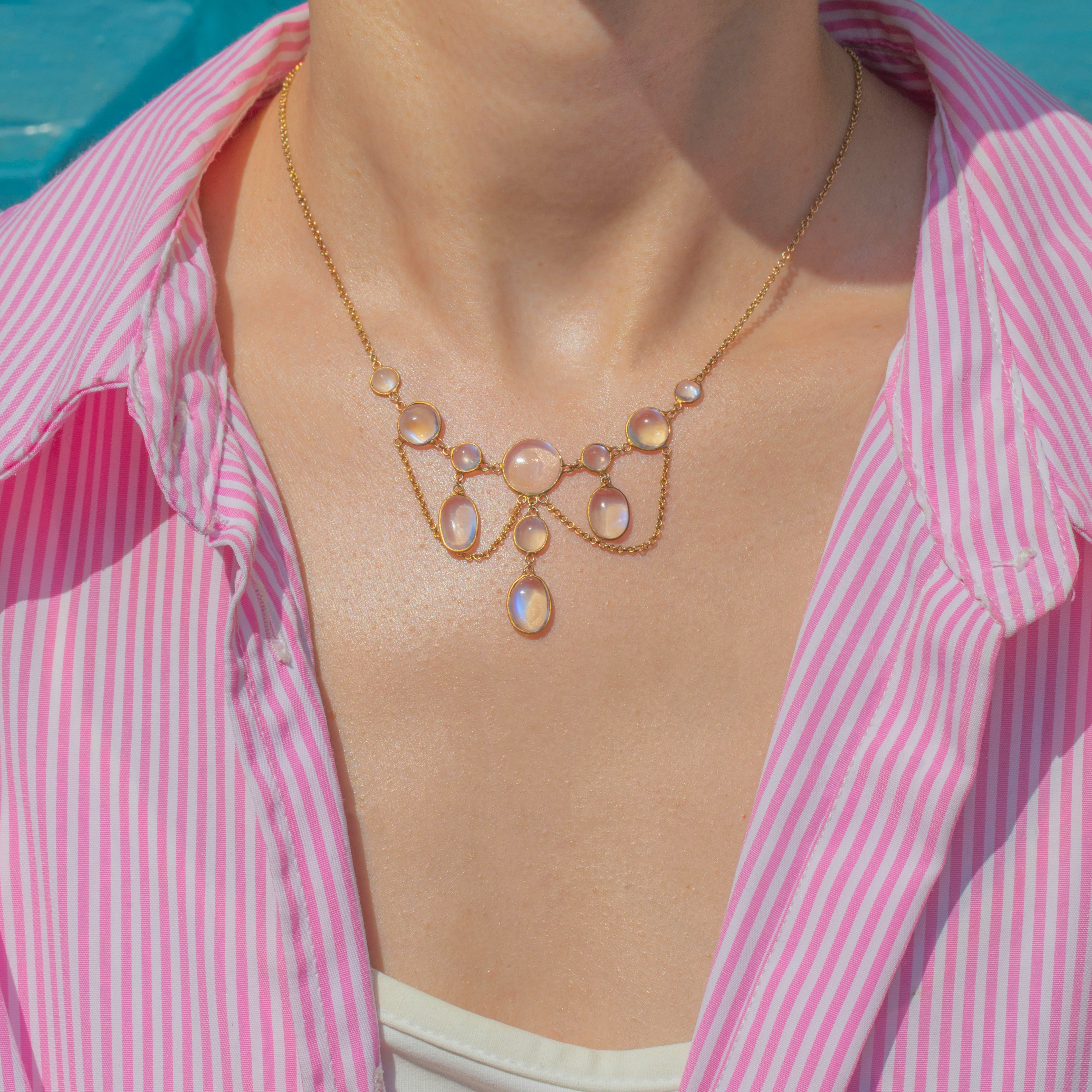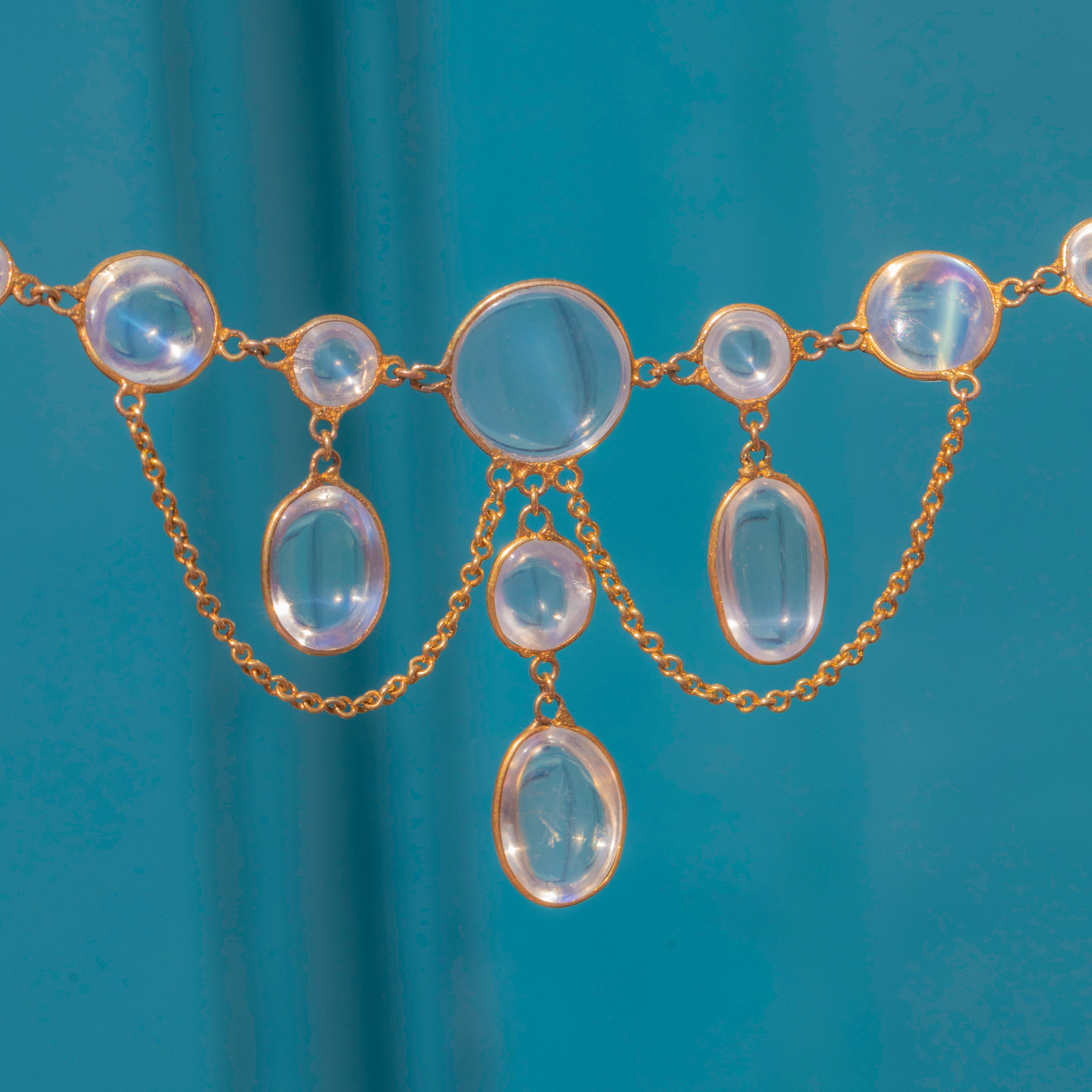 Crafted from rich, buttery 15ct Gold and inlaid with 11 mystical Moonstones, boasting a combined carat weight of 10.55ct, this Victorian necklace emits a luminous silvery adularescence.