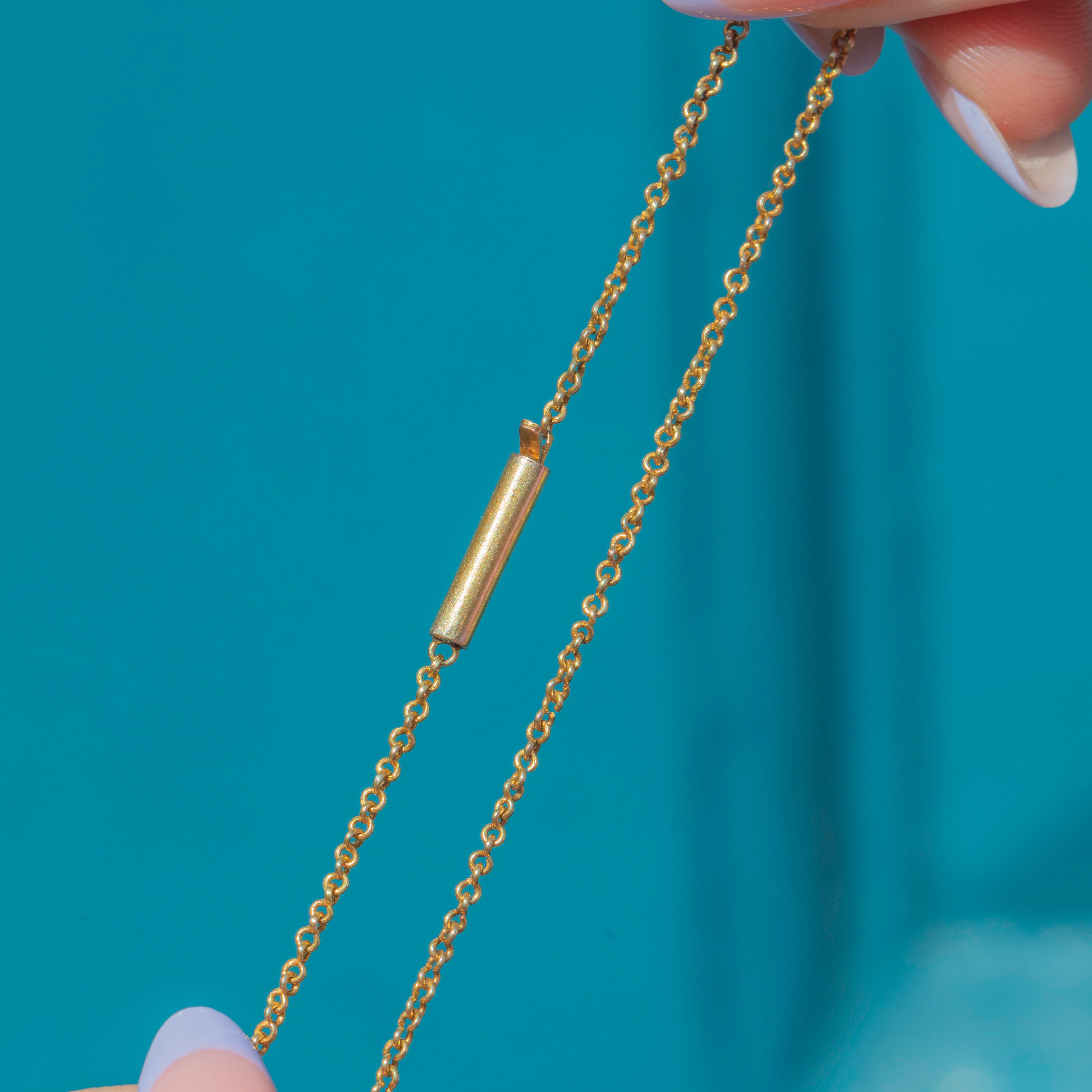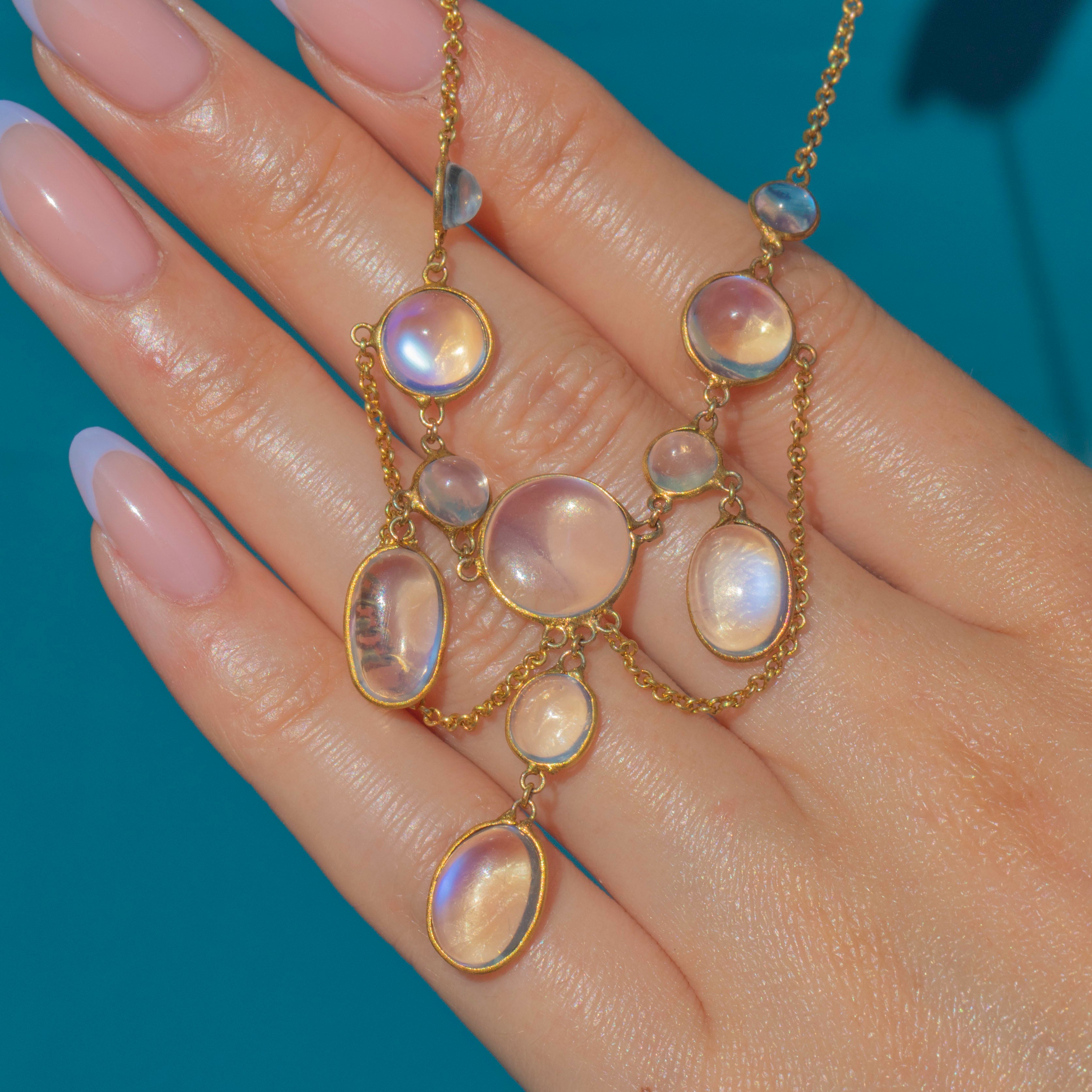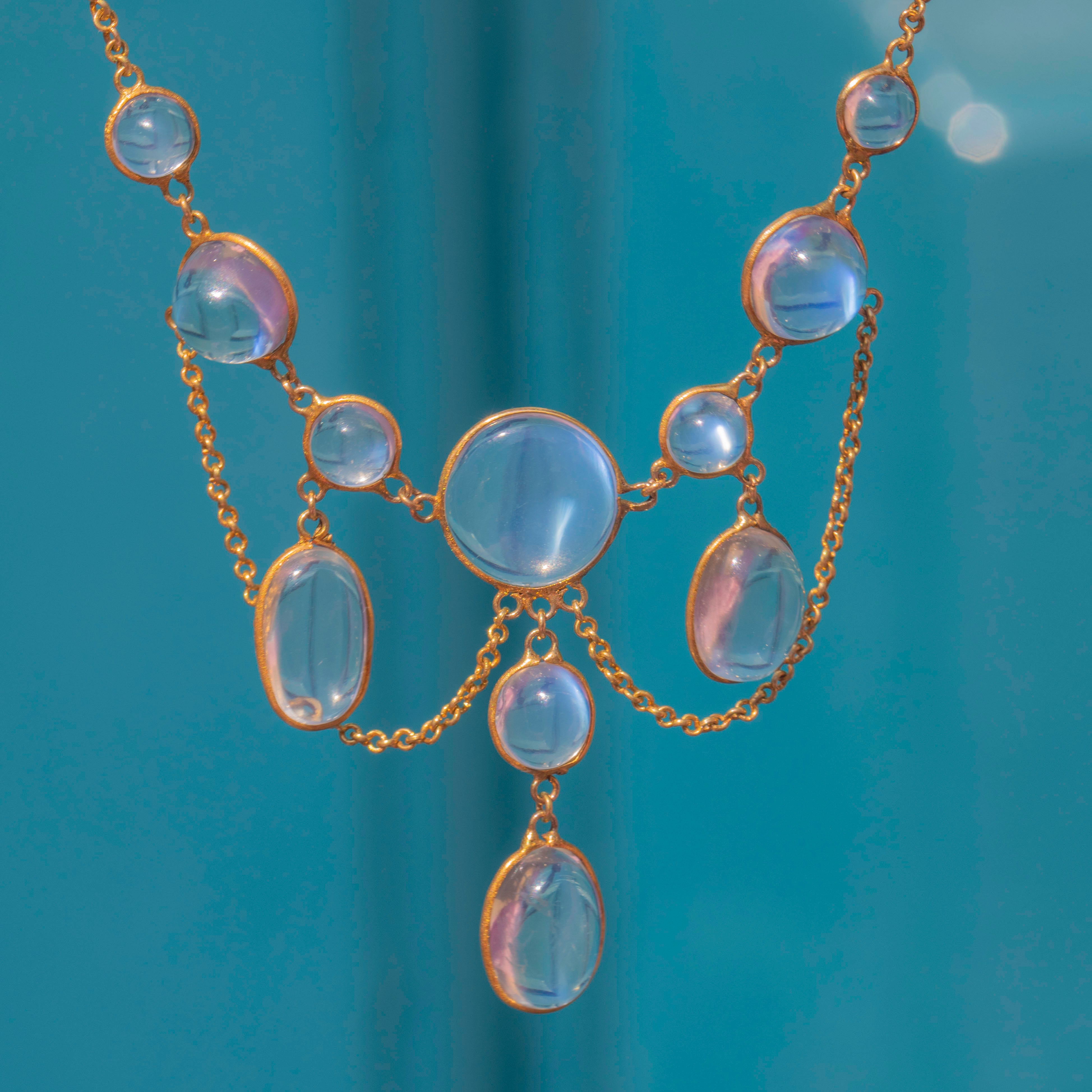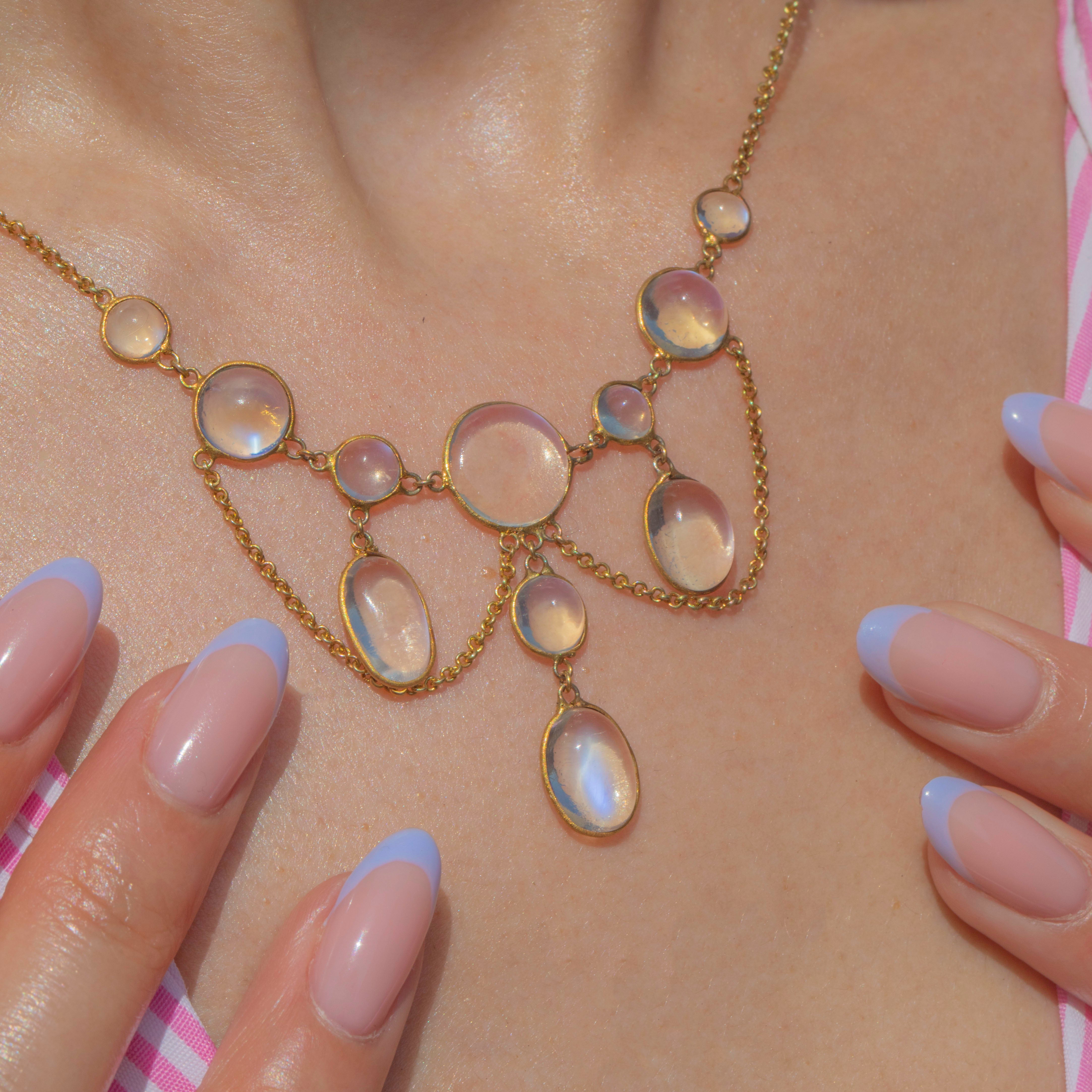 Crafted from rich, buttery 15ct Gold and inlaid with 11 mystical Moonstones, boasting a combined carat weight of 10.55ct, this Victorian necklace emits a luminous silvery adularescence.