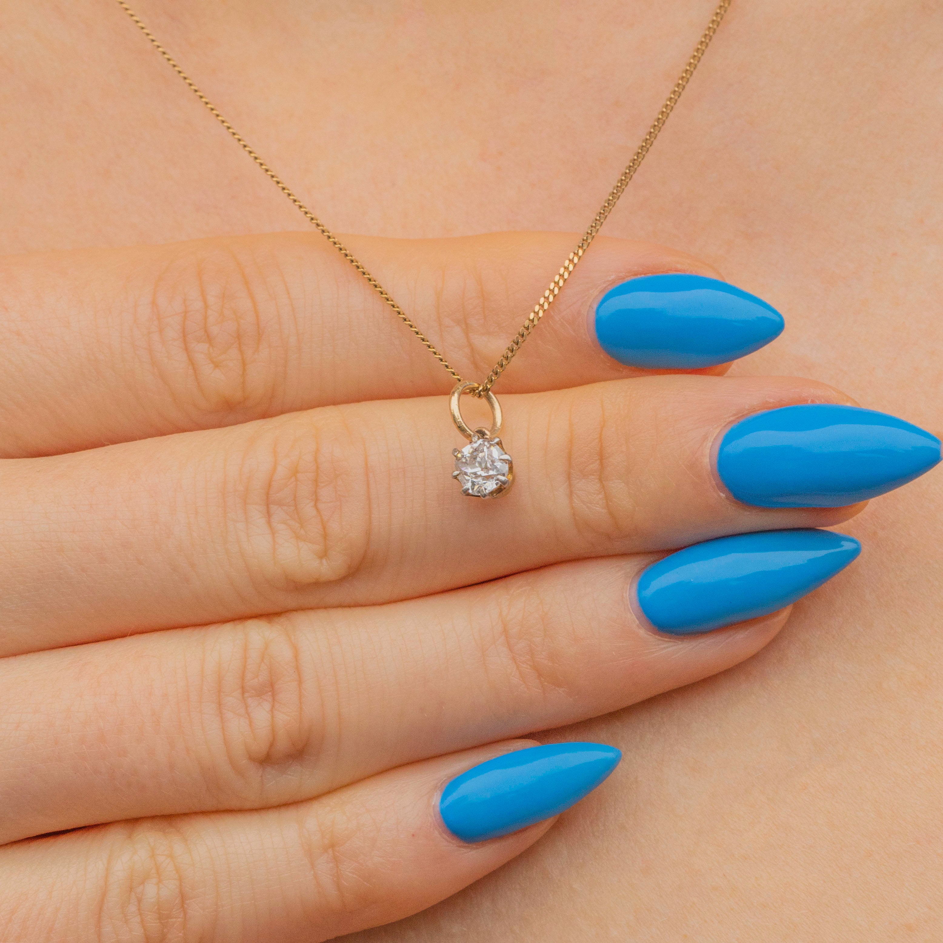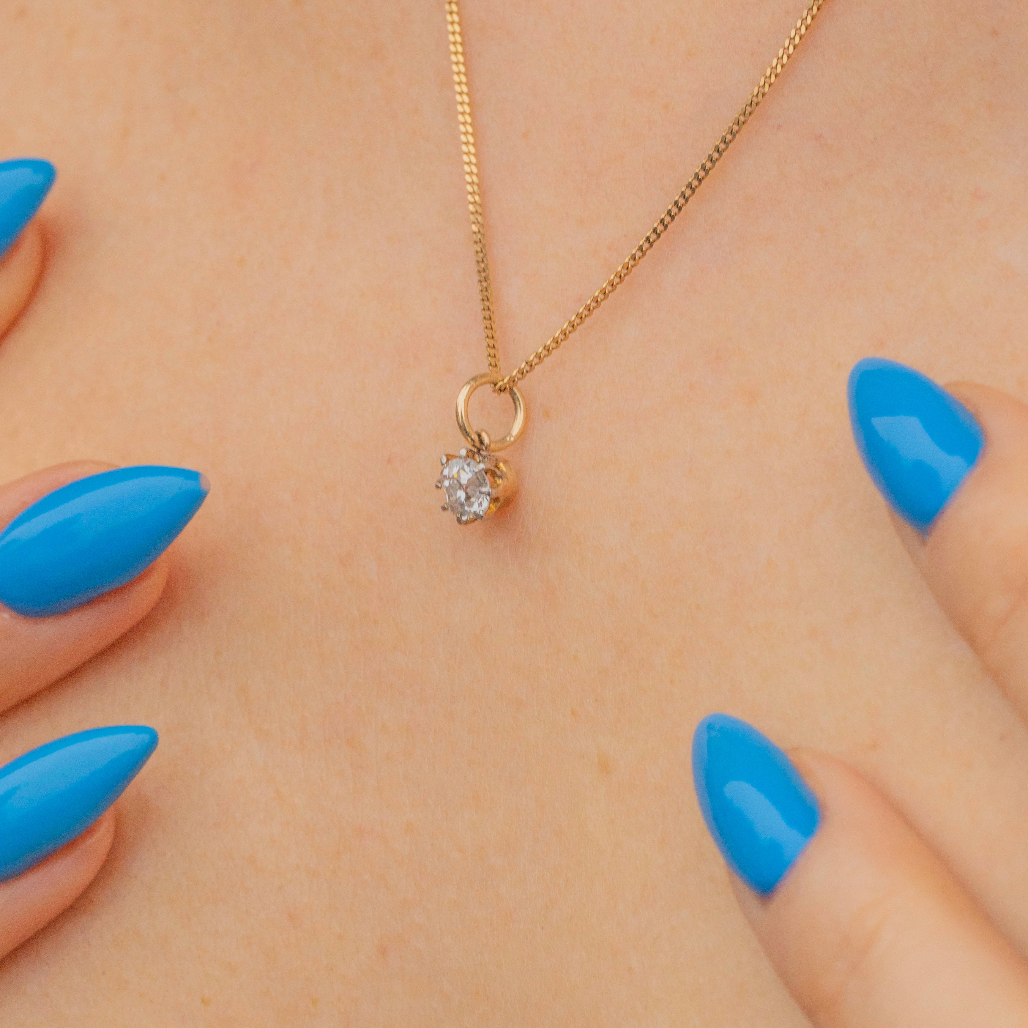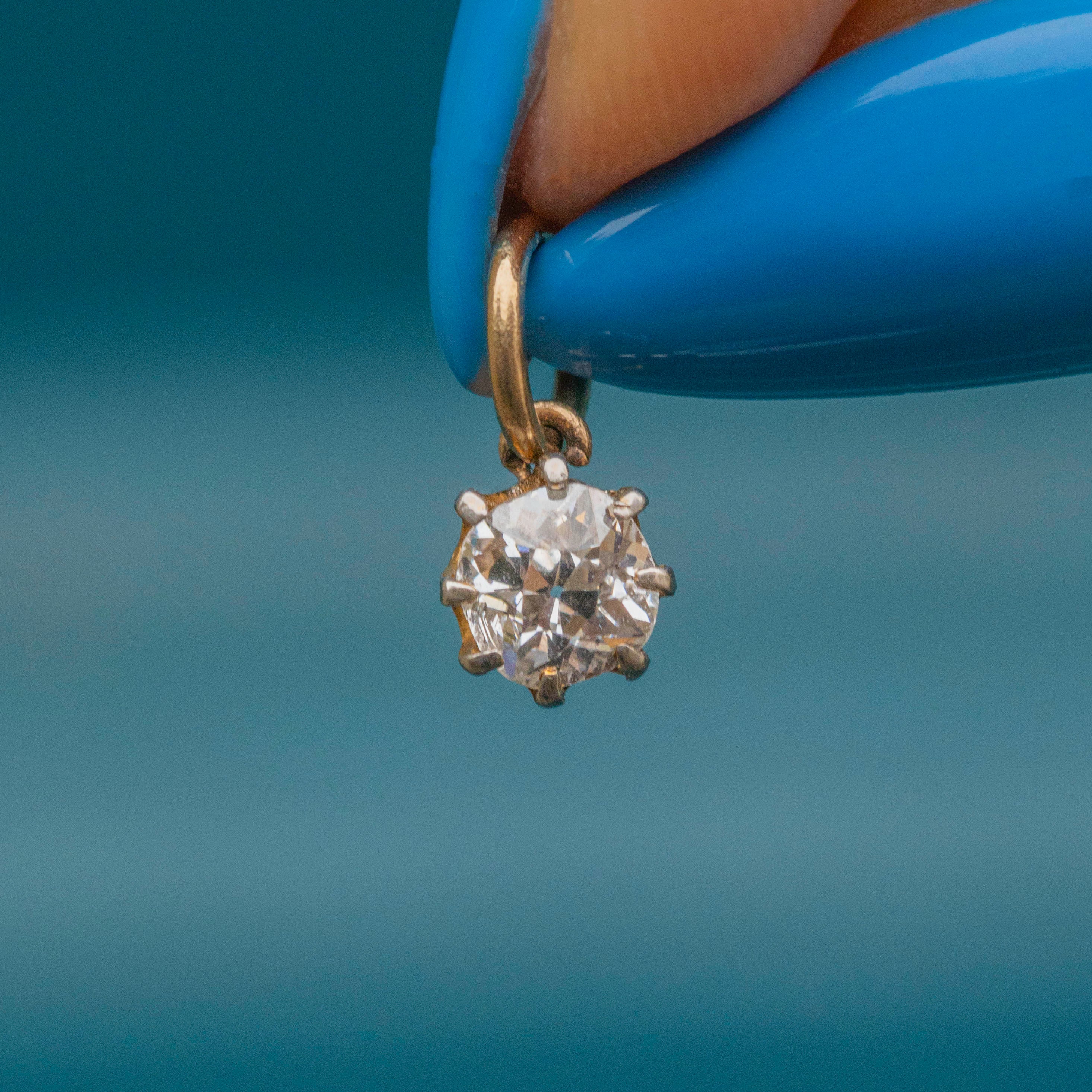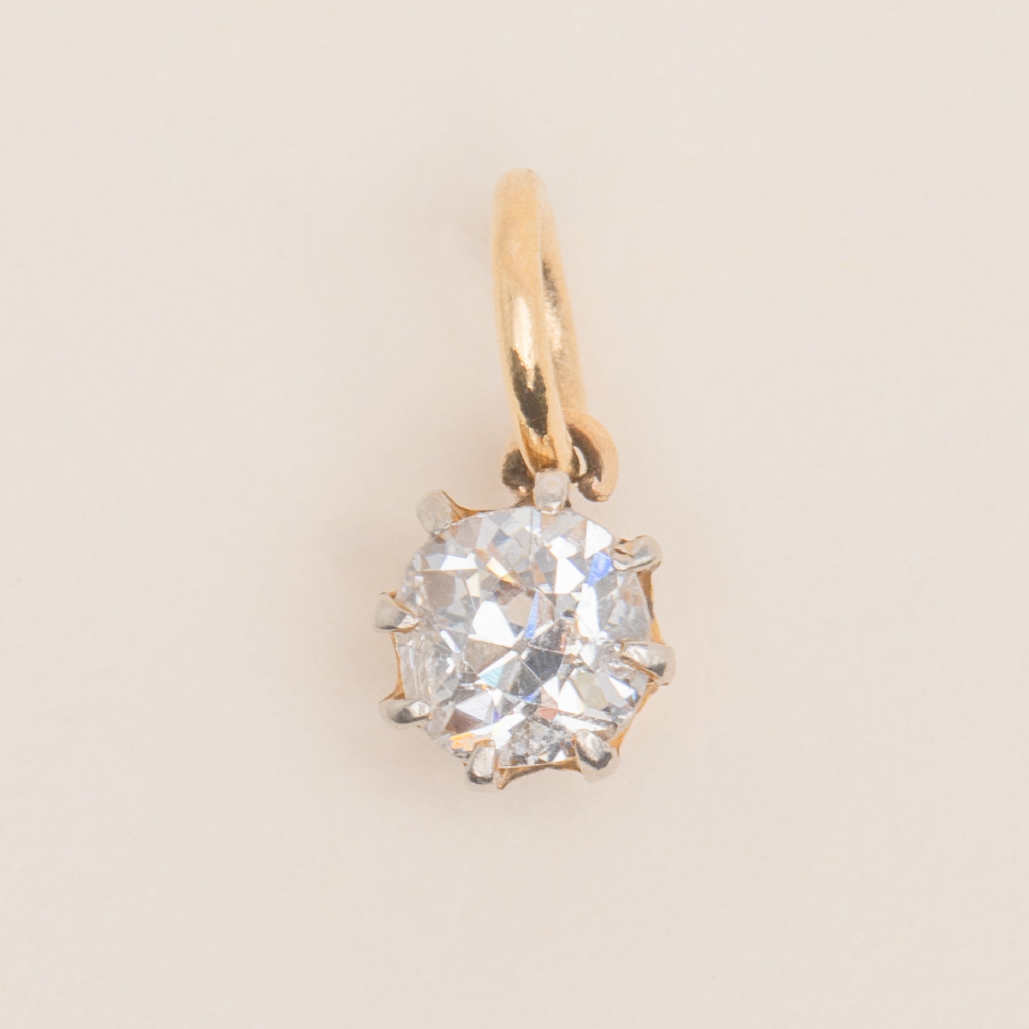 VERY GOOD-EXCELLENT. This antique 15ct Gold old-mine-cut Diamond charm is in wonderful condition. The Diamond is crisp and bright, securely held within its setting. The Diamond does have a small scuff on its surface, however, this is minuscule and only visible under the inspection of a loupe and doesn't affect the overall impact of the piece. The jump ring is soldered shut allowing for confident wear. A truly versatile and chic charm, you'll want to wear this pendant every day!