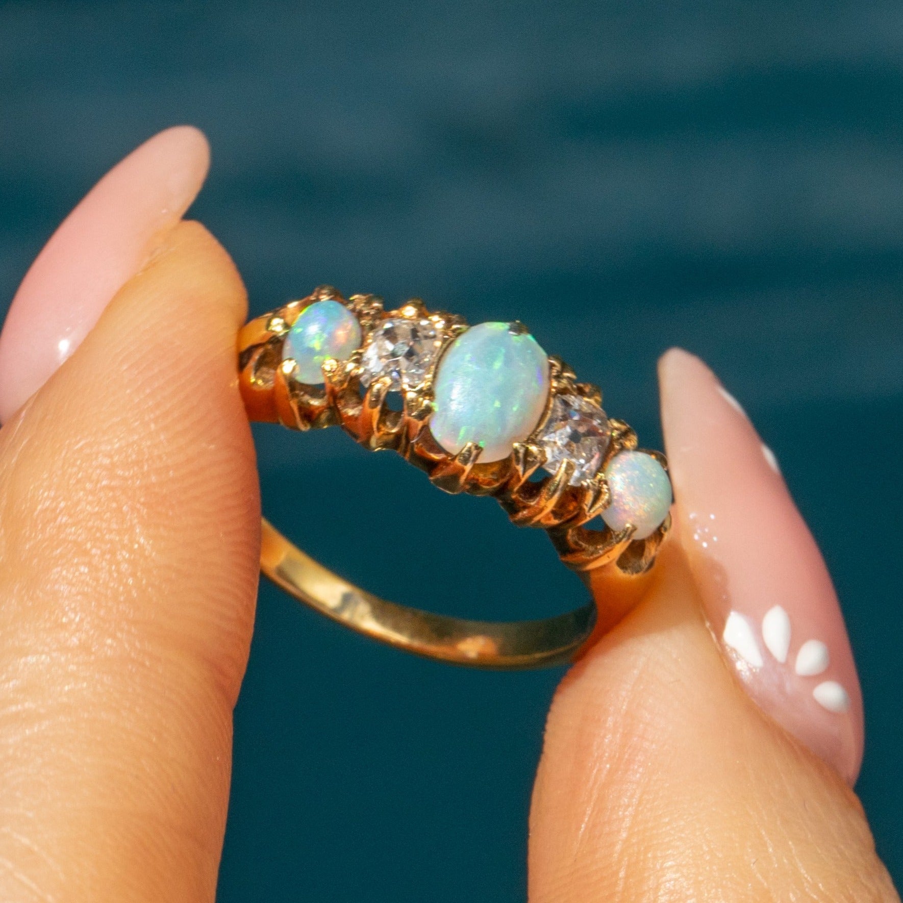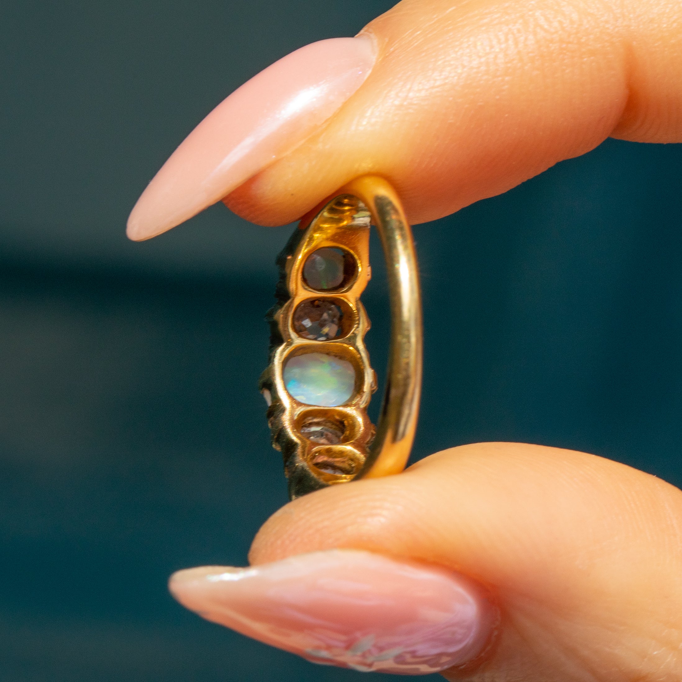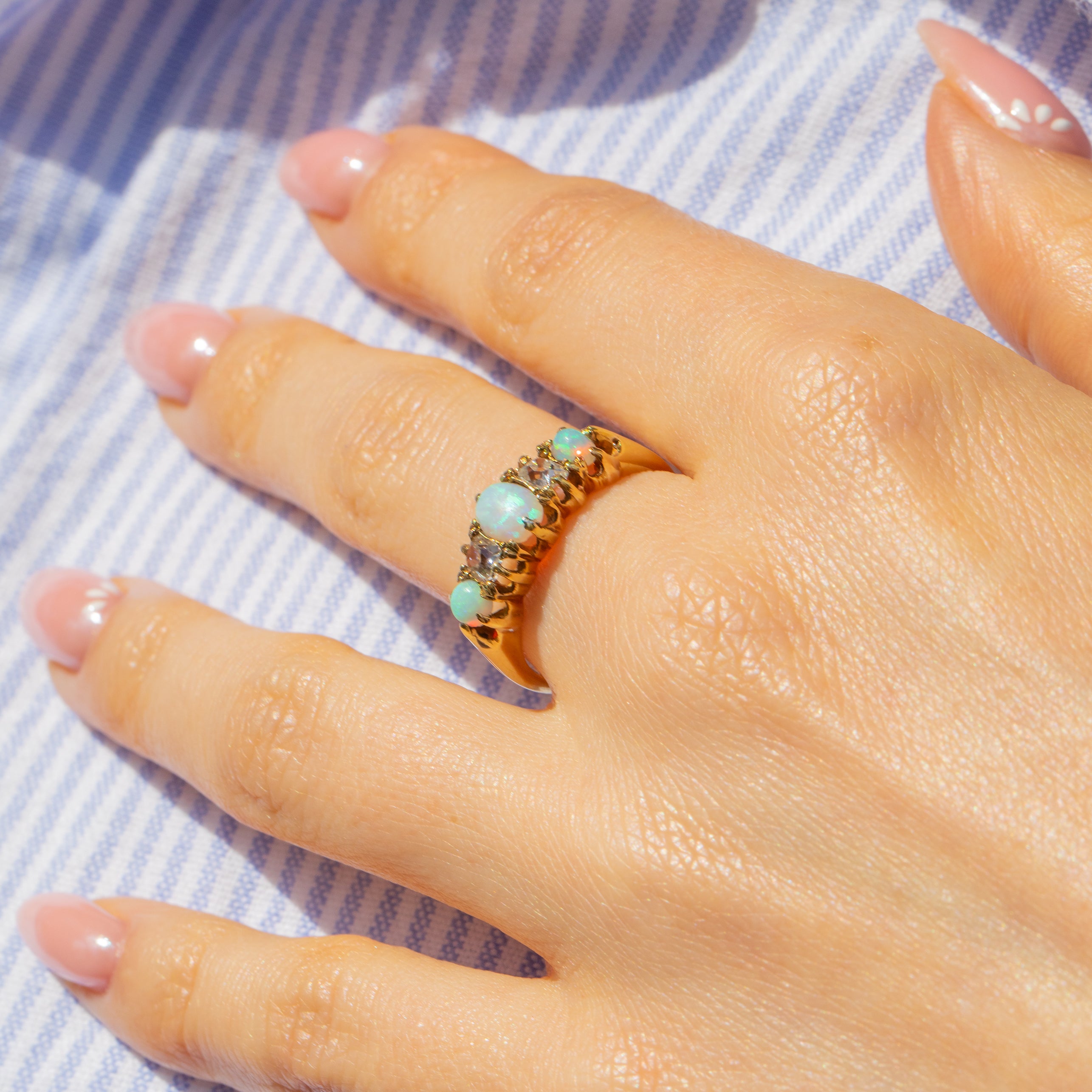 Bague bateau antique en or 15 carats avec opale et diamant, diamant 0,30 ct