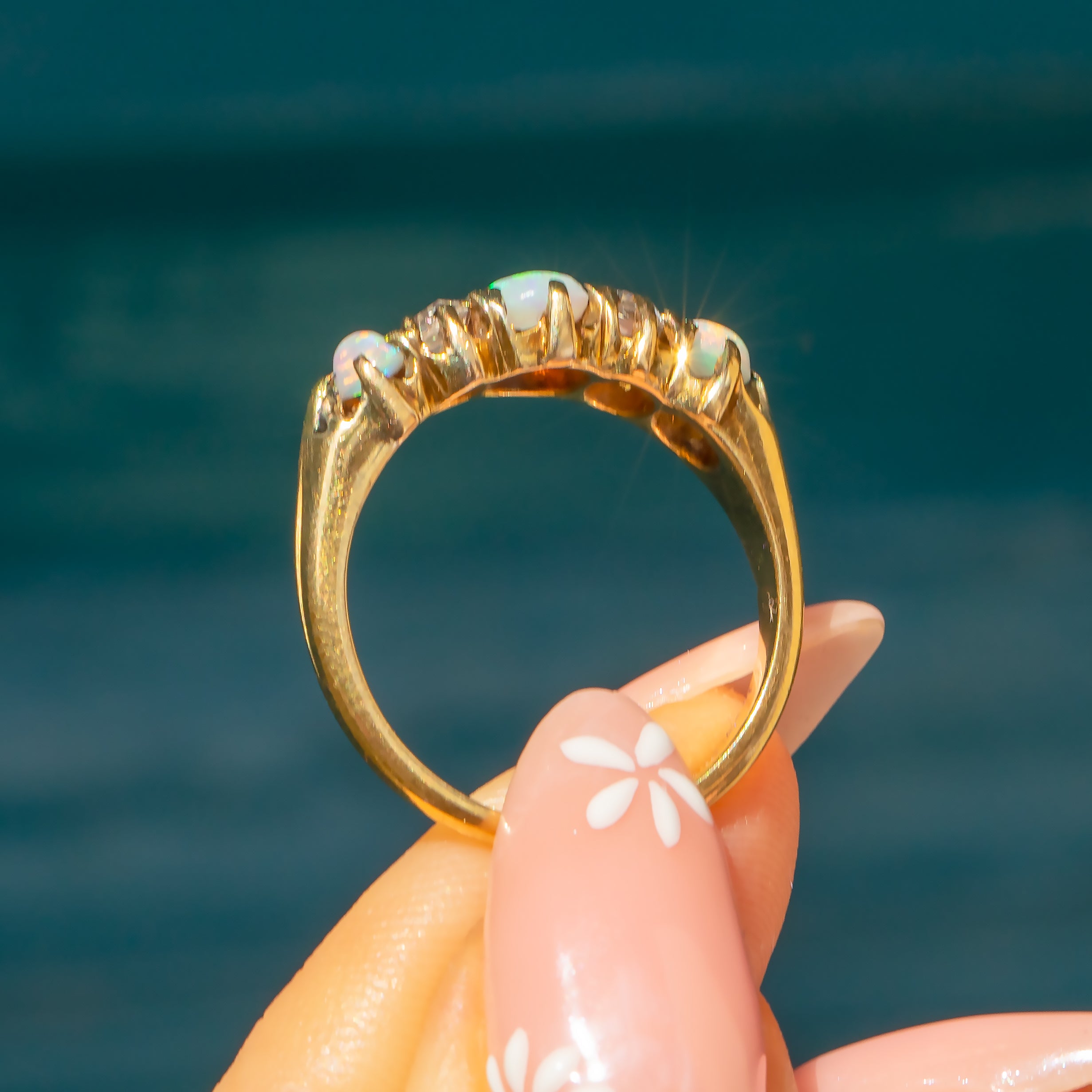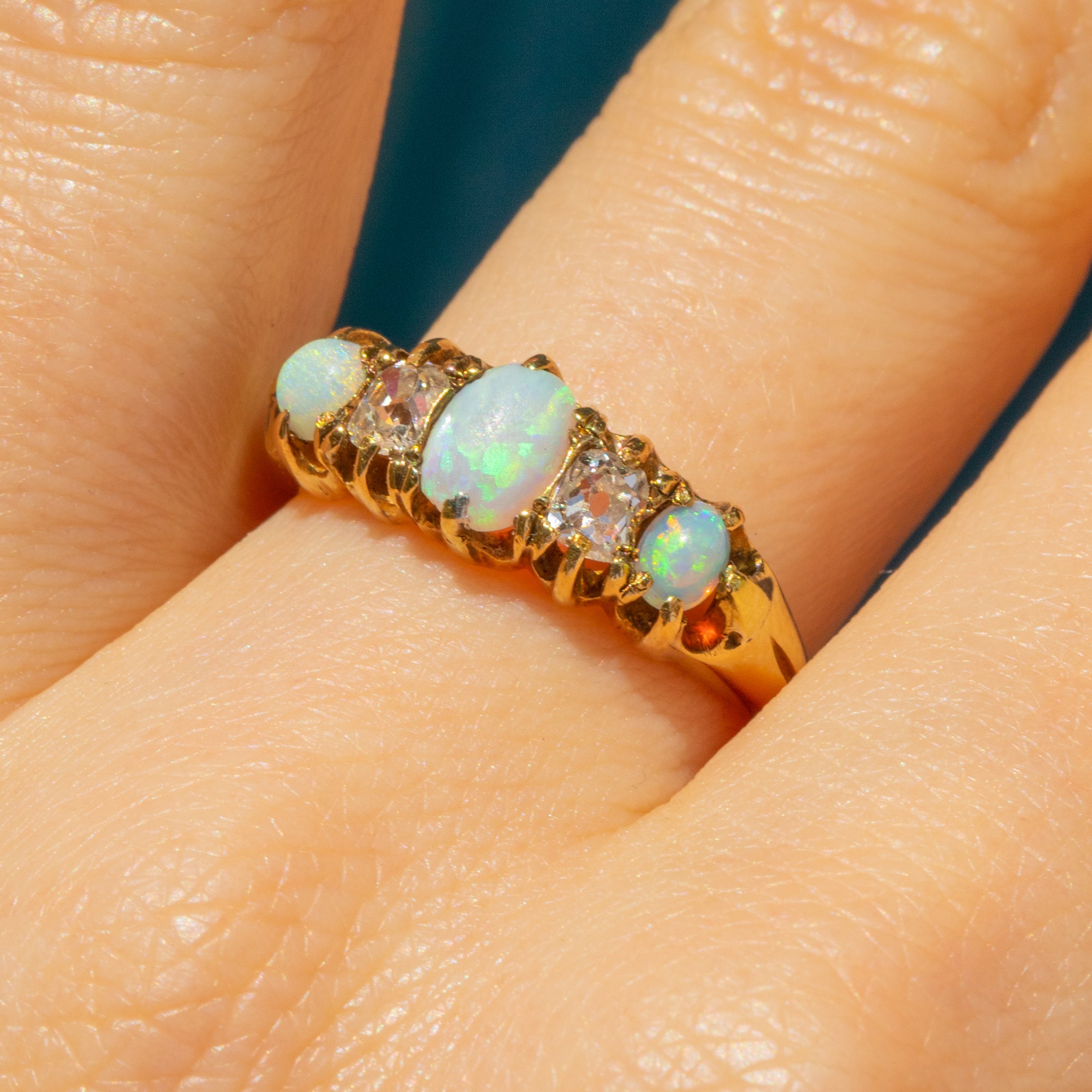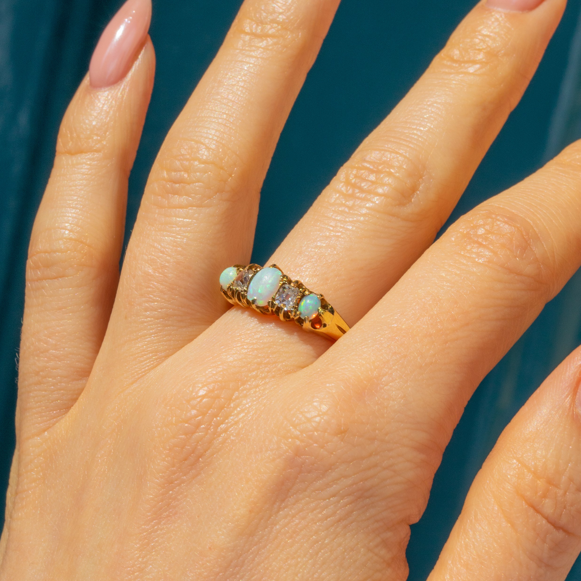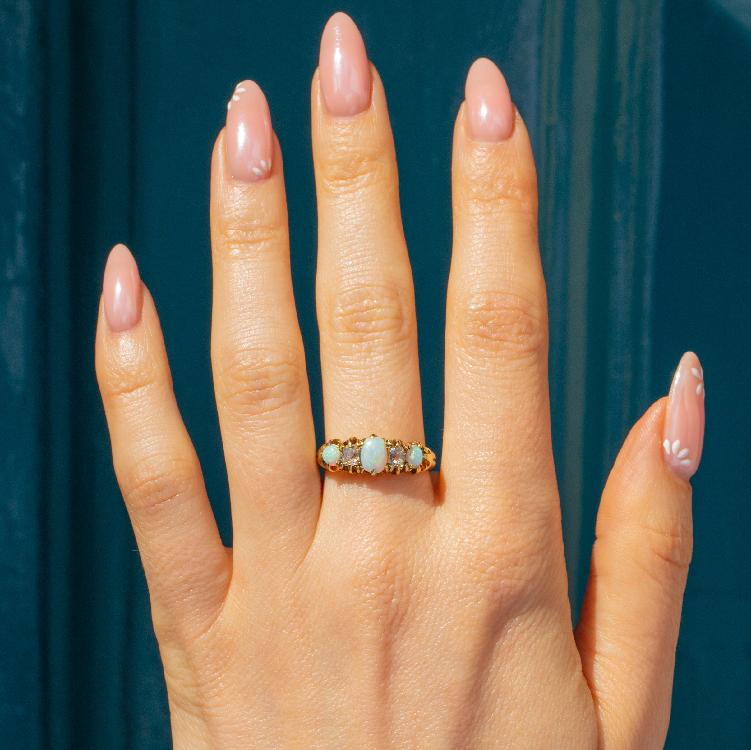 Bague bateau antique en or 15 carats avec opale et diamant, diamant 0,30 ct