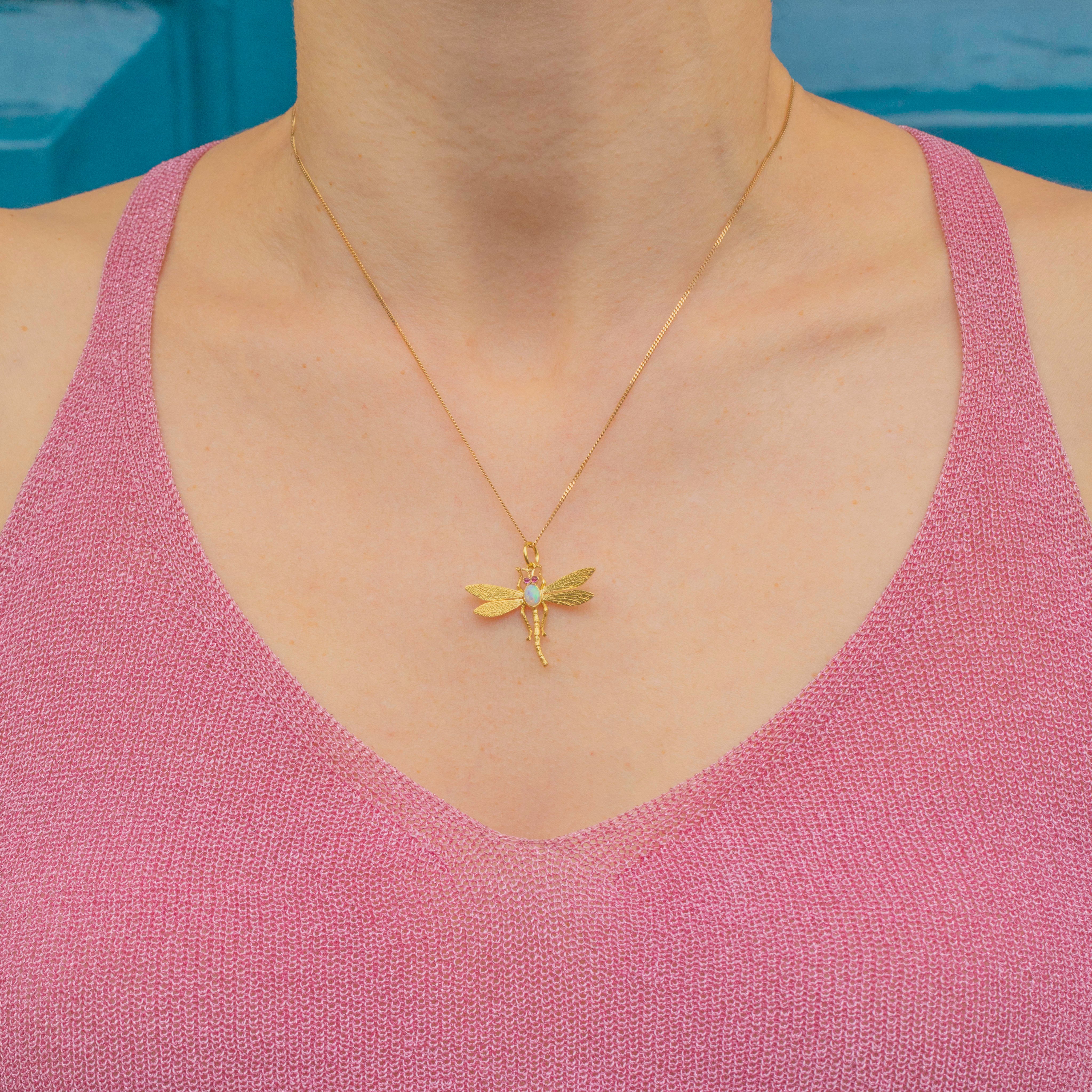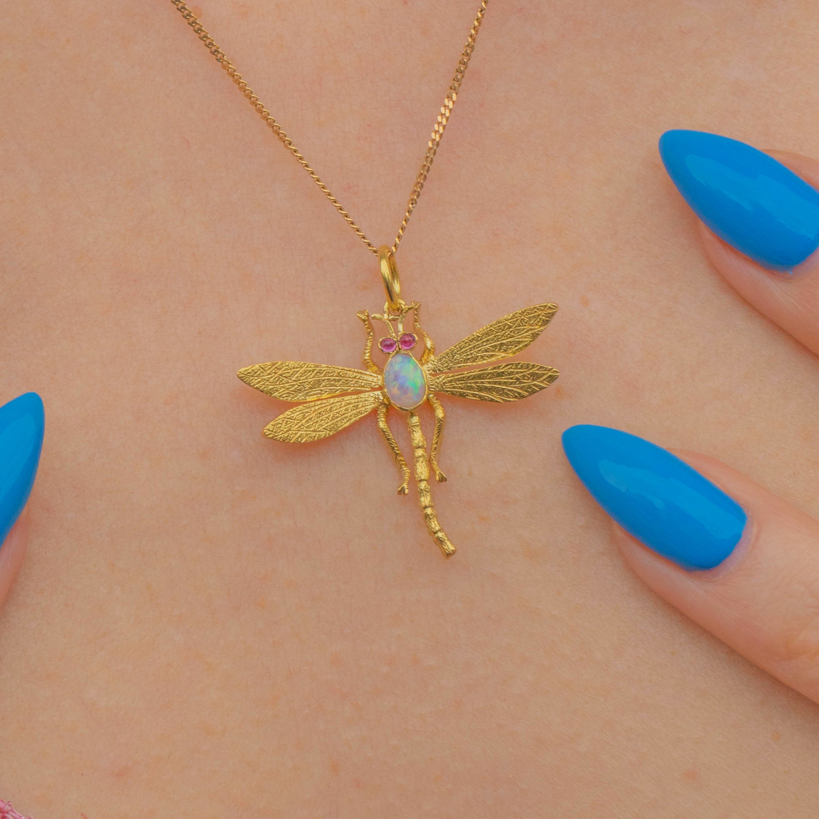 Crafted from radiant 15ct Gold, this delicate dragonfly features an iridescent Opal, radiating a kaleidoscope of soft blues and greens, through to flashes of pink and orange as she captures the light. Her soft hues are contrasted by her fuchsia Ruby eyes, married by the warmth of her glittering Gold wings.