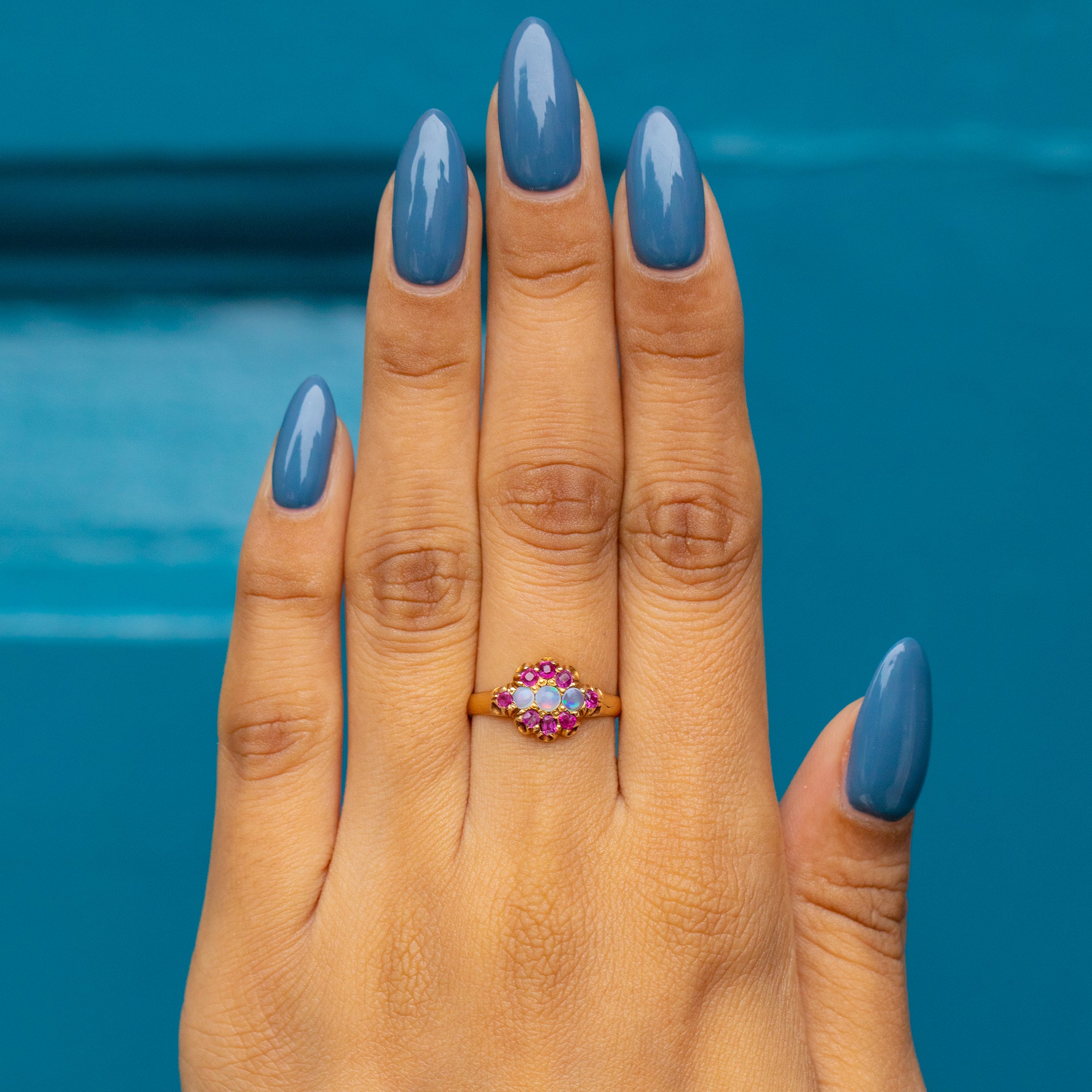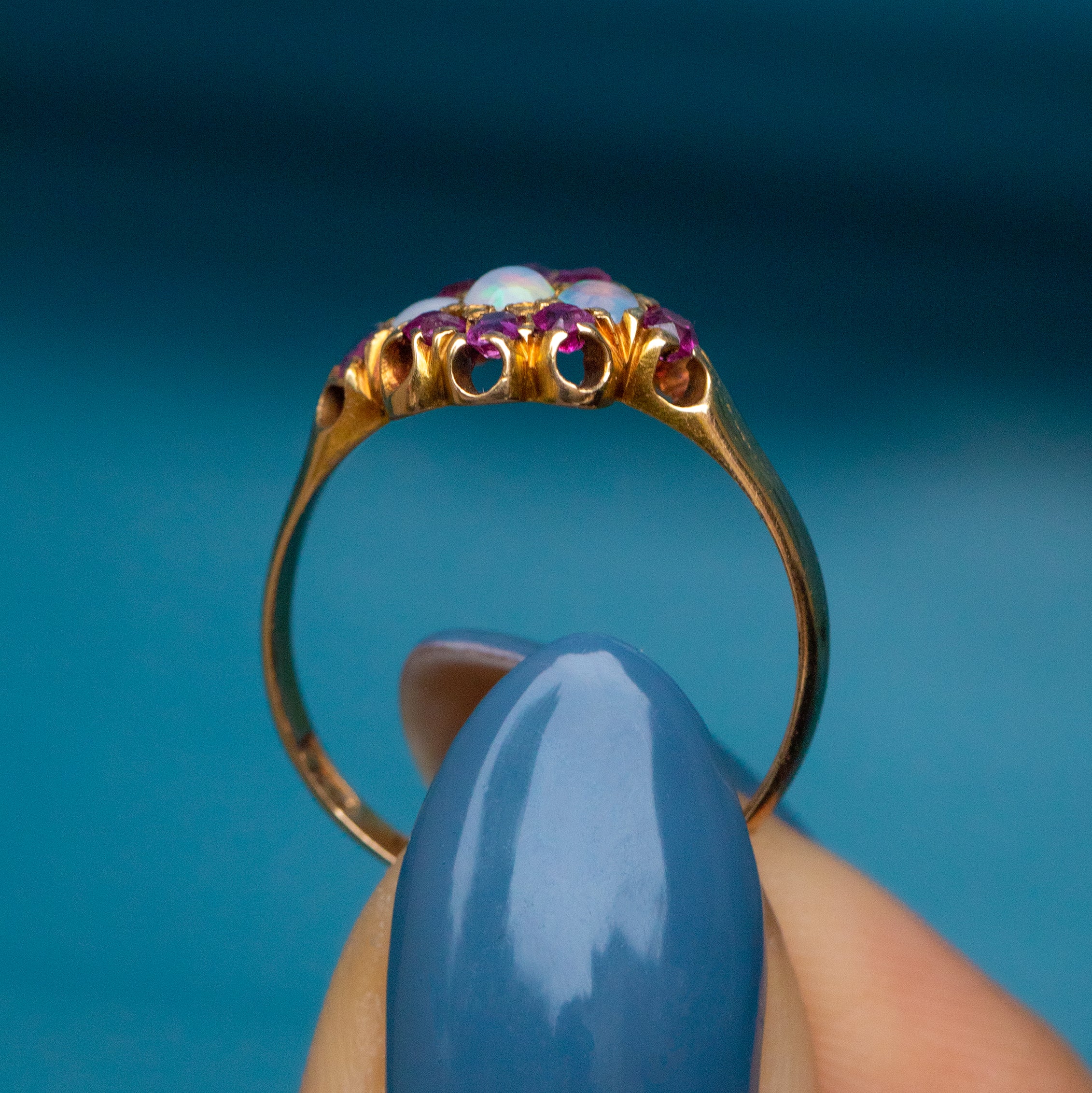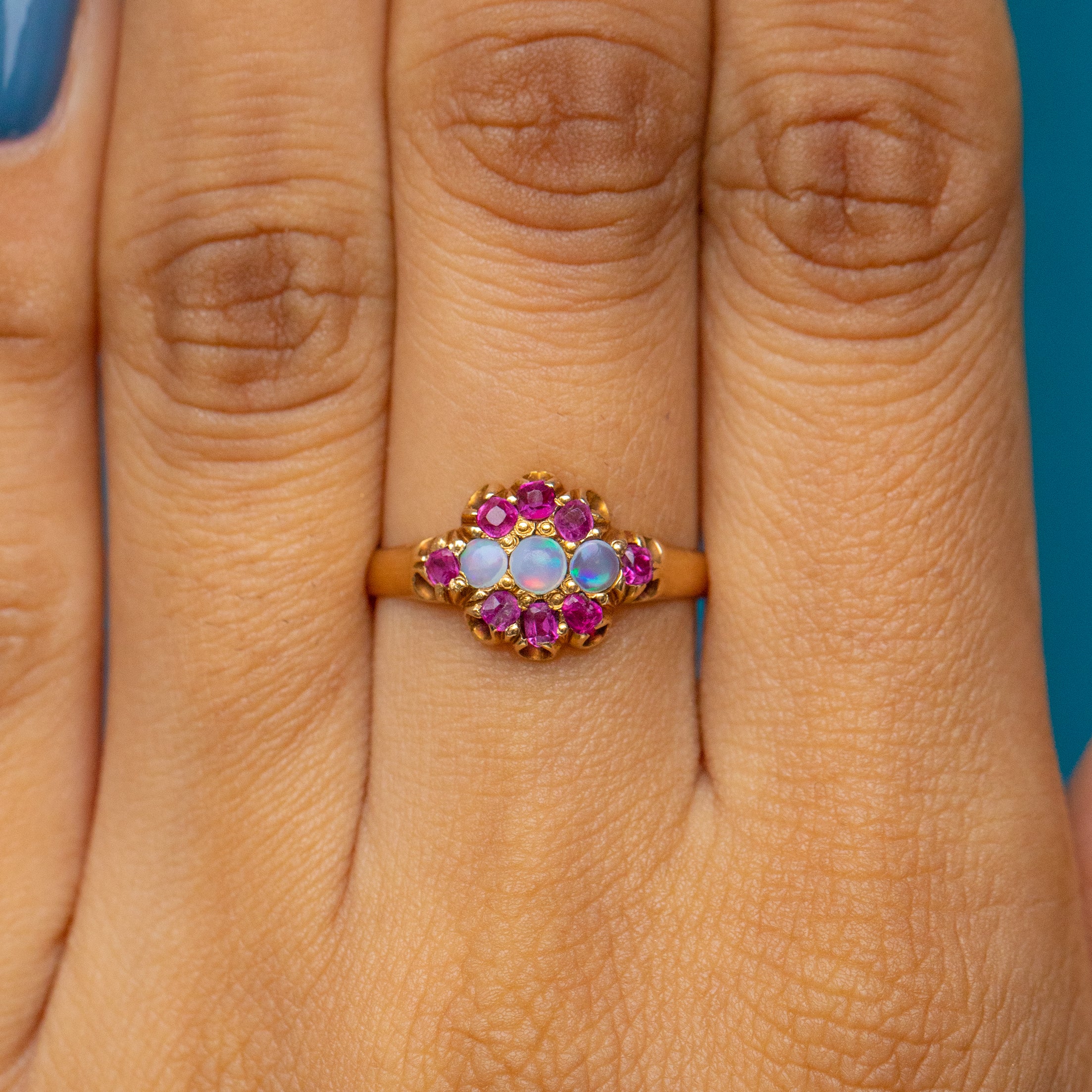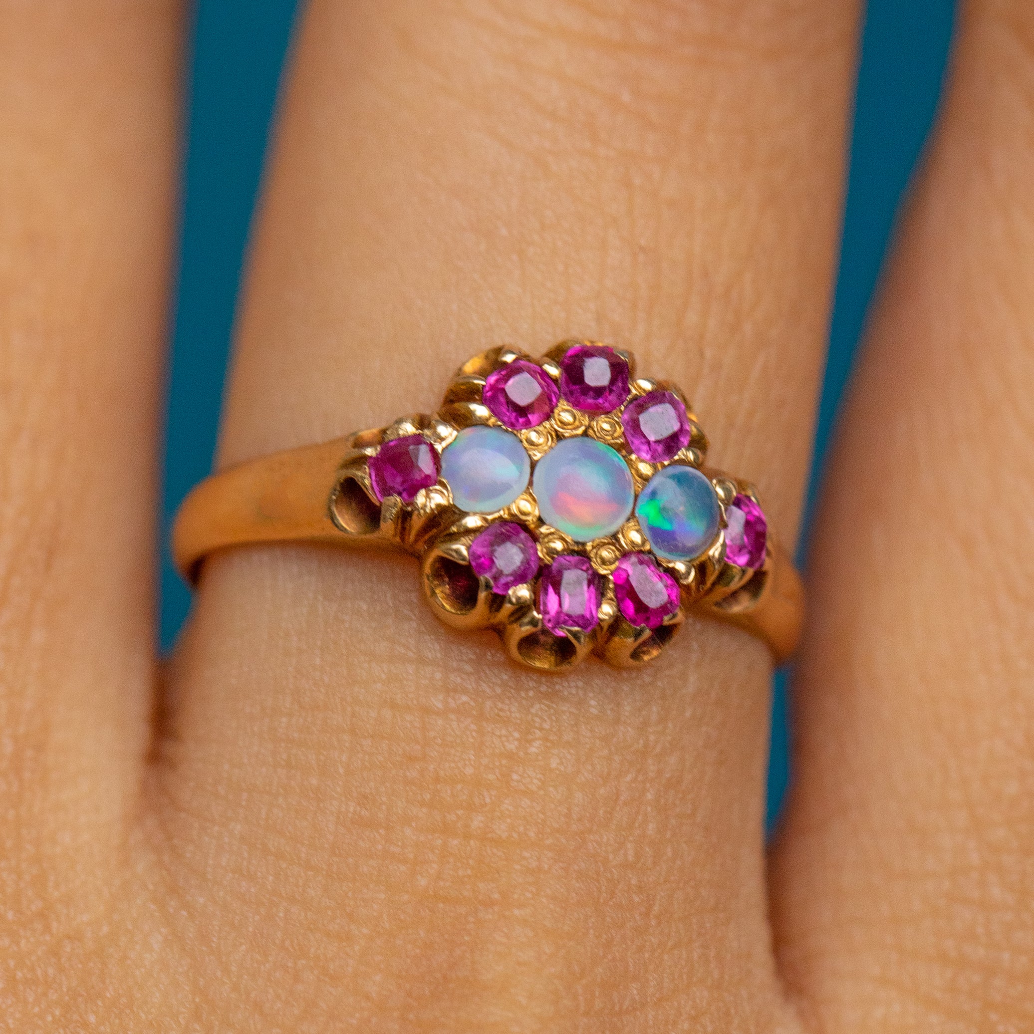 Bague ancienne en or 15 carats avec opale et rubis en grappe, vers 1871
