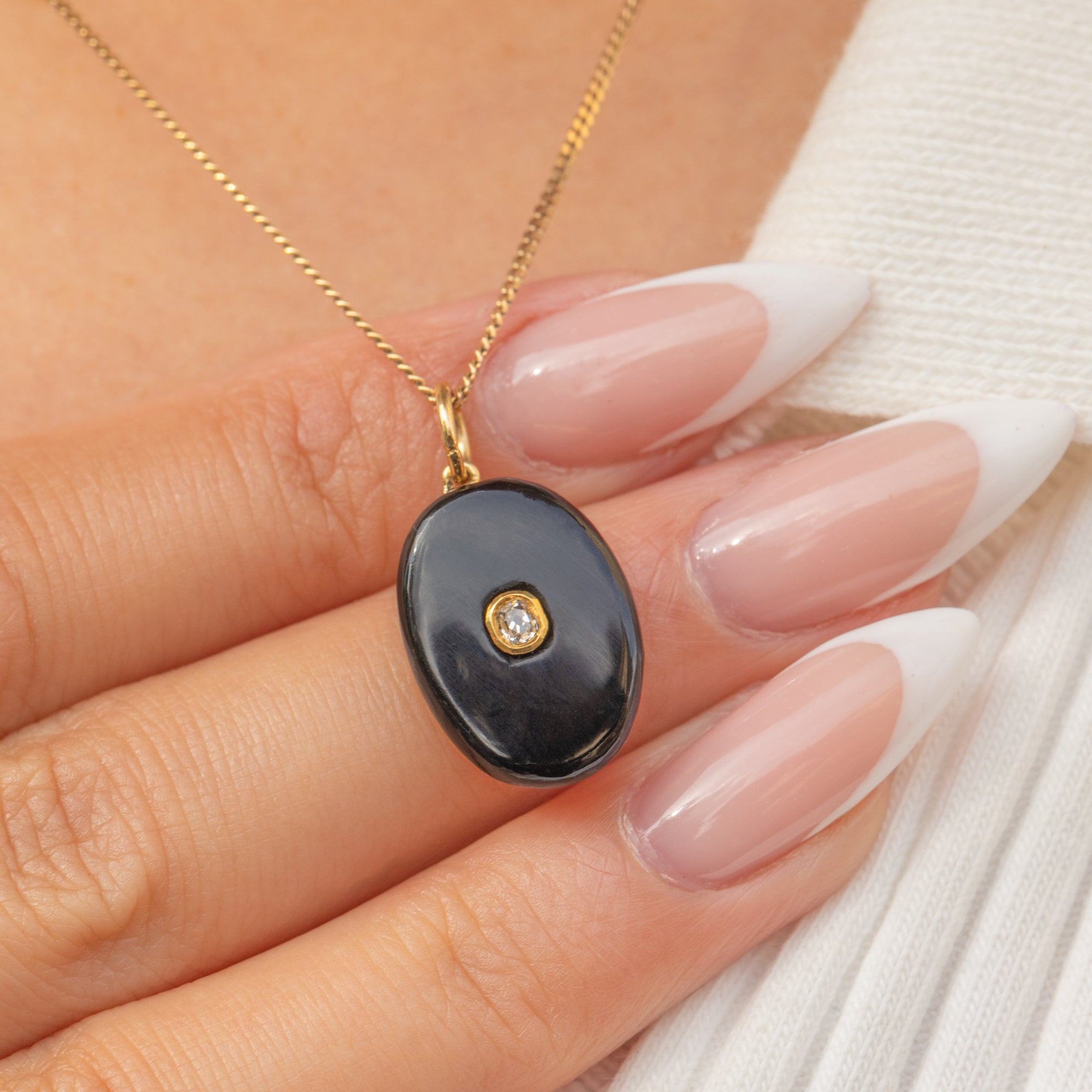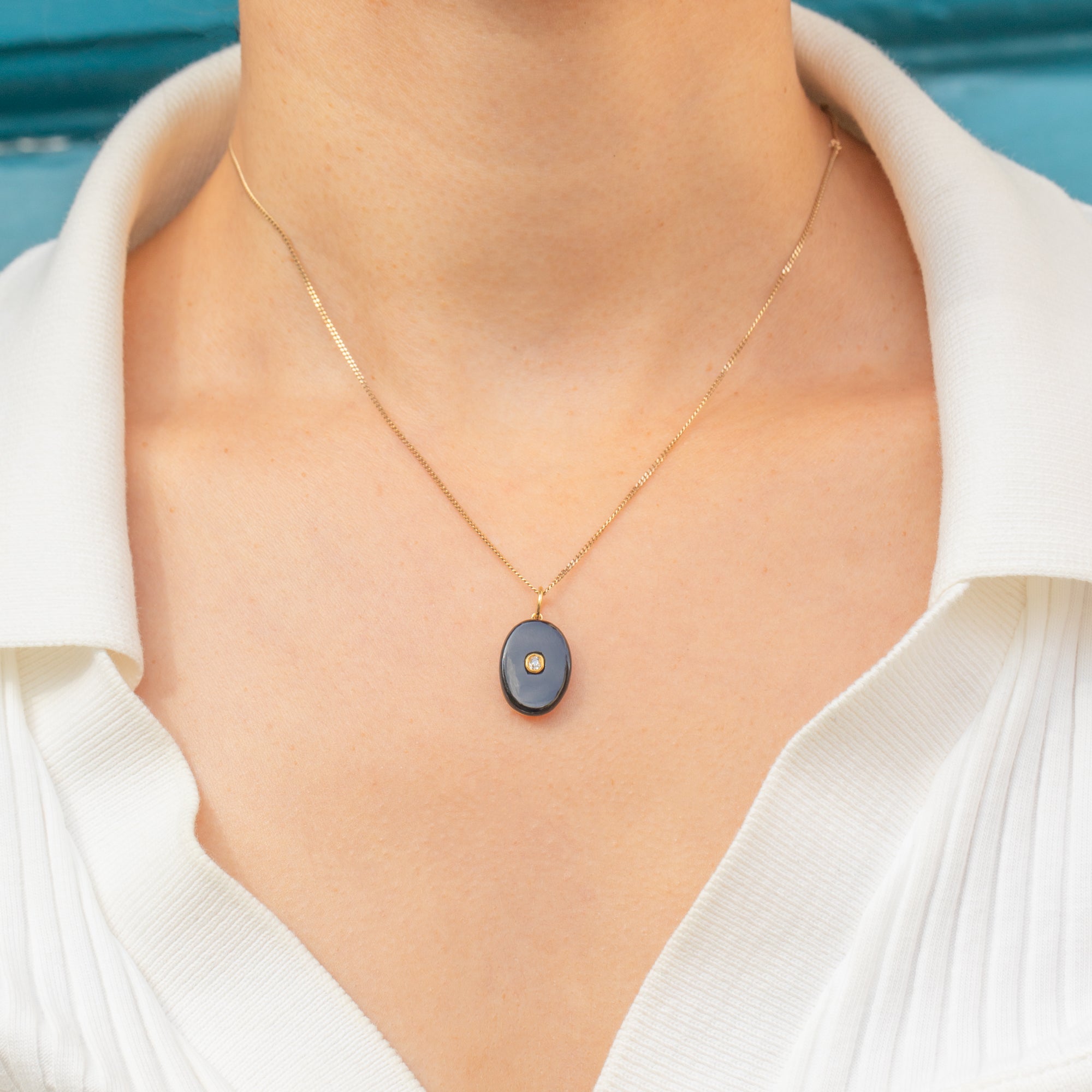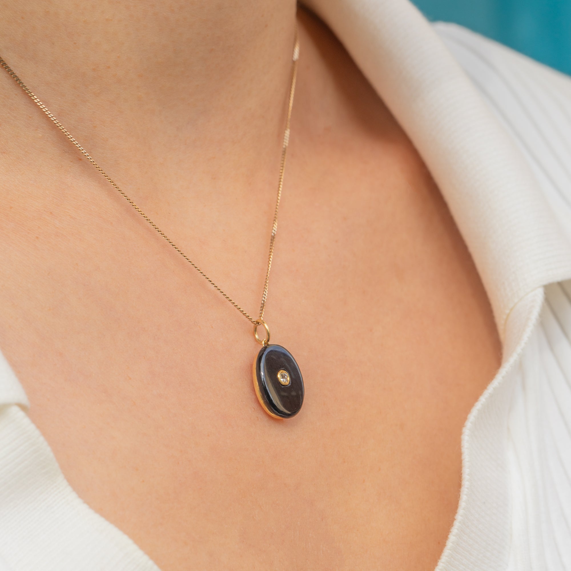 A refined antique charm crafted in 15ct Gold, set with a smooth oval cabochon of deep black Onyx. At its centre glitters a single Diamond, adding a sparkling accent to the bold, minimalist design. Oval Onyx and Diamond combinations were highly prized in the late 19th and early 20th centuries, making this piece a versatile addition to any antique charm or pendant collection.
