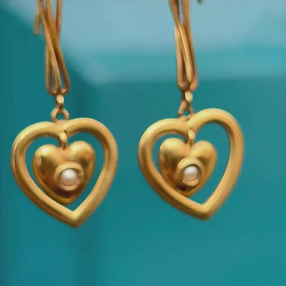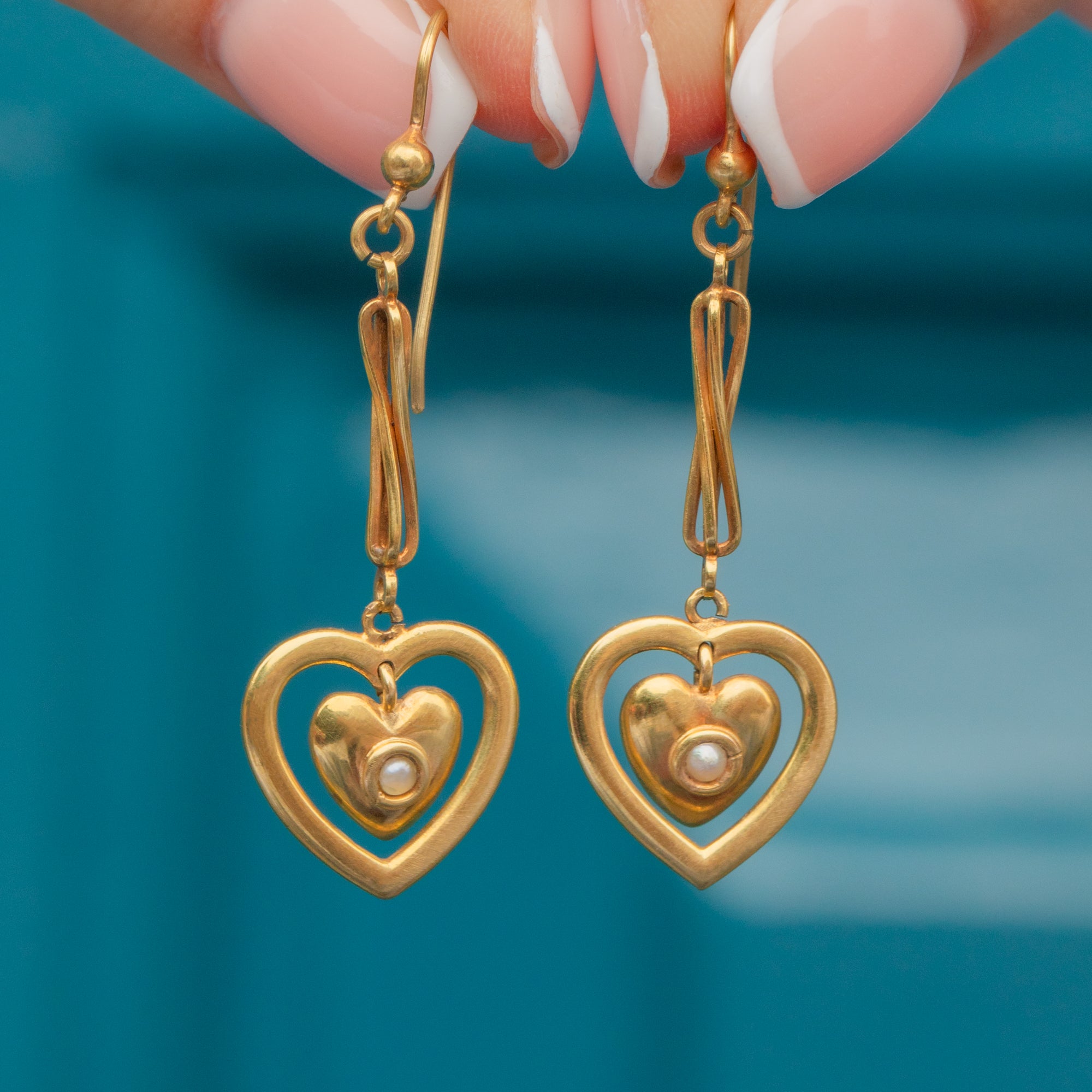 These antique 15ct Gold Pearl heart drop earrings are a pair of sweethearts! With a heart drop falling at the bottom, each one is studded with a single shimmering Pearl for a feminine finish.