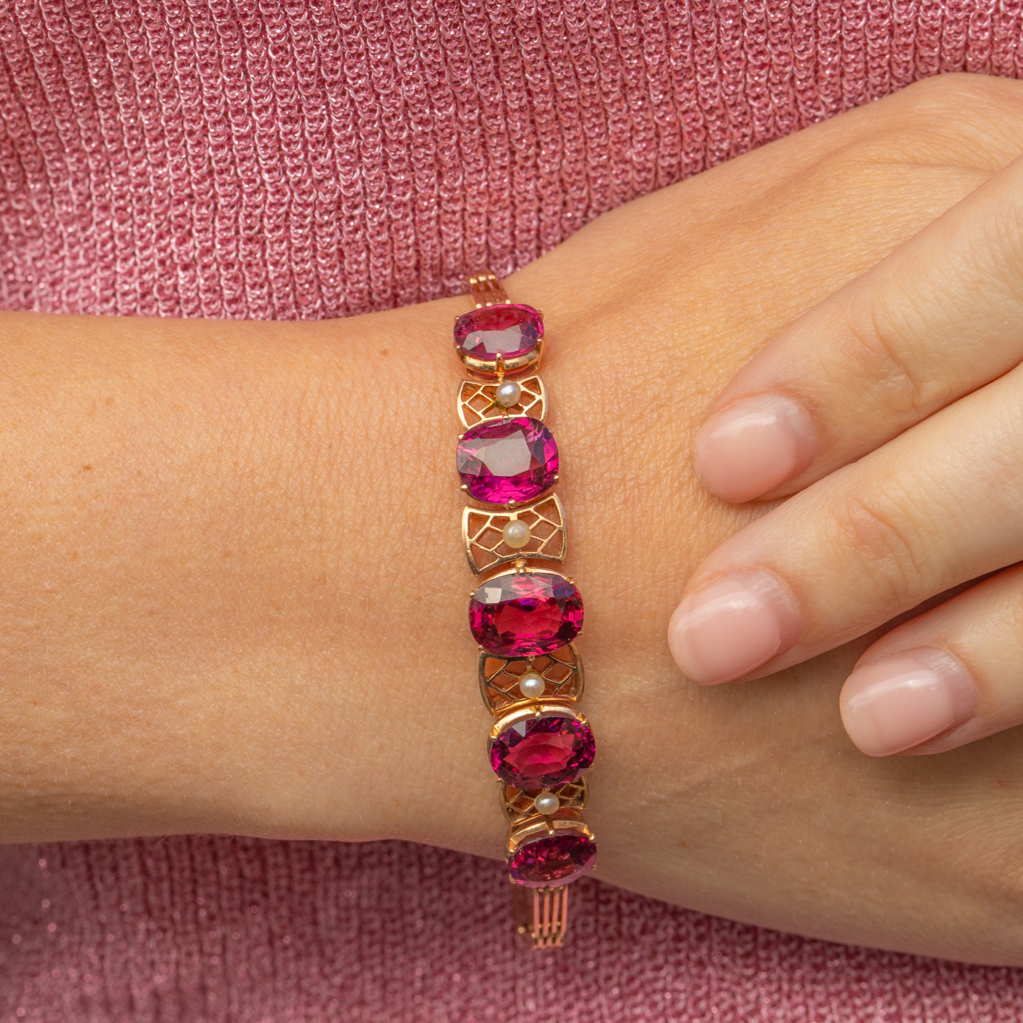 Discover the epitome of luxury with this antique 15ct Gold pink Tourmaline Pearl bracelet! Adorning her front are five exquisite graduating Tourmaline flaunting vibrant magenta hues, with a combined carat weight of 8.00ct and accompanied by lustrous Pearls set amongst geometric Gold work links.