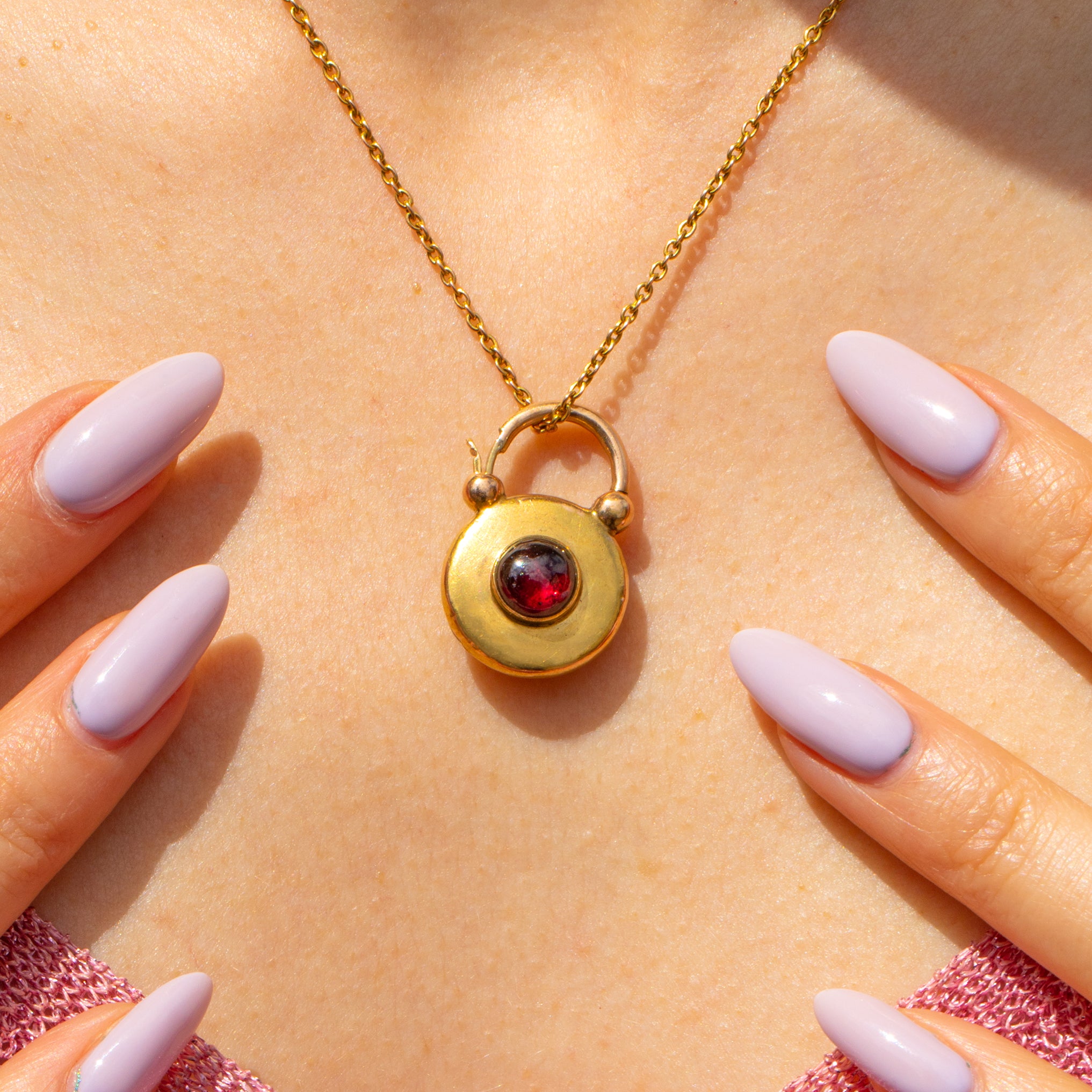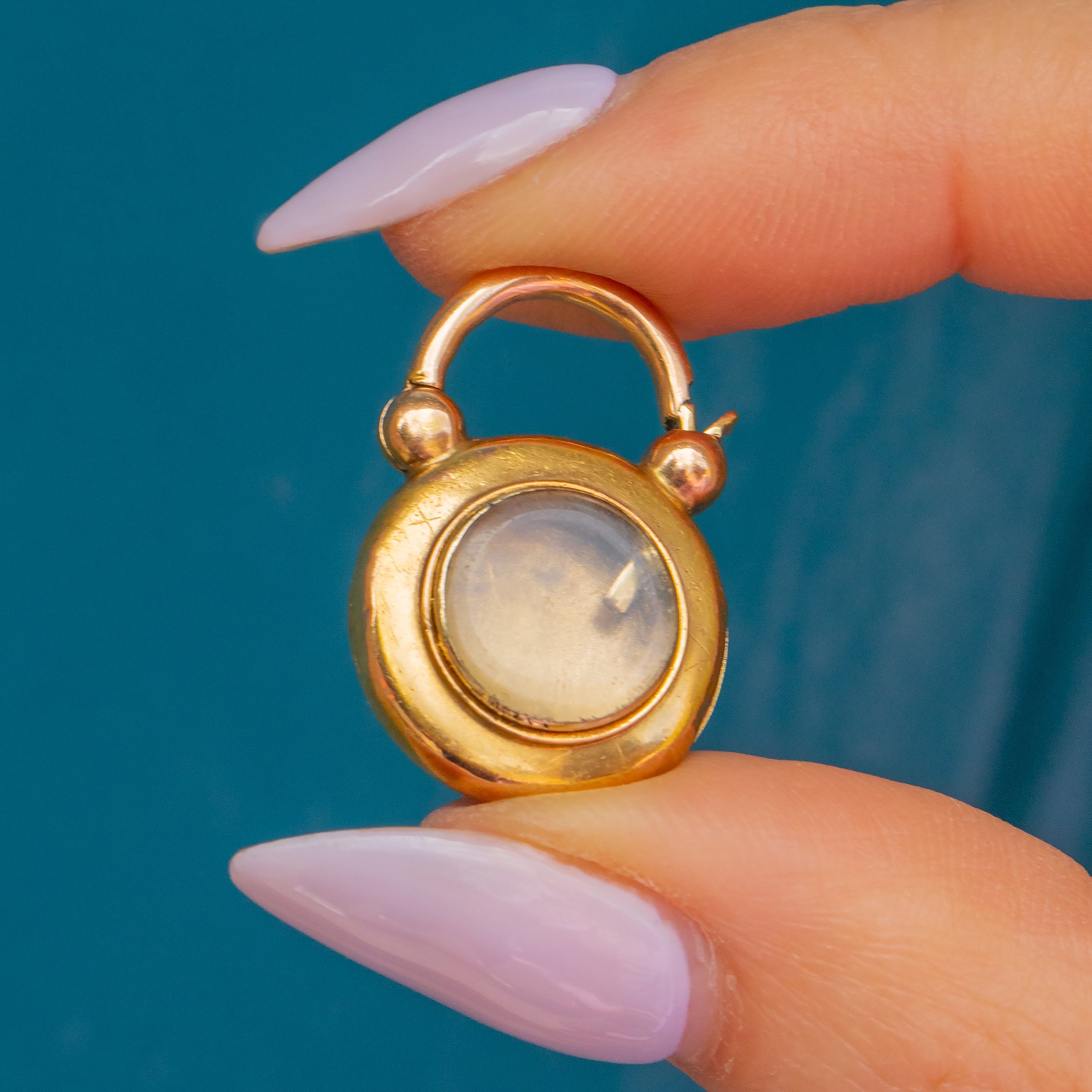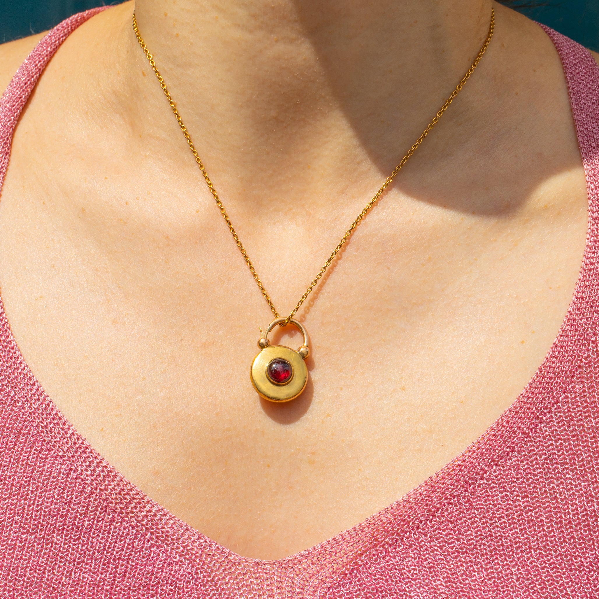 Turn her over to reveal her glass pane, allowing you to wear her on either side depending on your mood. With a lock that can double up as a characterful bale, you can suspend this Victorian Garnet padlock from any chain!