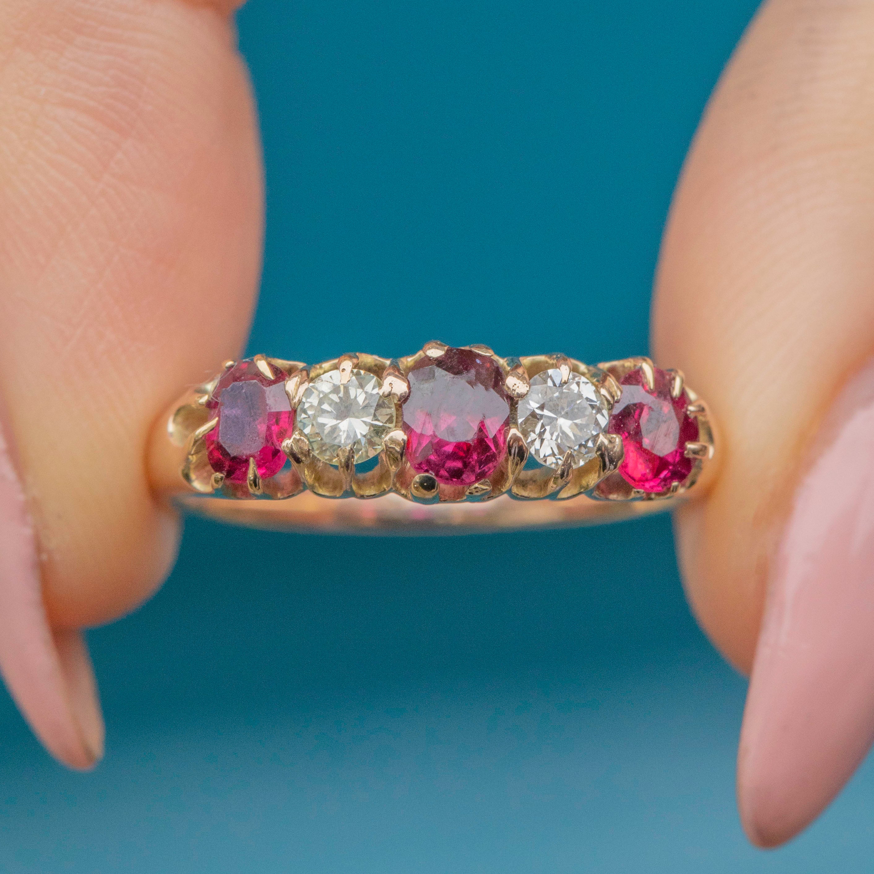 EXCELLENT. This antique 15ct Gold Ruby Diamond five stone ring is in fabulous condition throughout. The 15ct Gold band feels substantial and sturdy, and all of the gemstones are secure in their settings. The Diamonds and Rubies are exceptionally bright and twinkling - a visionary piece!