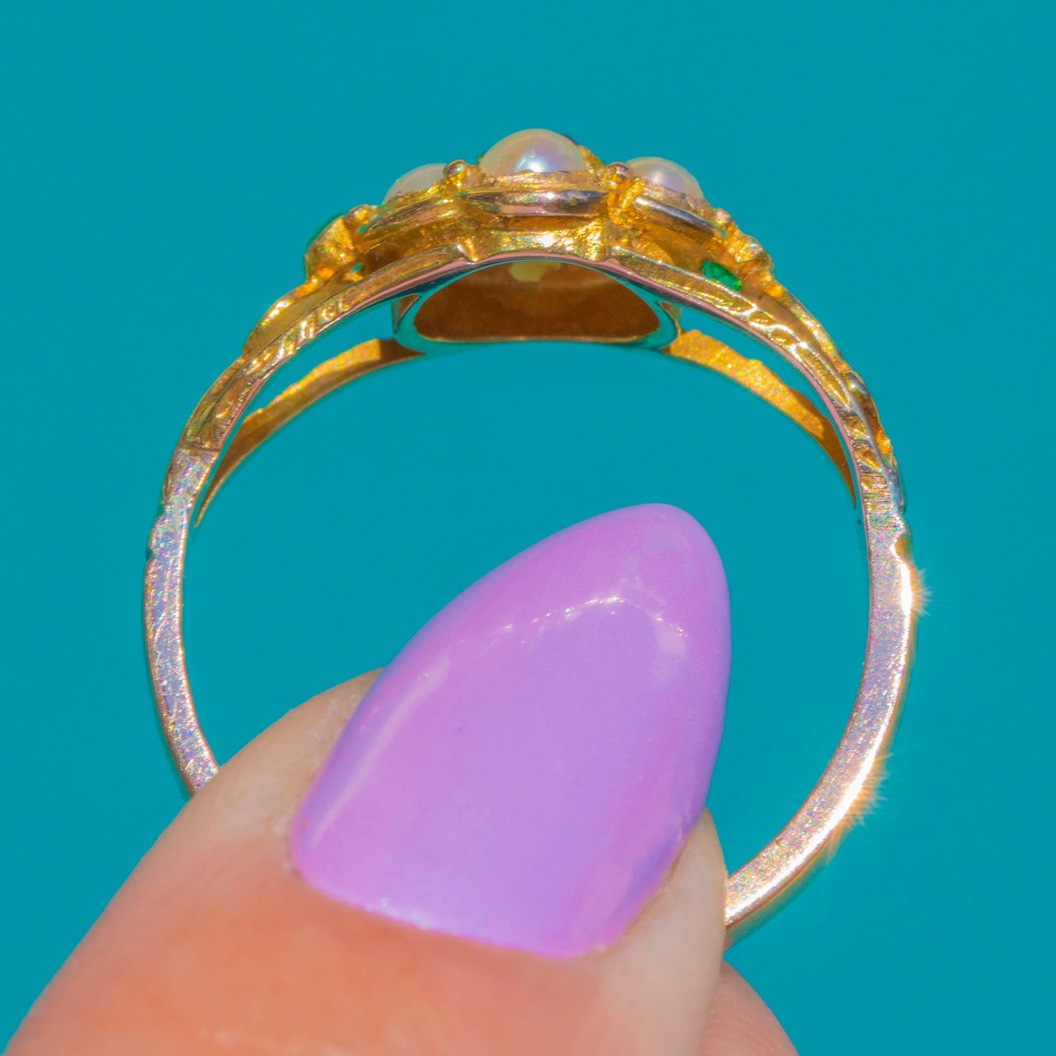 EXCELLENT: Gemstones are bright with no eye-visible chips and minimal facet wear; Pearls are well matched and secure. The setting, engraved shoulders and shank are in excellent condition with light surface wear consistent with age. No obvious signs of resizing or restoration, and the ring presents beautifully.