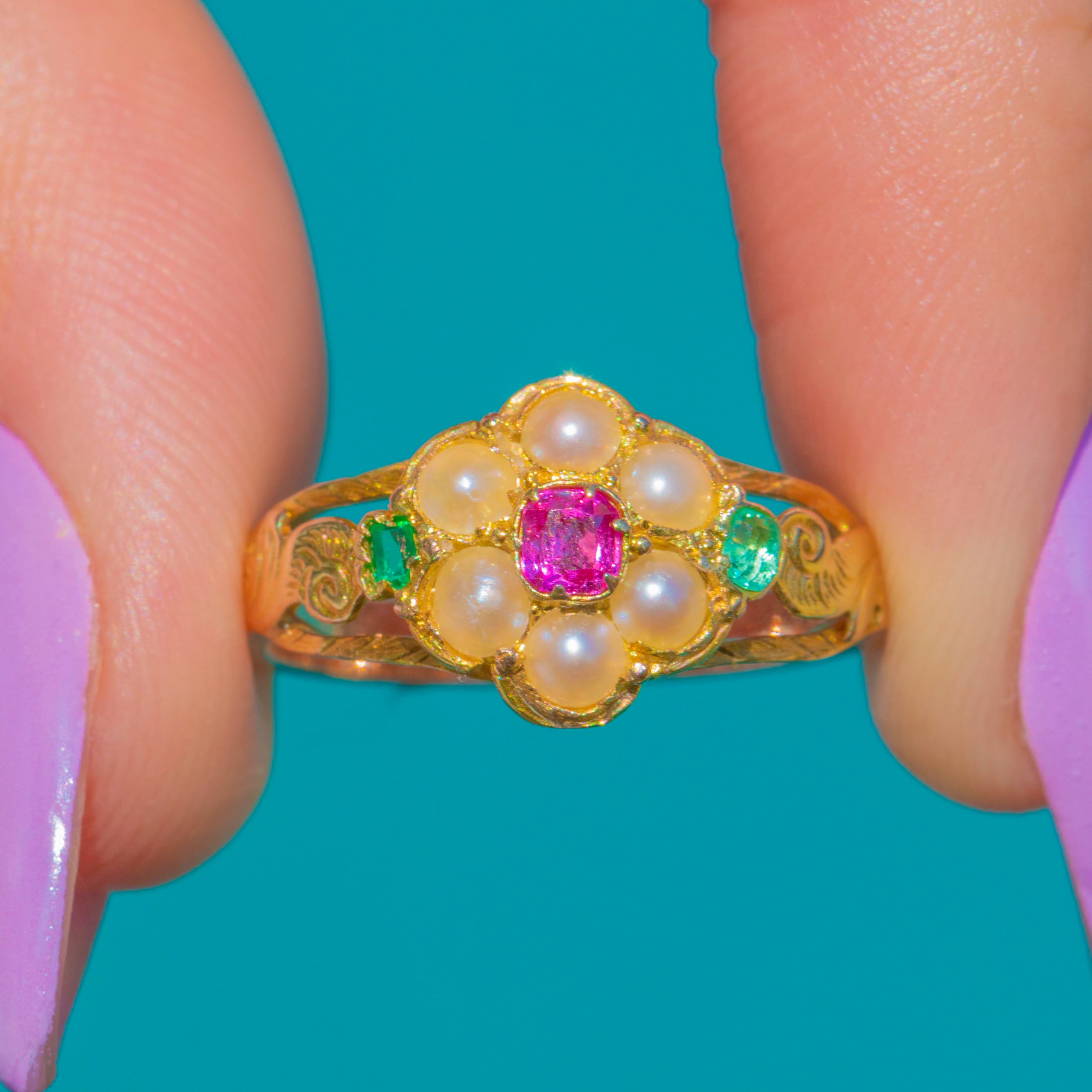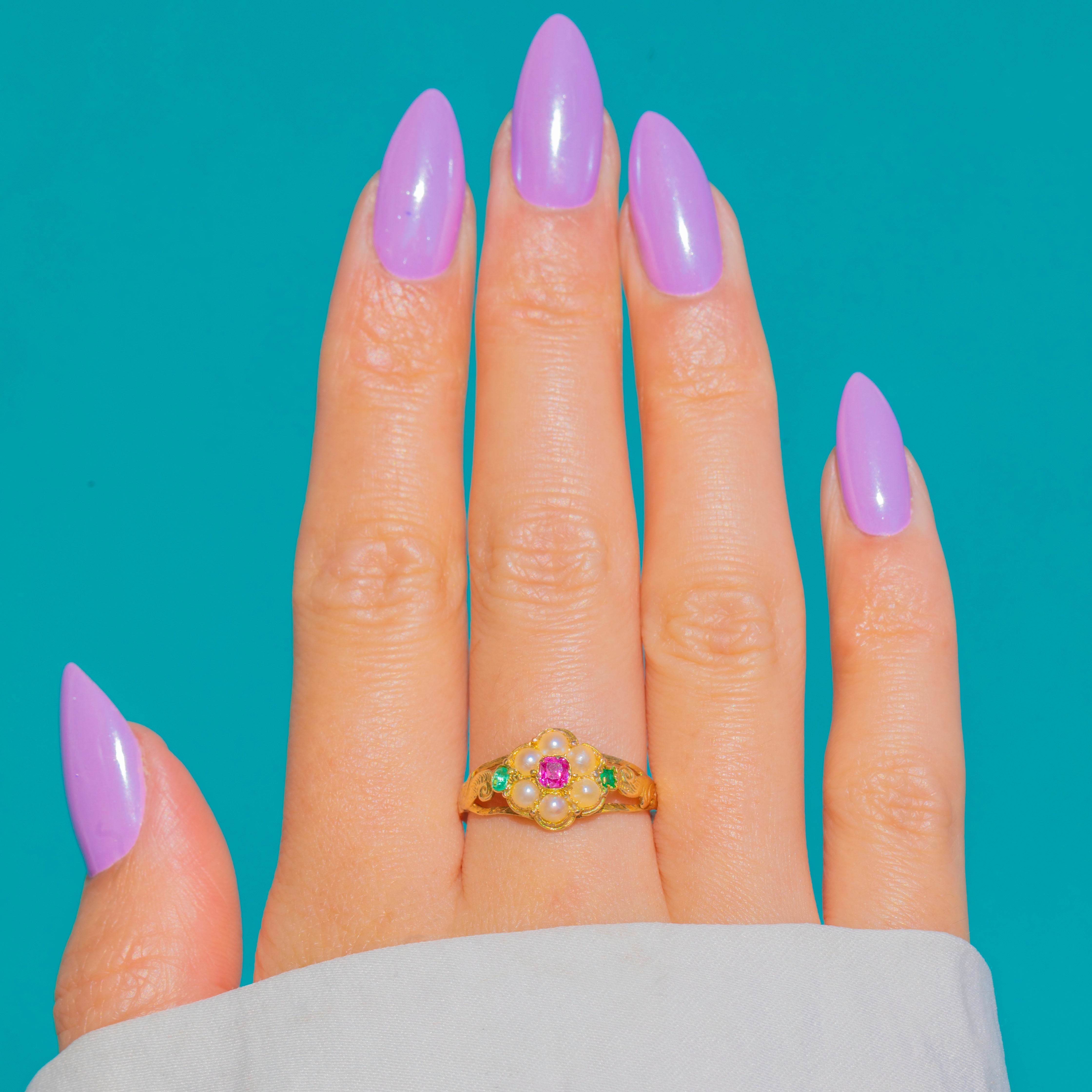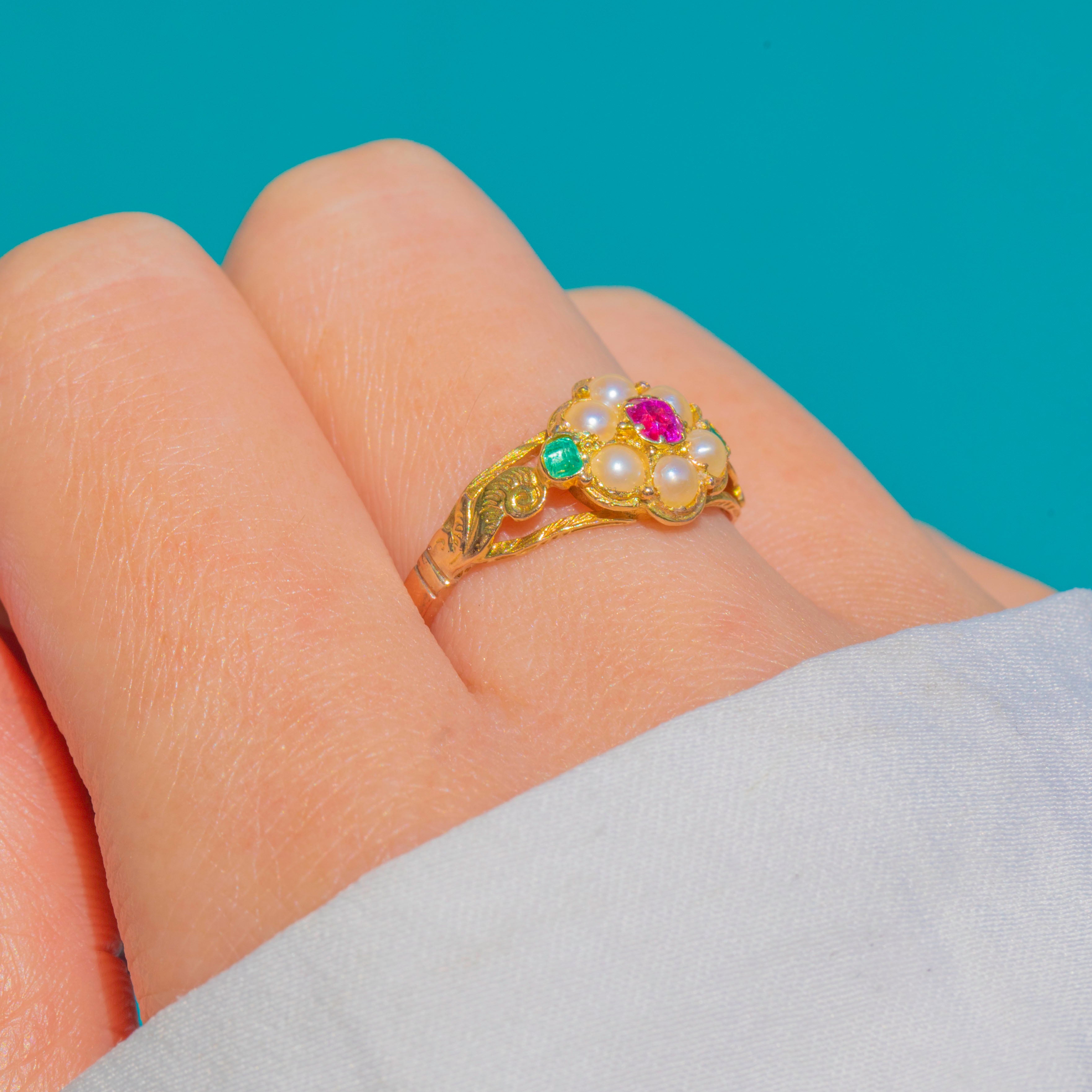 Blooming with Victorian charm, this 15ct Gold flower ring showcases a rosy Ruby at the heart of a petite halo of luminous Pearls, flanked by bright Emerald accents at the shoulders. The cluster sits gracefully in a raised, multi-part setting that brings a delicate play of light to the gemstones.