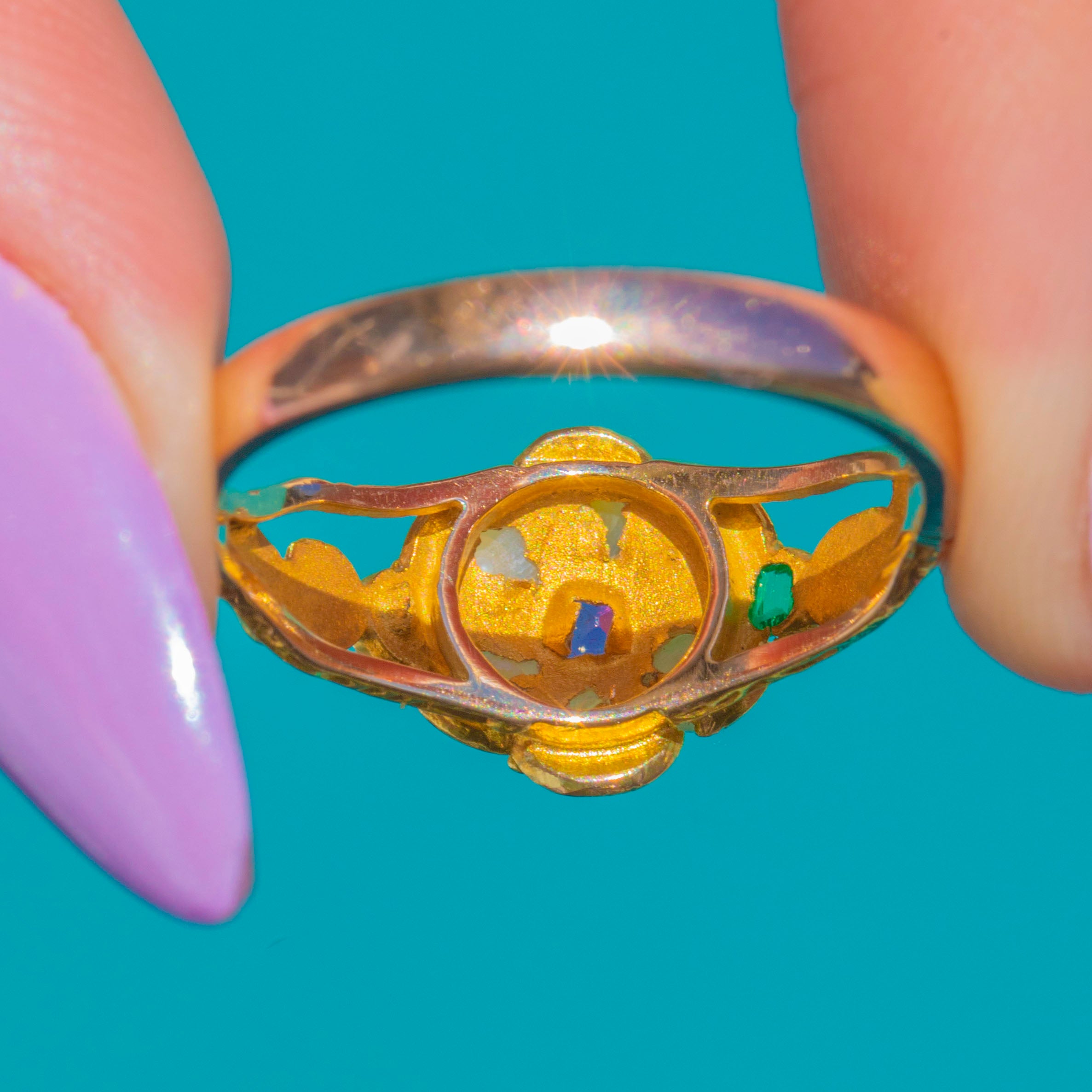 Beautiful hand-engraved foliate shoulders and an open, pierced gallery add airy refinement and craftsmanship, while the warm glow of 15ct Gold flatters the romantic palette of pink, green and creamy white. Dainty yet distinctive, it’s a lovely antique jewel to treasure and wear with ease.