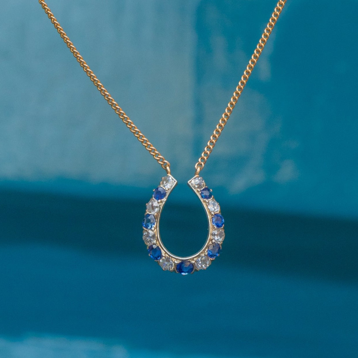 Her horseshoe is suspended from a fine chain, which provides security but also allows for her cluster of Diamonds and Sapphires to remain the star of the show. At 18 inches, this Sapphire Diamond necklace falls centrally against your décolletage, perfect for accompanying any formal evening attire!