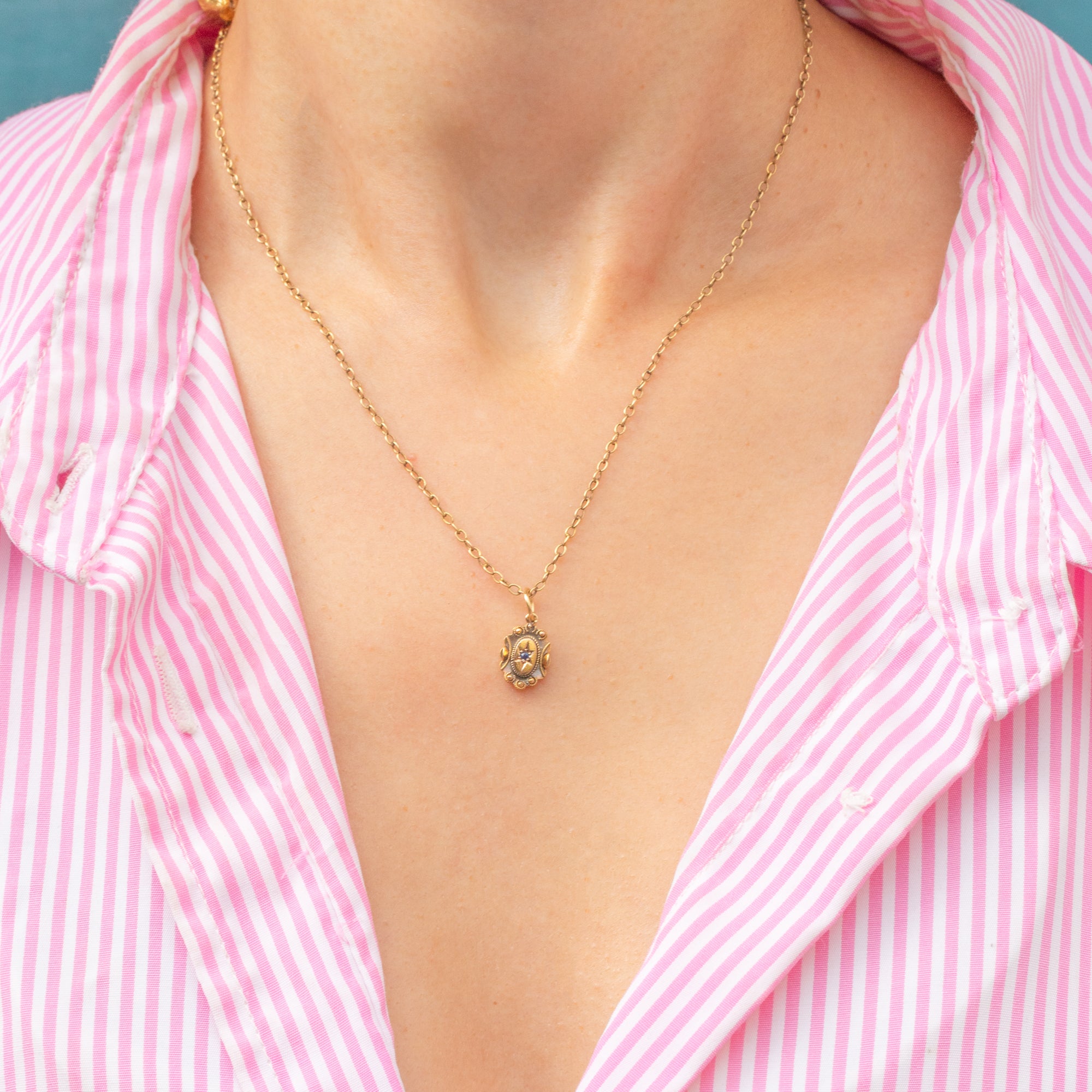 A star-set Sapphire takes centre stage, adorned with typical Etruscan detailing to create a striking adornment for a skinny Gold chain.
