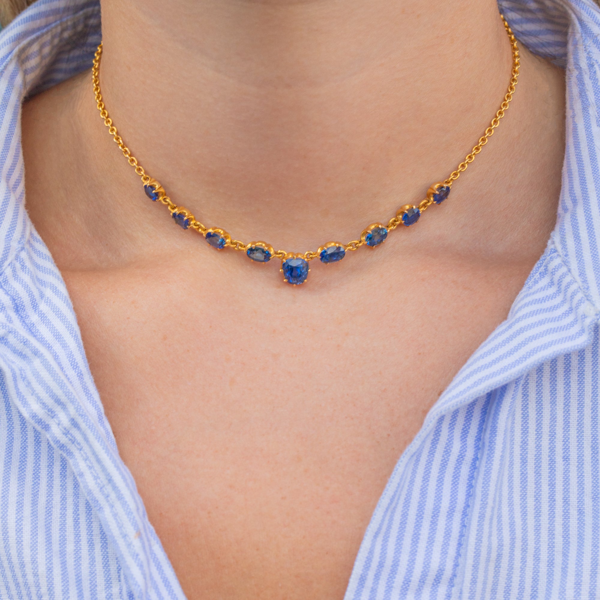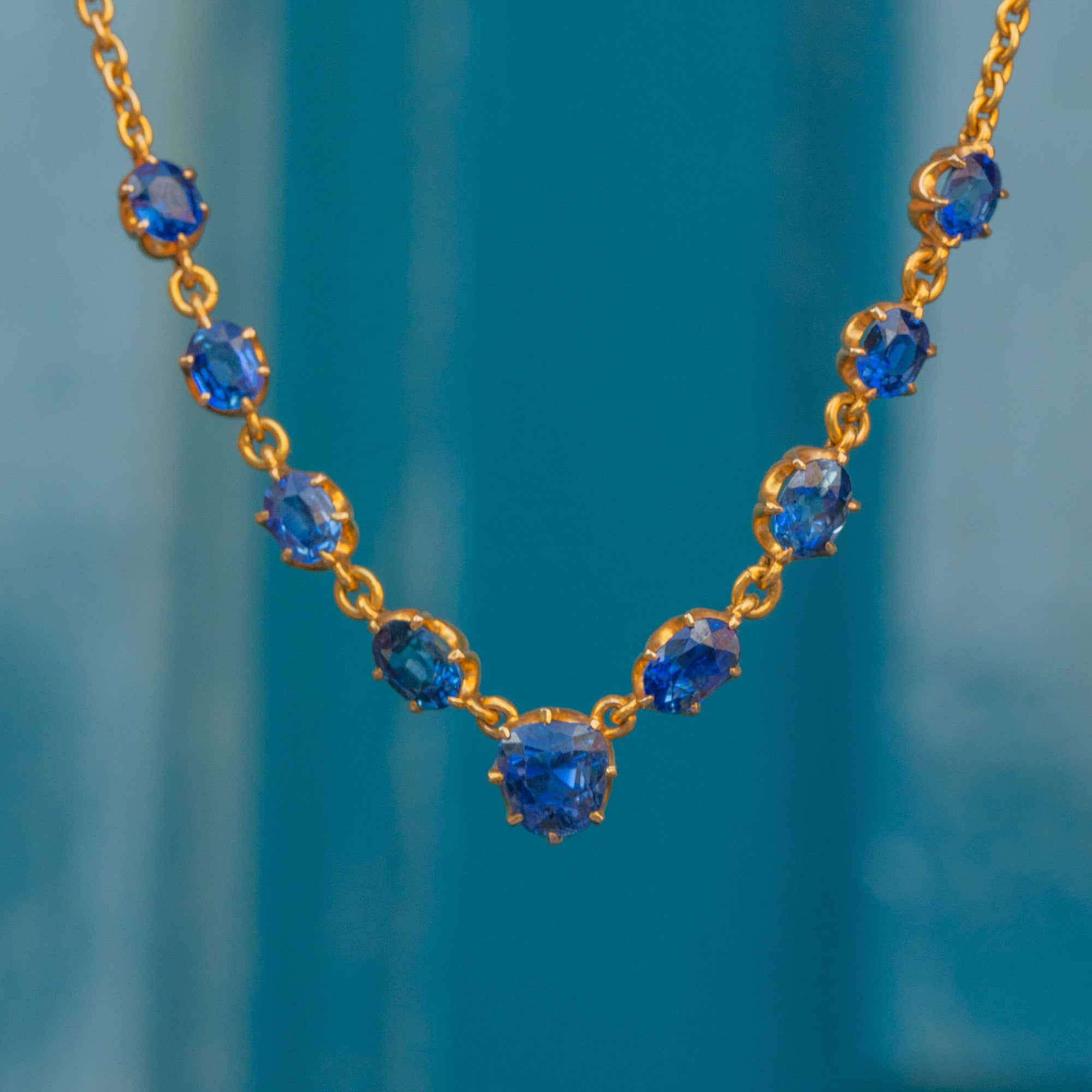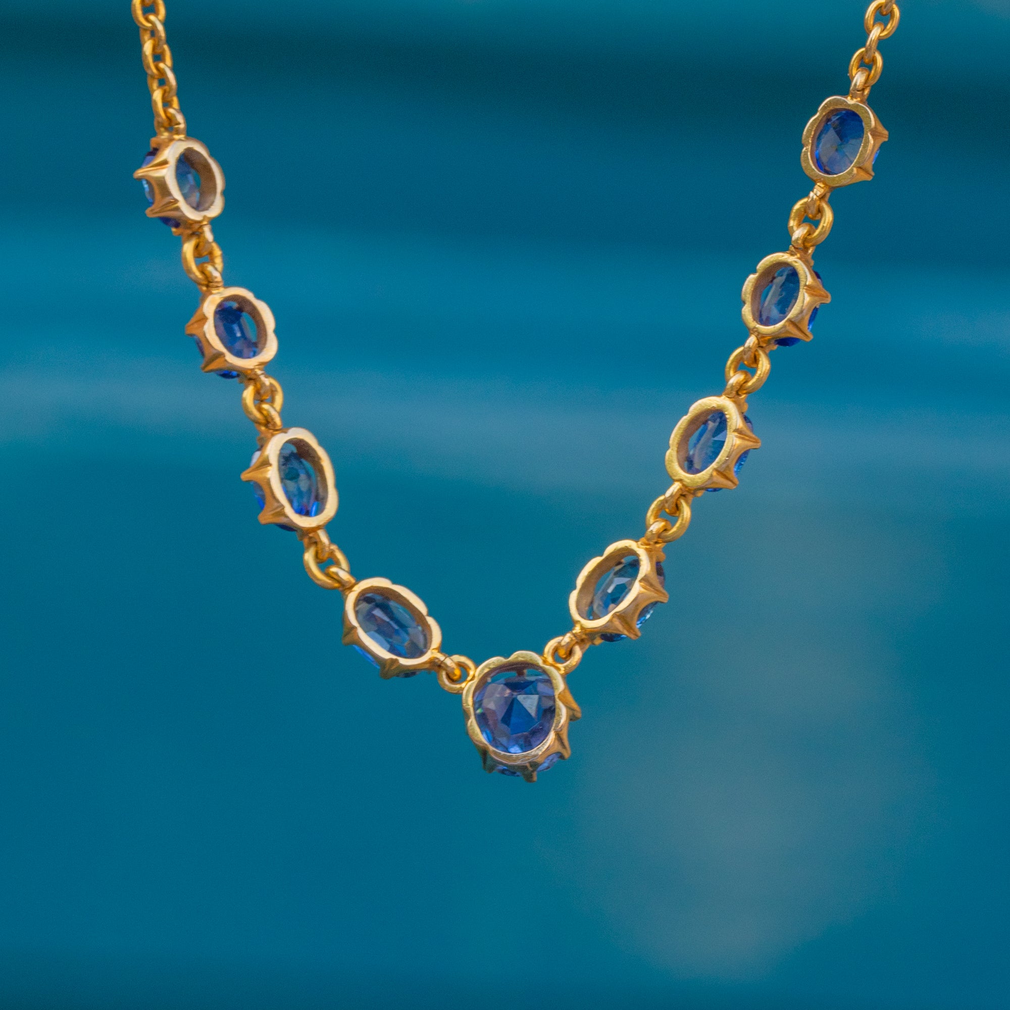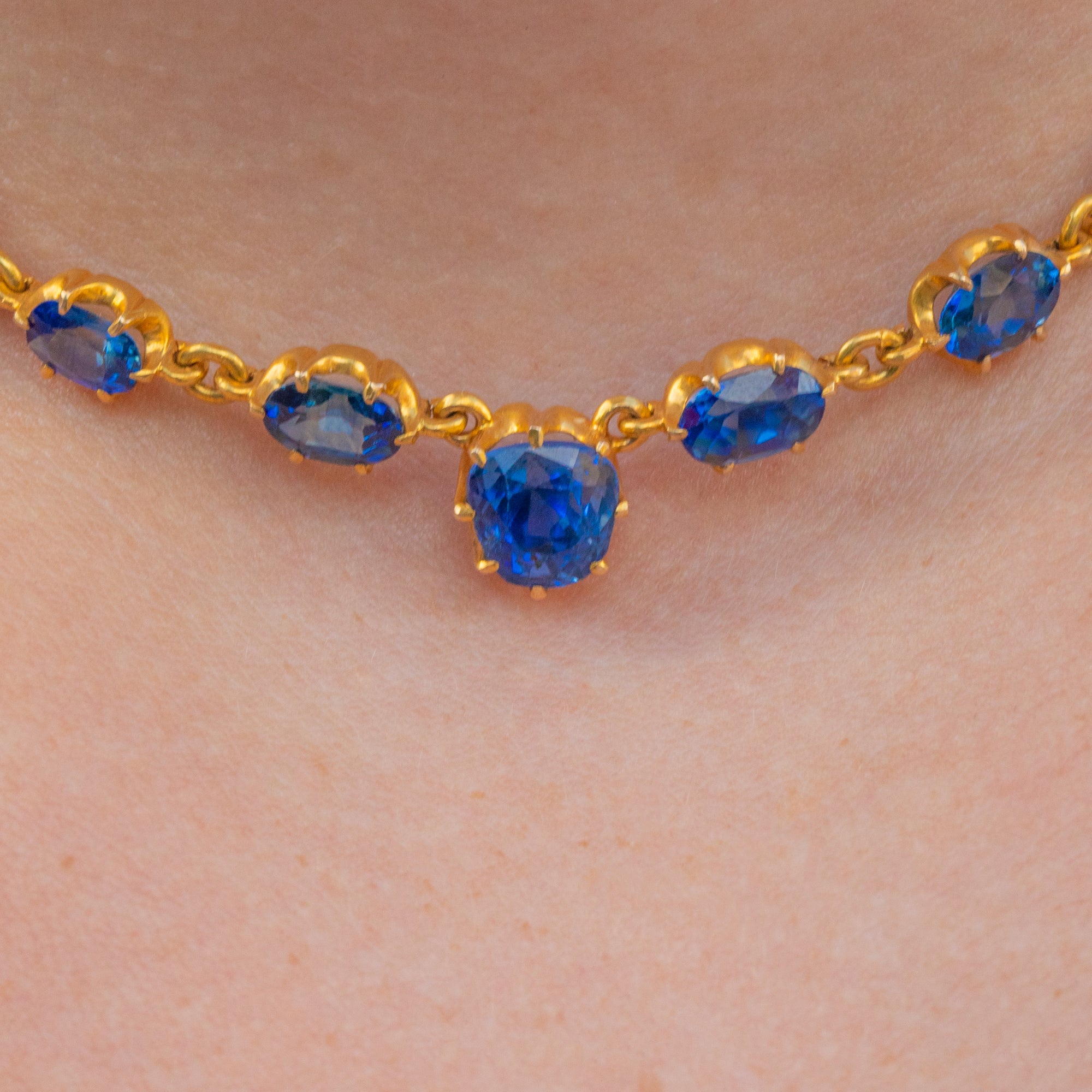 VERY GOOD-EXCELLENT. This antique 15ct Gold Sapphire necklace is in very good to excellent condition! Each Sapphire is secure and the vivid blue is harmonious throughout. There are some subtle surface marks to the central stone, however, this can only be seen through a jeweller's loupe. The 15ct Gold links are uniform and have a rich saturation throughout. With a fully functioning bolt-ring, this Victorian necklace can be enjoyed with confidence!
