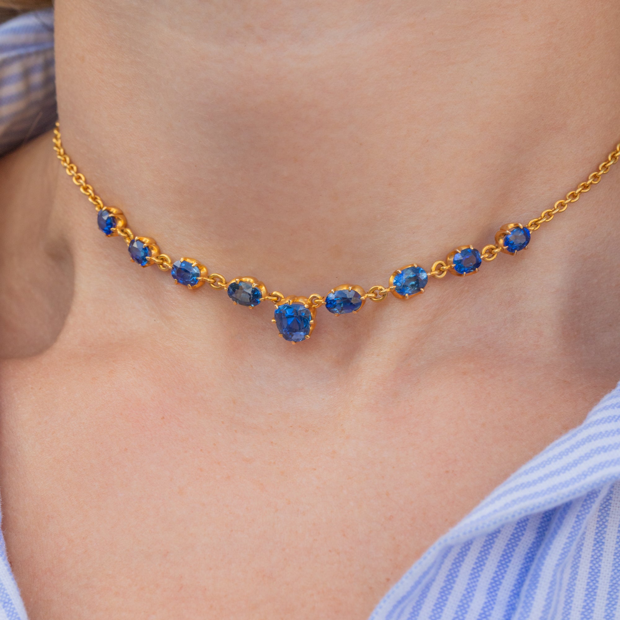 To enhance the vivid blue hues that dance between the facets of her natural Sapphires, she is bound together by highly saturated 15ct Gold, making for a striking pairing. At 13.5" long her row of Sapphire sits snug, accentuating your neckline effortlessly, but you are welcome to get in touch to discuss lengthening her to suit your personal needs!