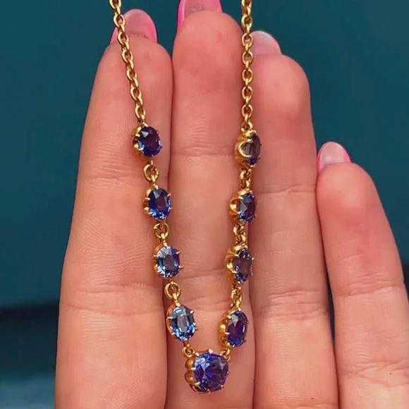 Discover the timeless elegance of this exquisite antique 15ct Gold Sapphire necklace. This stunning Victorian necklace is a testament to the fine craftsmanship of a bygone era, showcasing 7.20ct's of beautifully hand-cut natural Sapphires, flaunting electric blue hues.