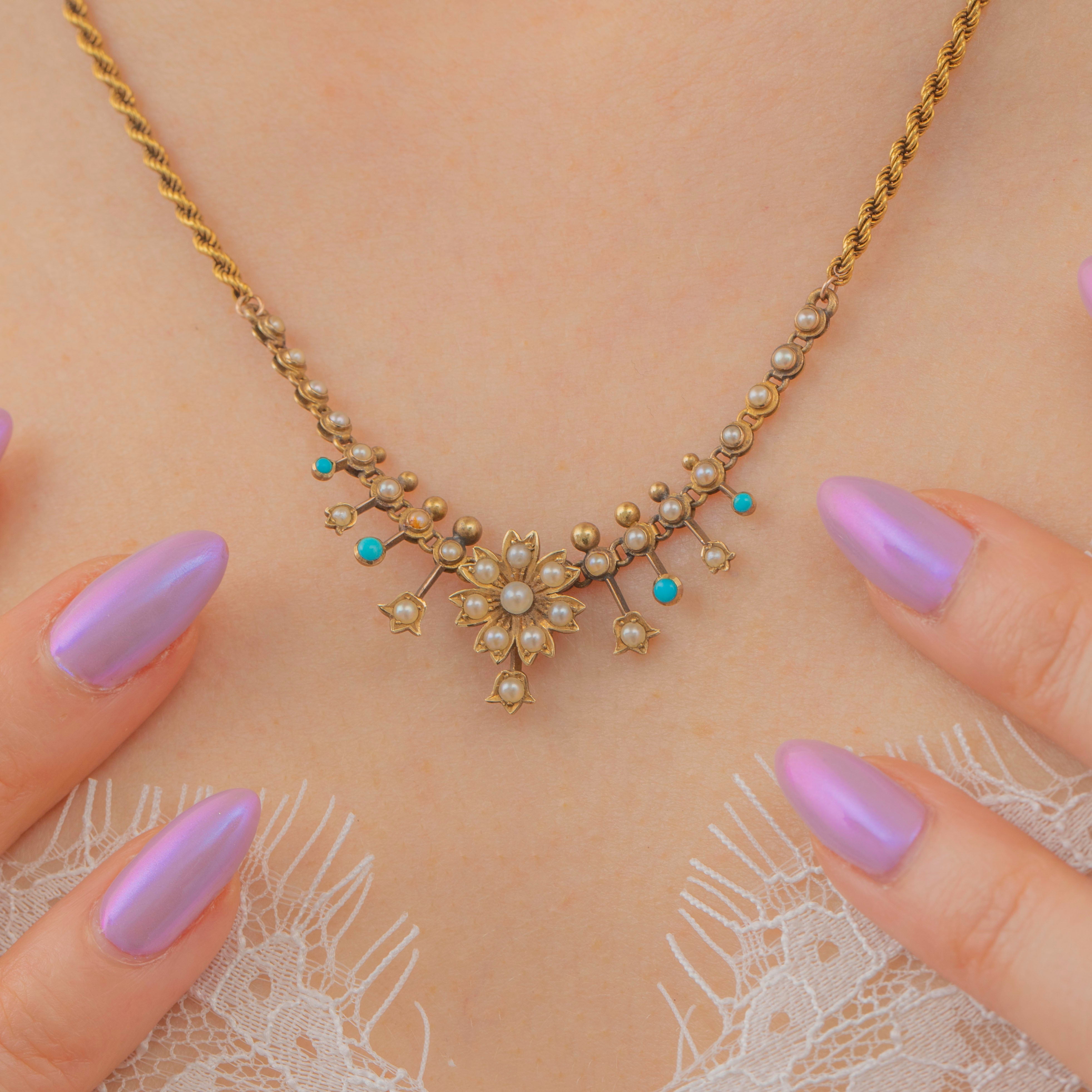 Antique 15ct Gold Turquoise Pearl Floral Necklace