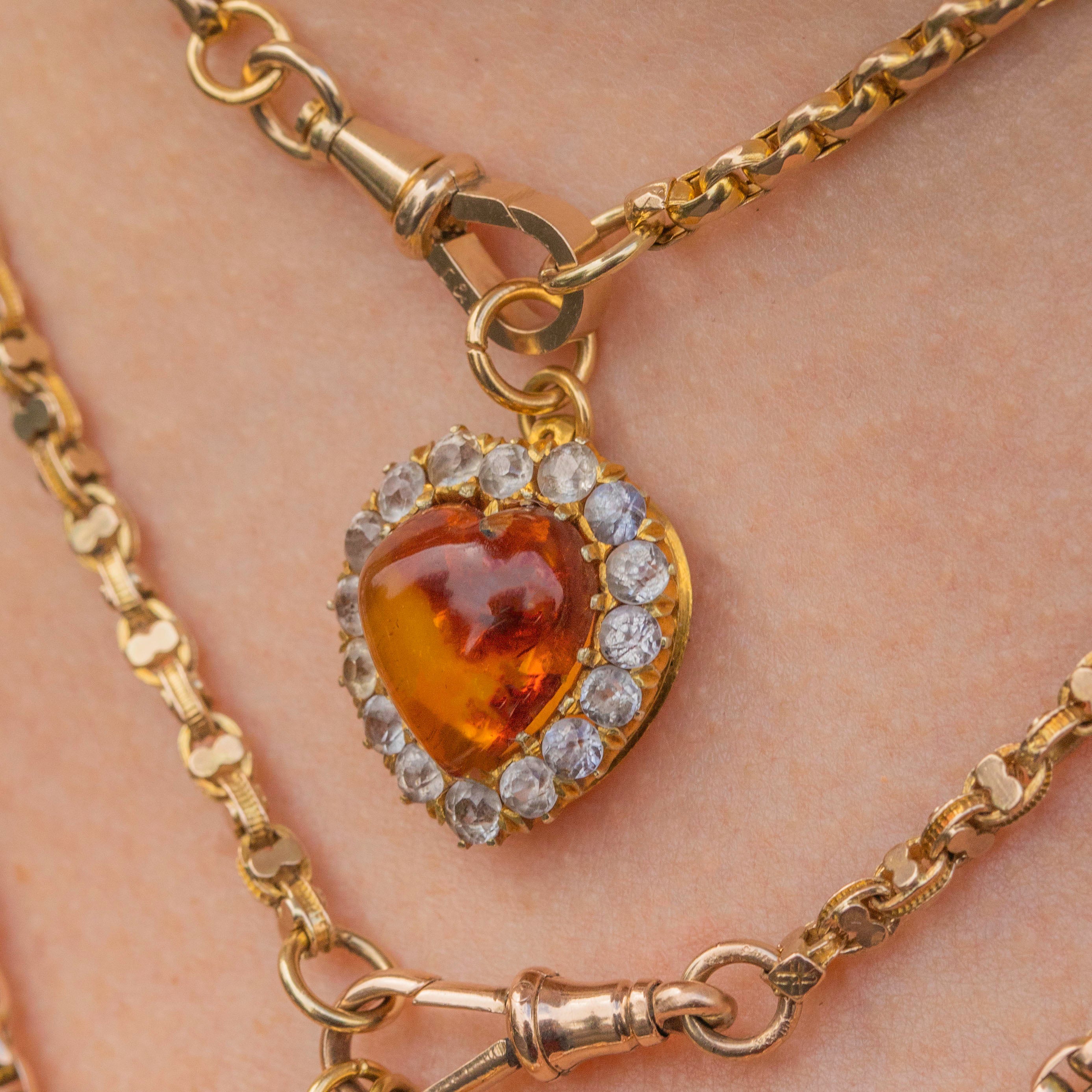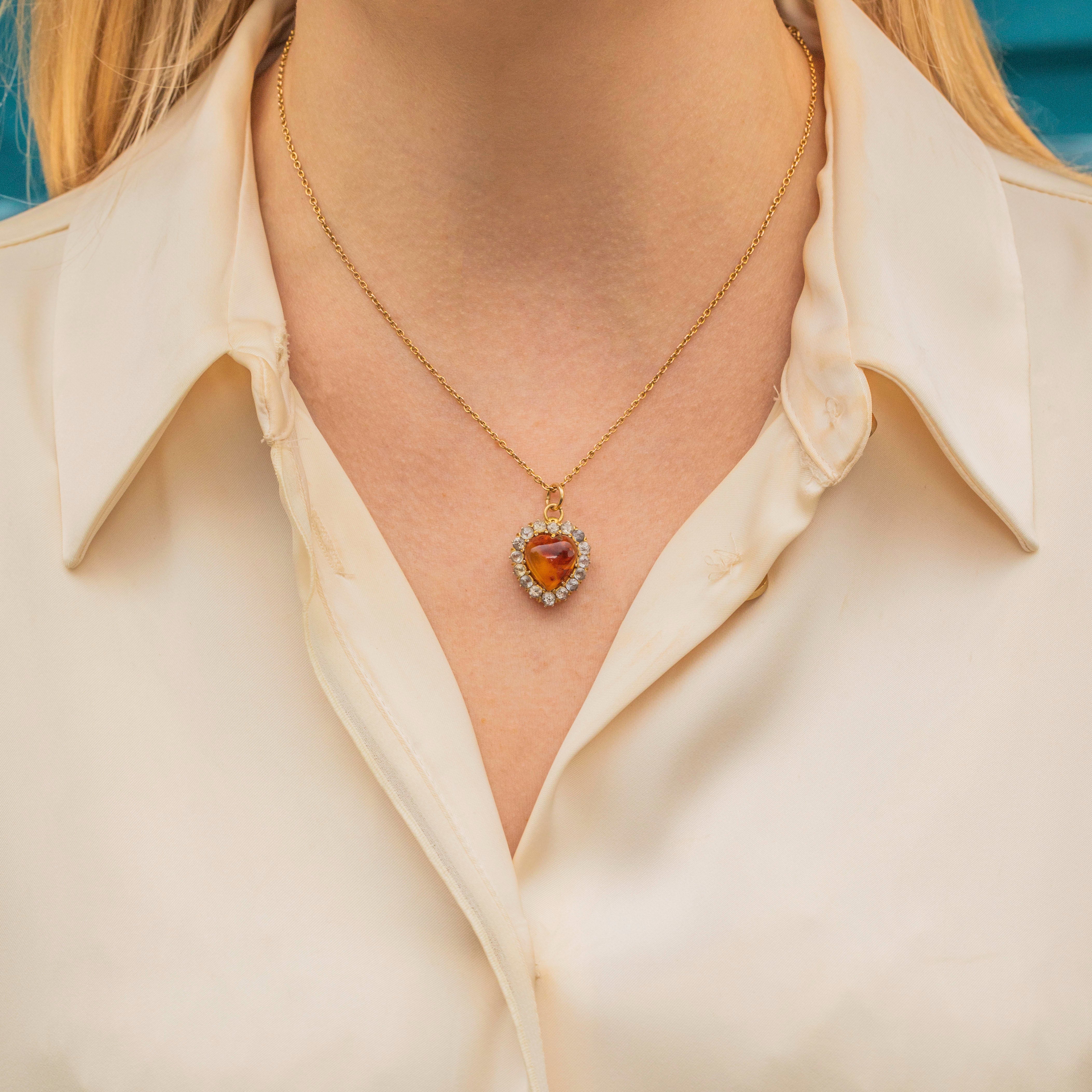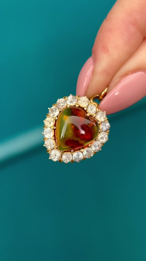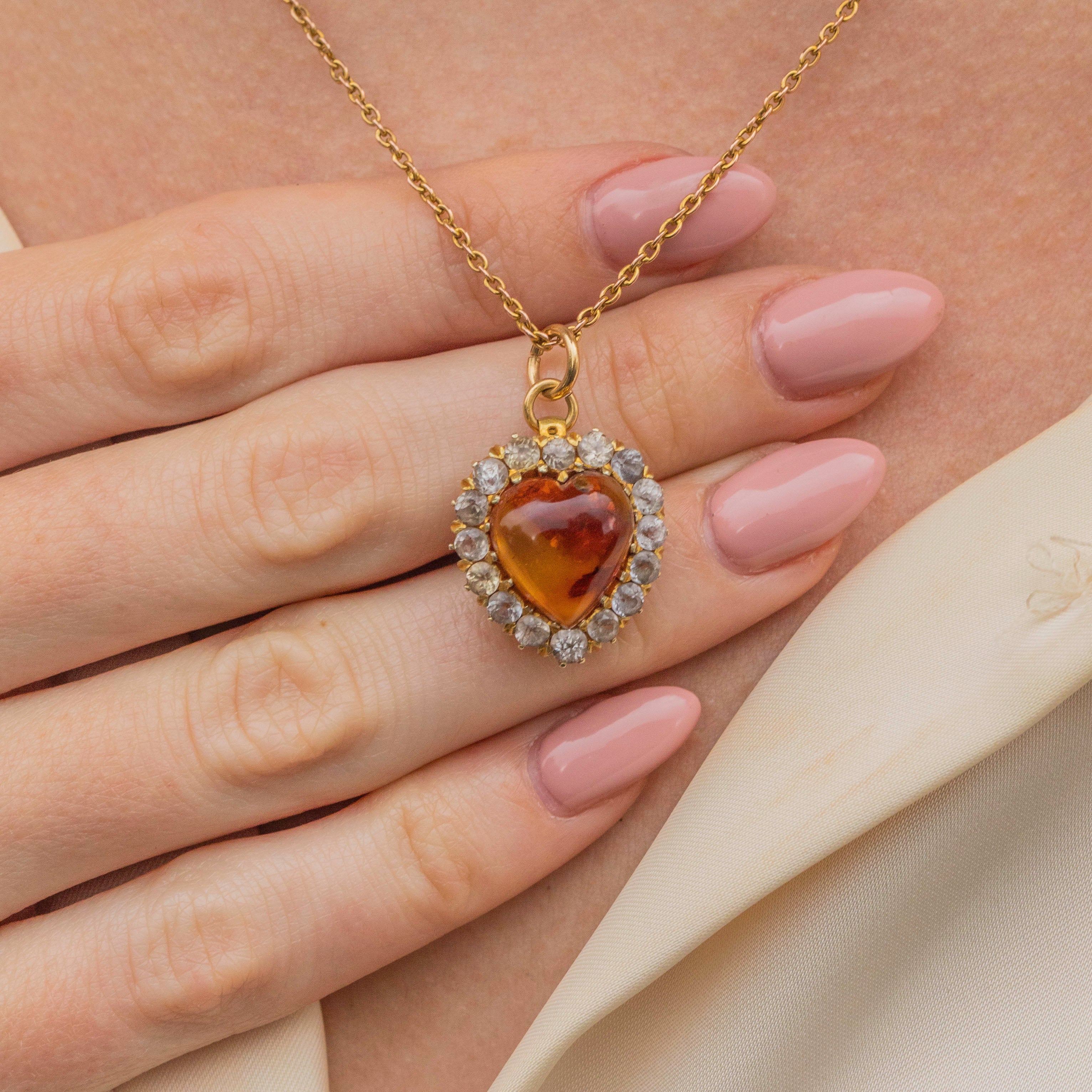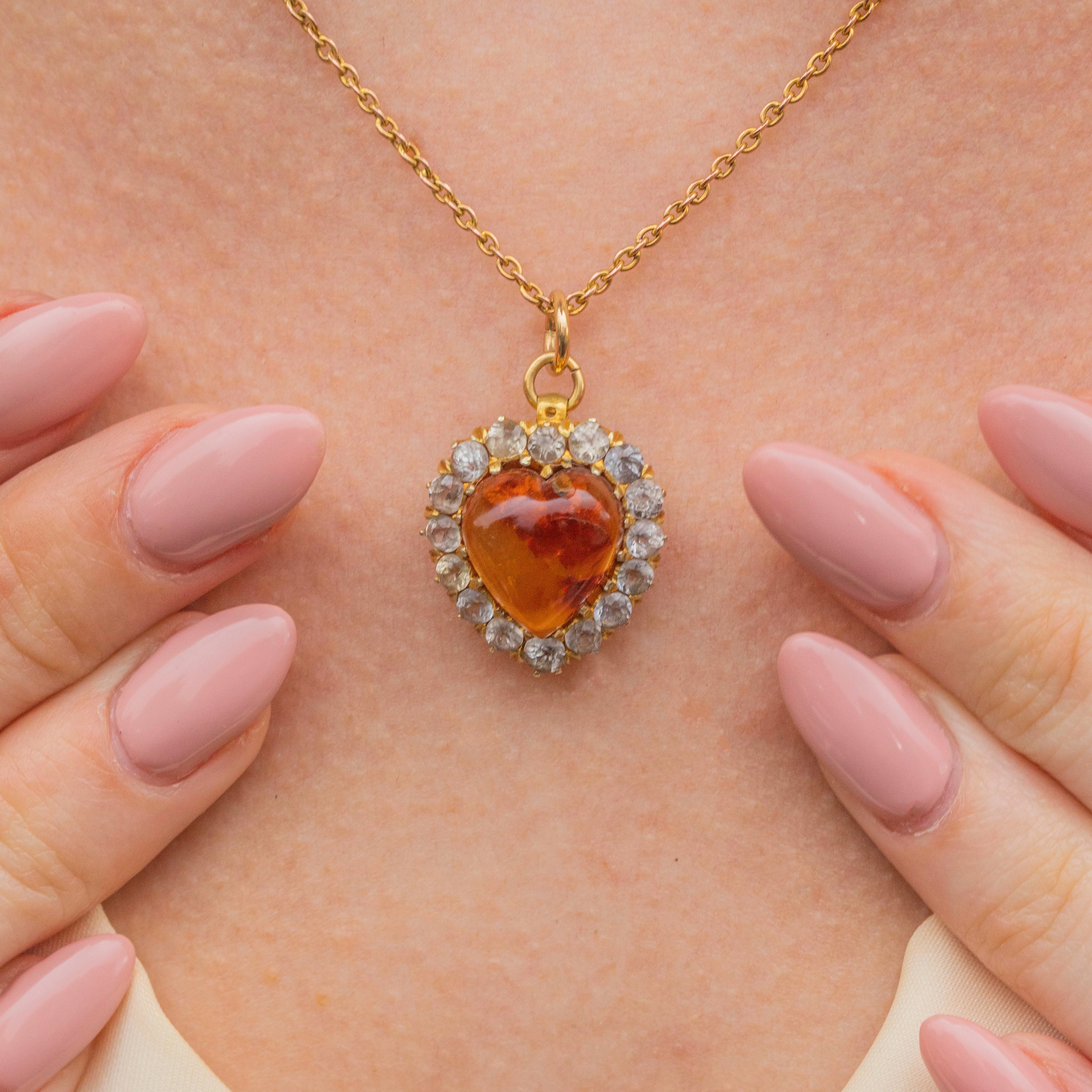 Antique 18ct Gold Amber & White Sapphire Heart Pendant