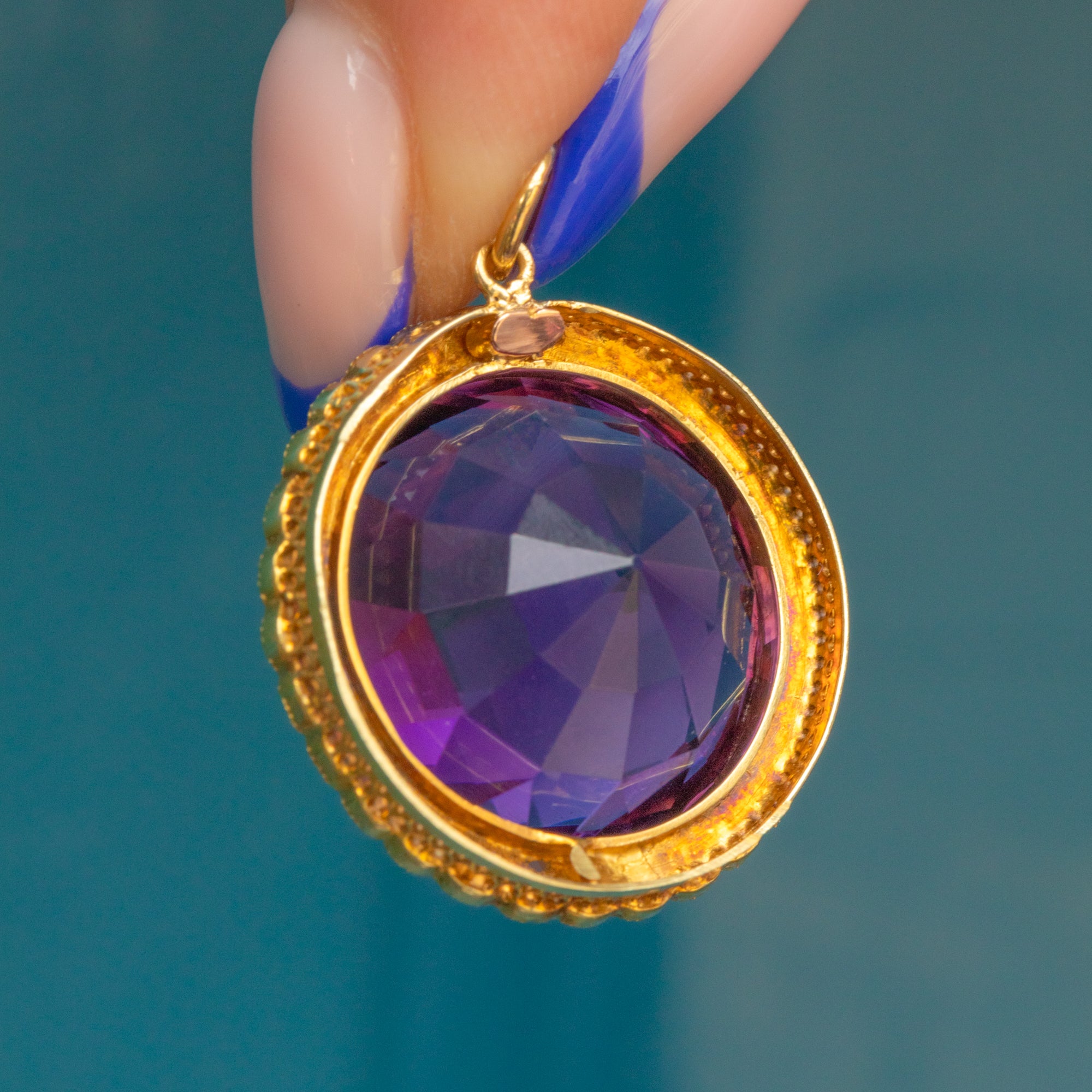 This antique 18ct Gold Amethyst Pearl cluster pendant demands attention! Homing a 14.85ct Amethyst, her vivacious violet hues dance between her fabulously faceted form, haloed by a sea of shimmering Pearls.