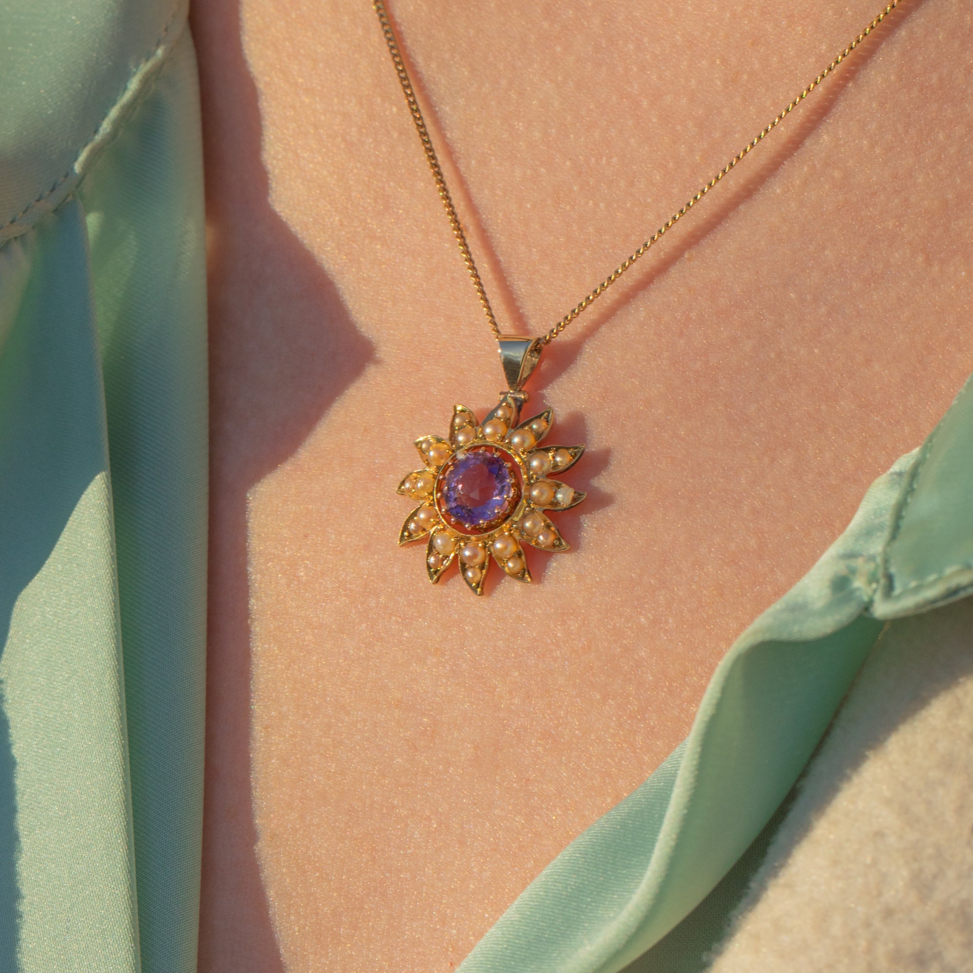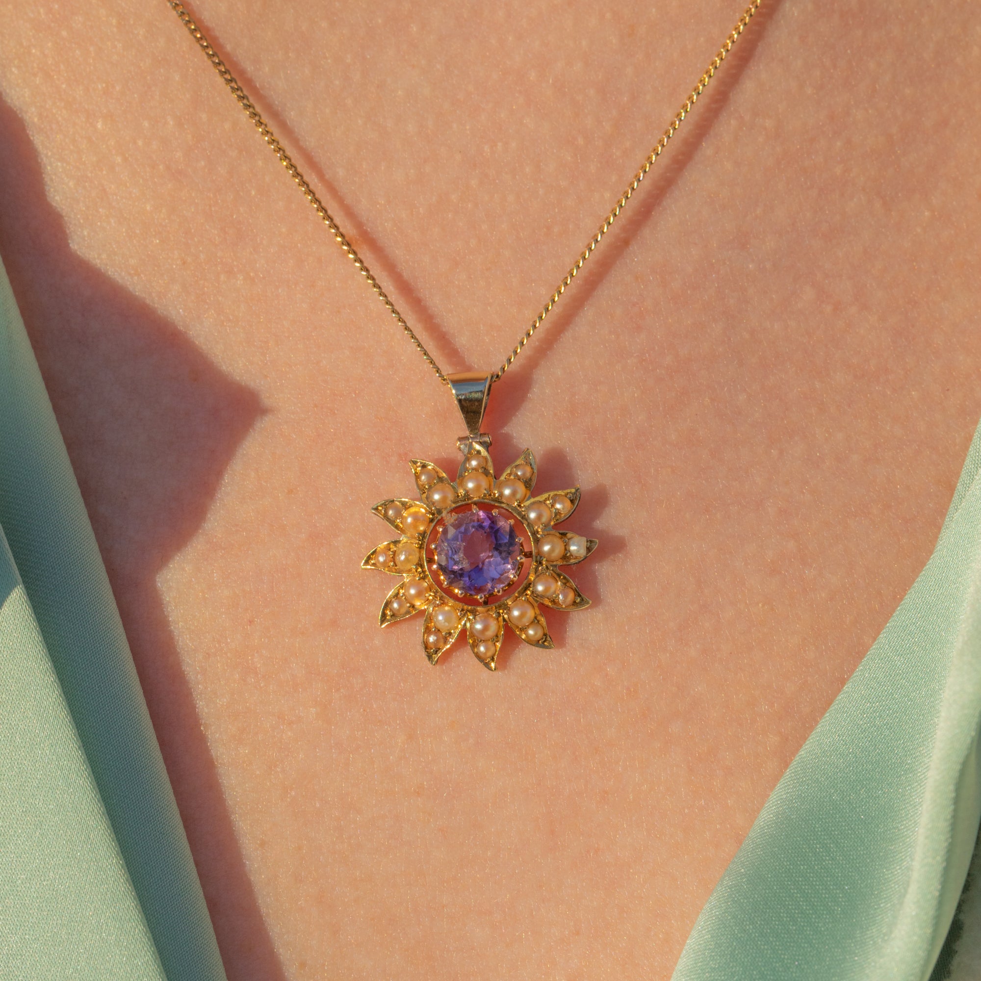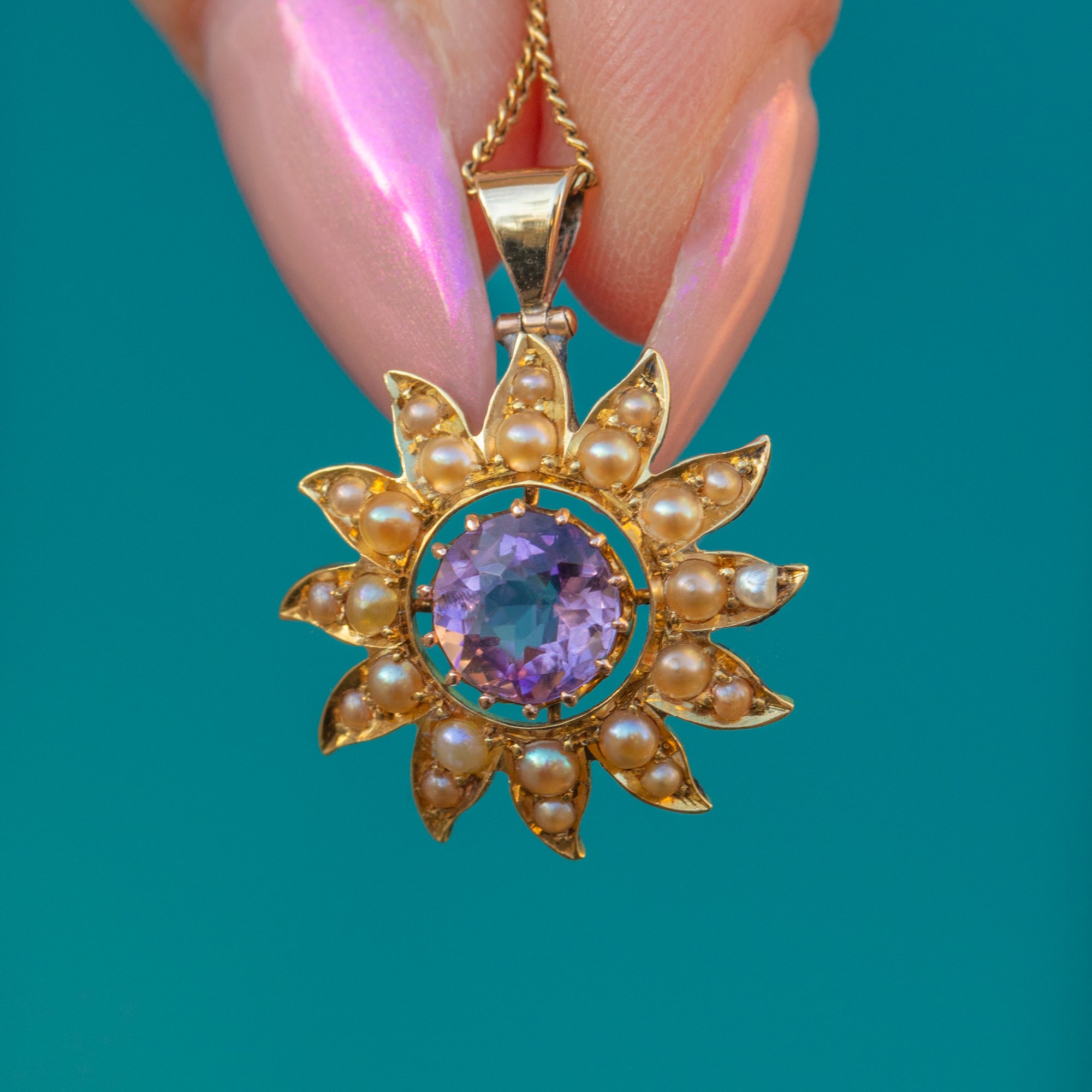 Crafted from buttery 9ct Gold, this floral pendant features a plump faceted Amethyst in her centre, radiating gorgeous lilac and lavender hues as she catches the light. She is adorned by a halo of graduating creamy Pearls, with each of her gemstones married by the warmth of their yellow Gold settings.