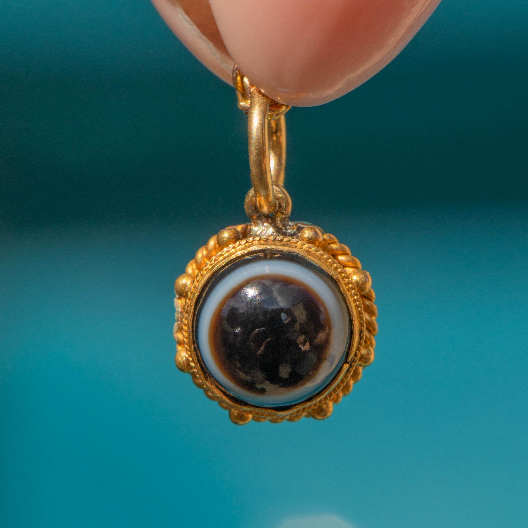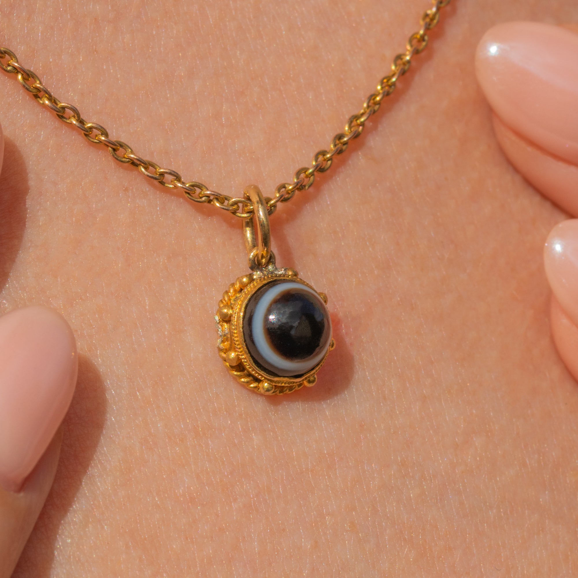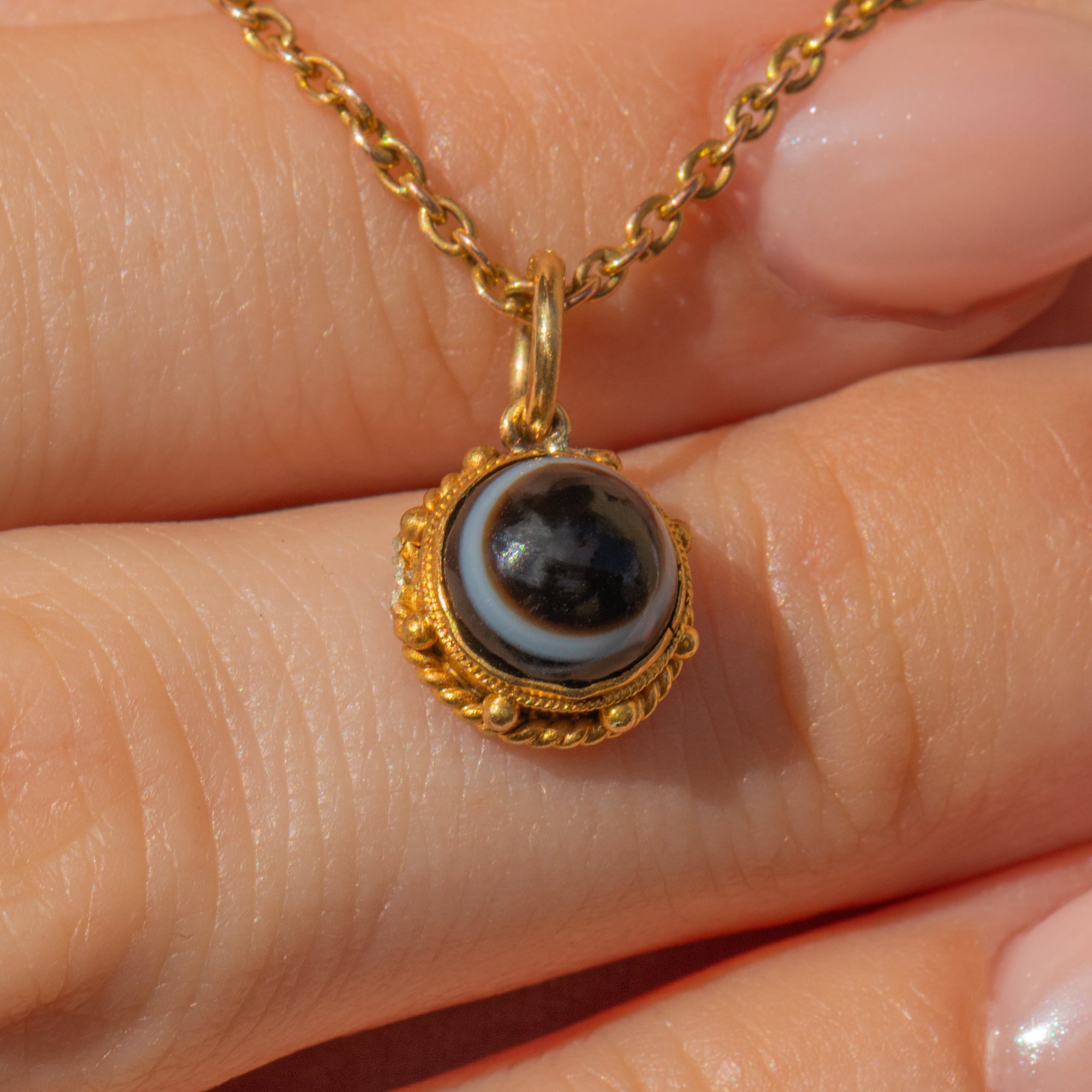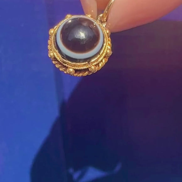 You will intantly become enchanted by this antique 18ct Gold Banded Agate charm! The pool of black Agate, striped with a characteristic white band, is set in honey-hued 18ct Gold with a pretty rope border adding a decorative finish.