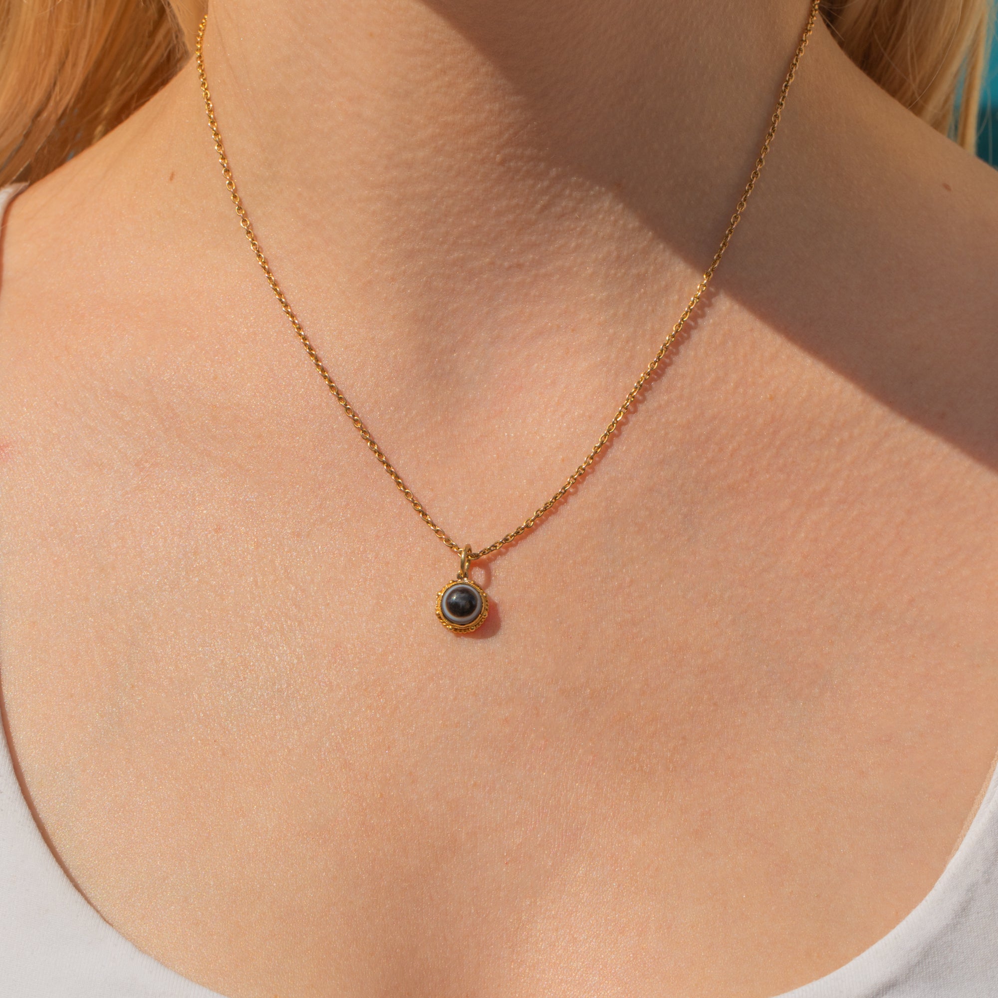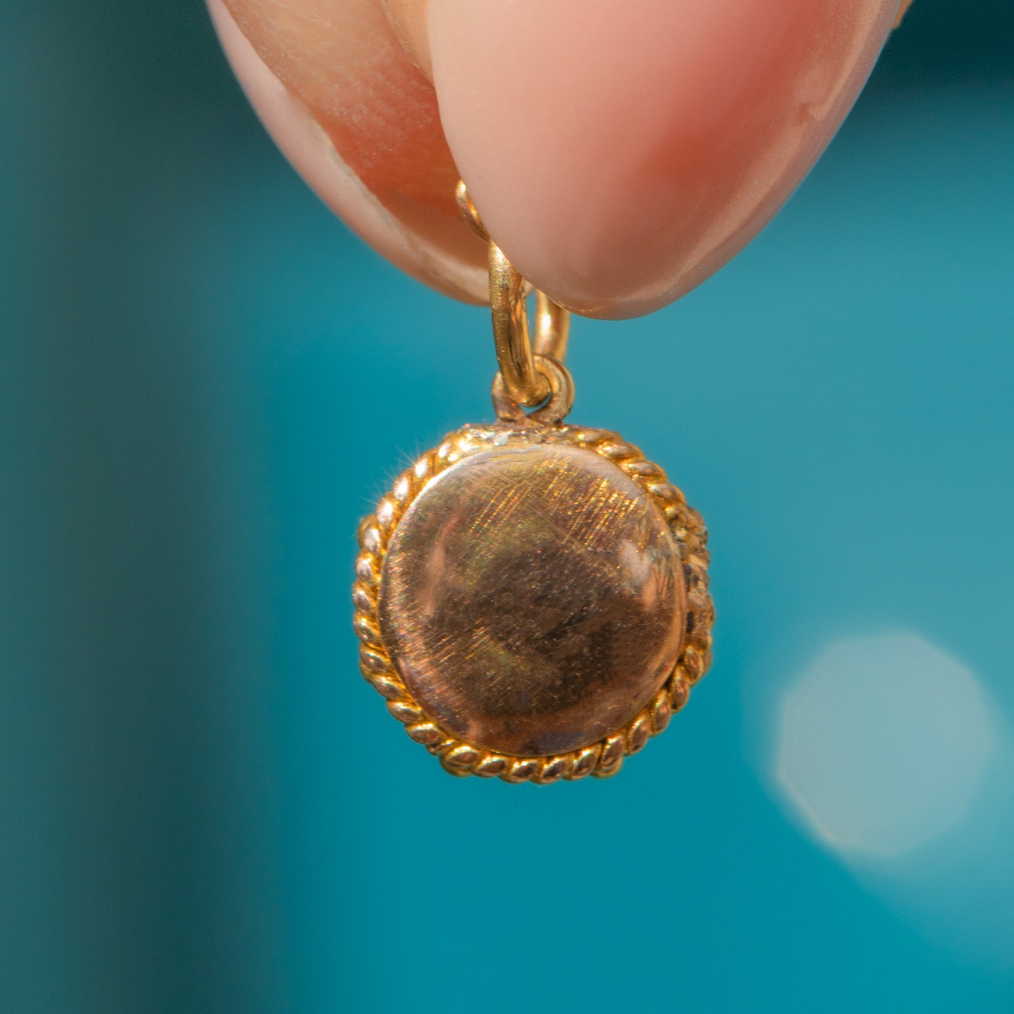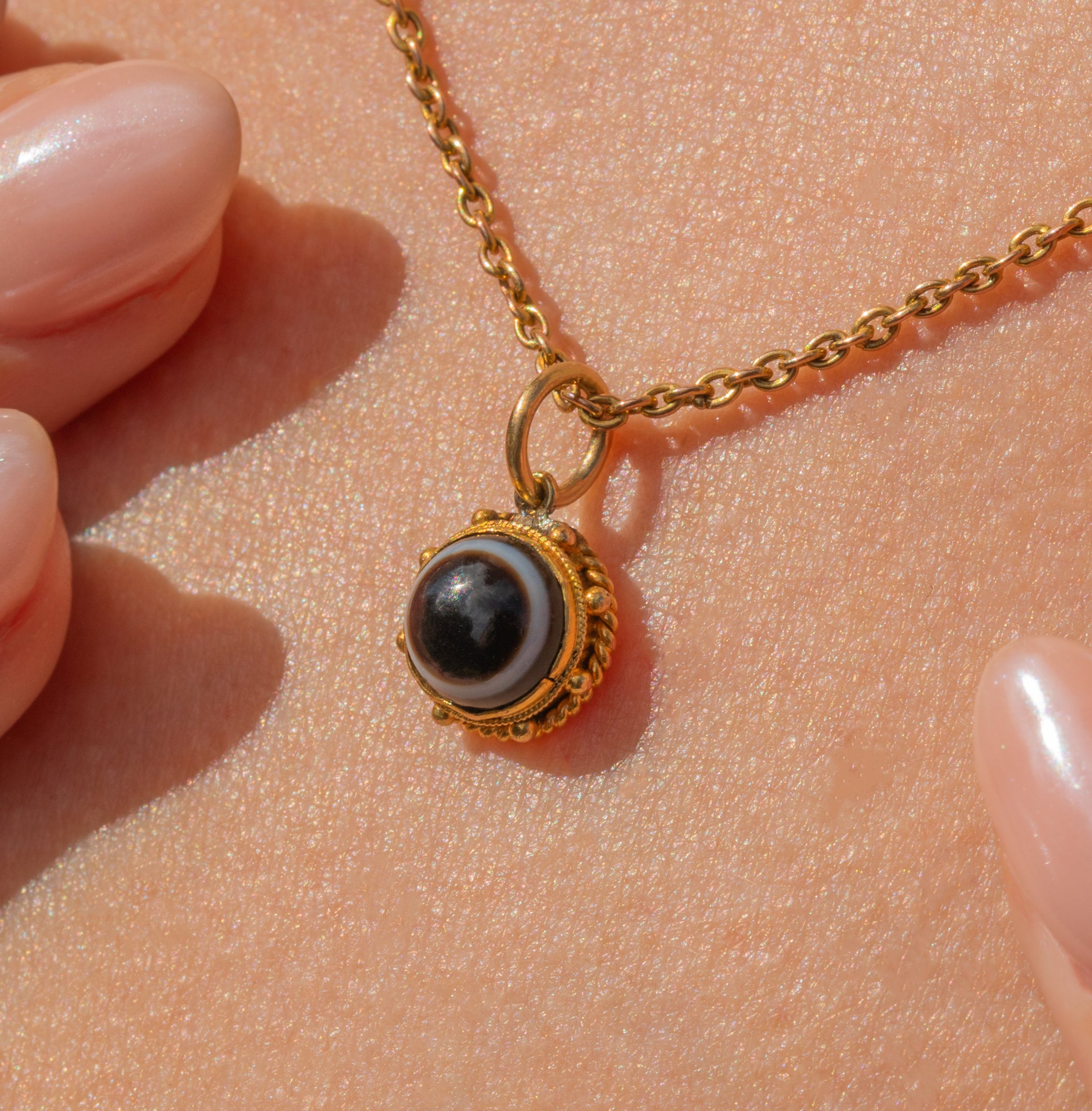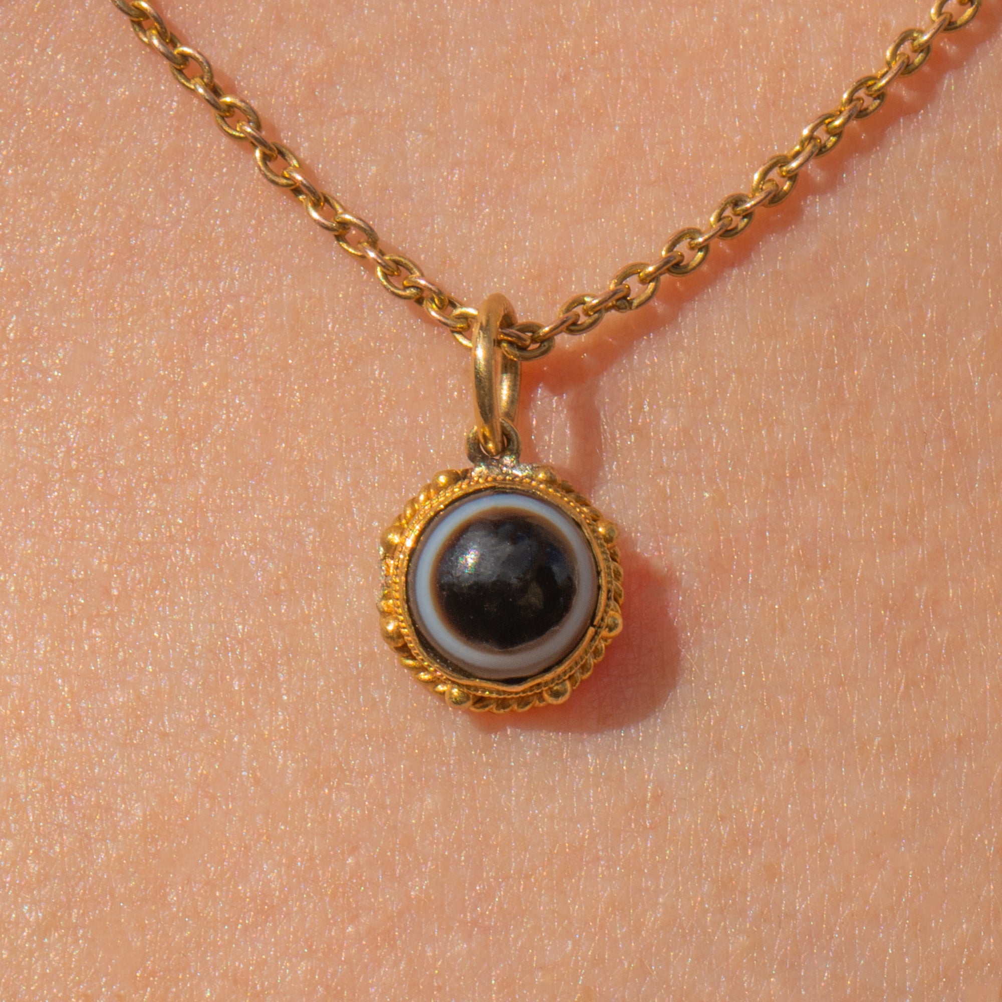 You will intantly become enchanted by this antique 18ct Gold Banded Agate charm! The pool of black Agate, striped with a characteristic white band, is set in honey-hued 18ct Gold with a pretty rope border adding a decorative finish.