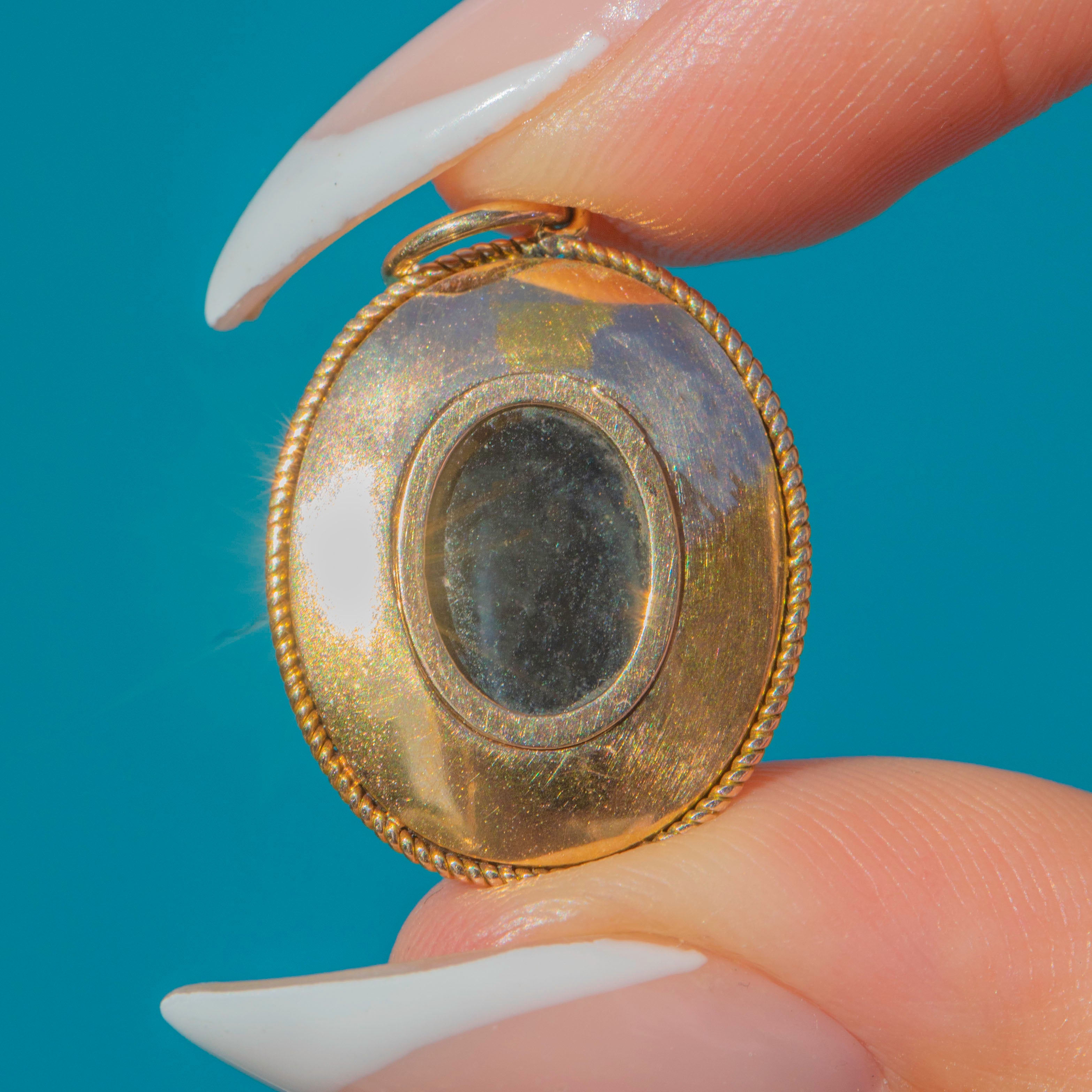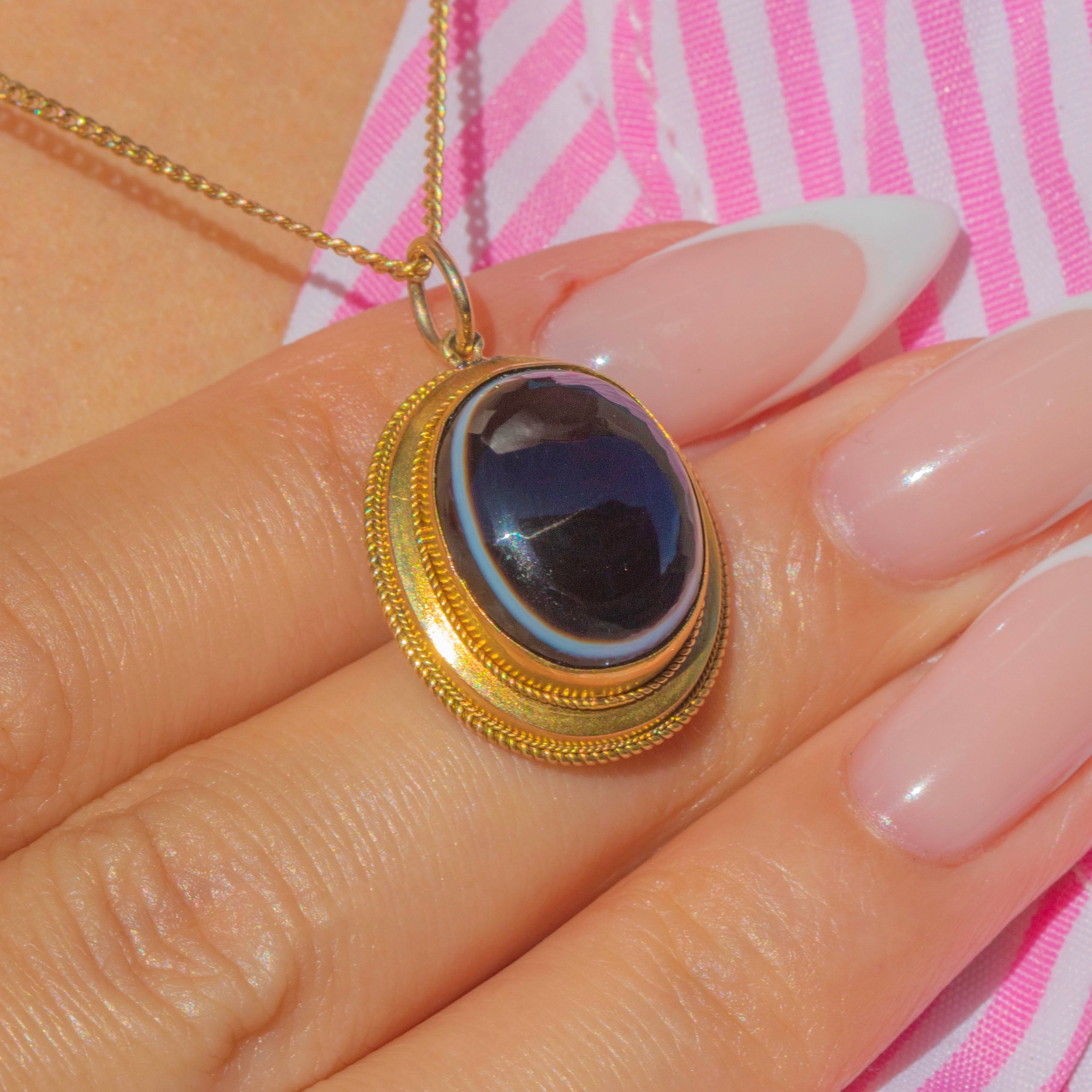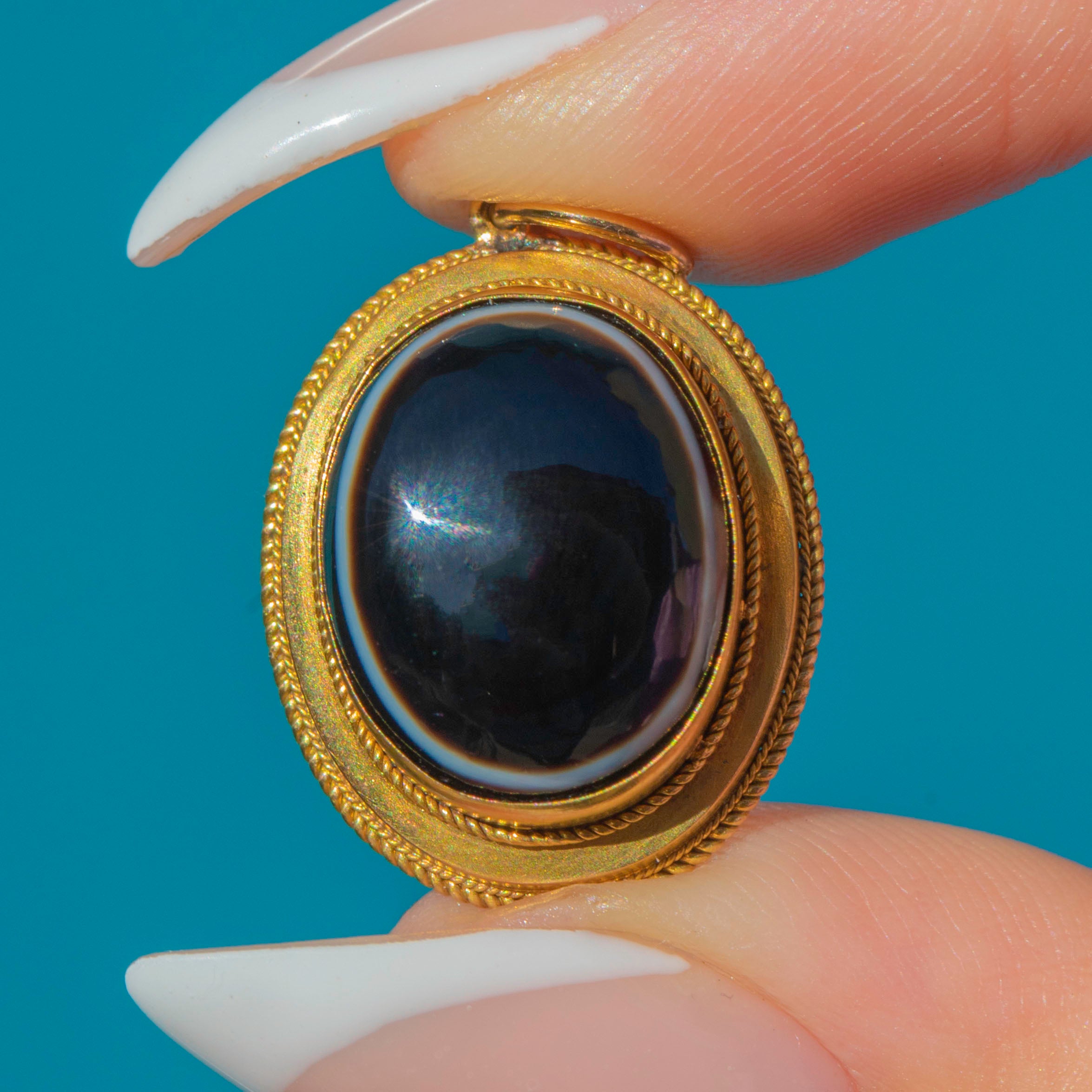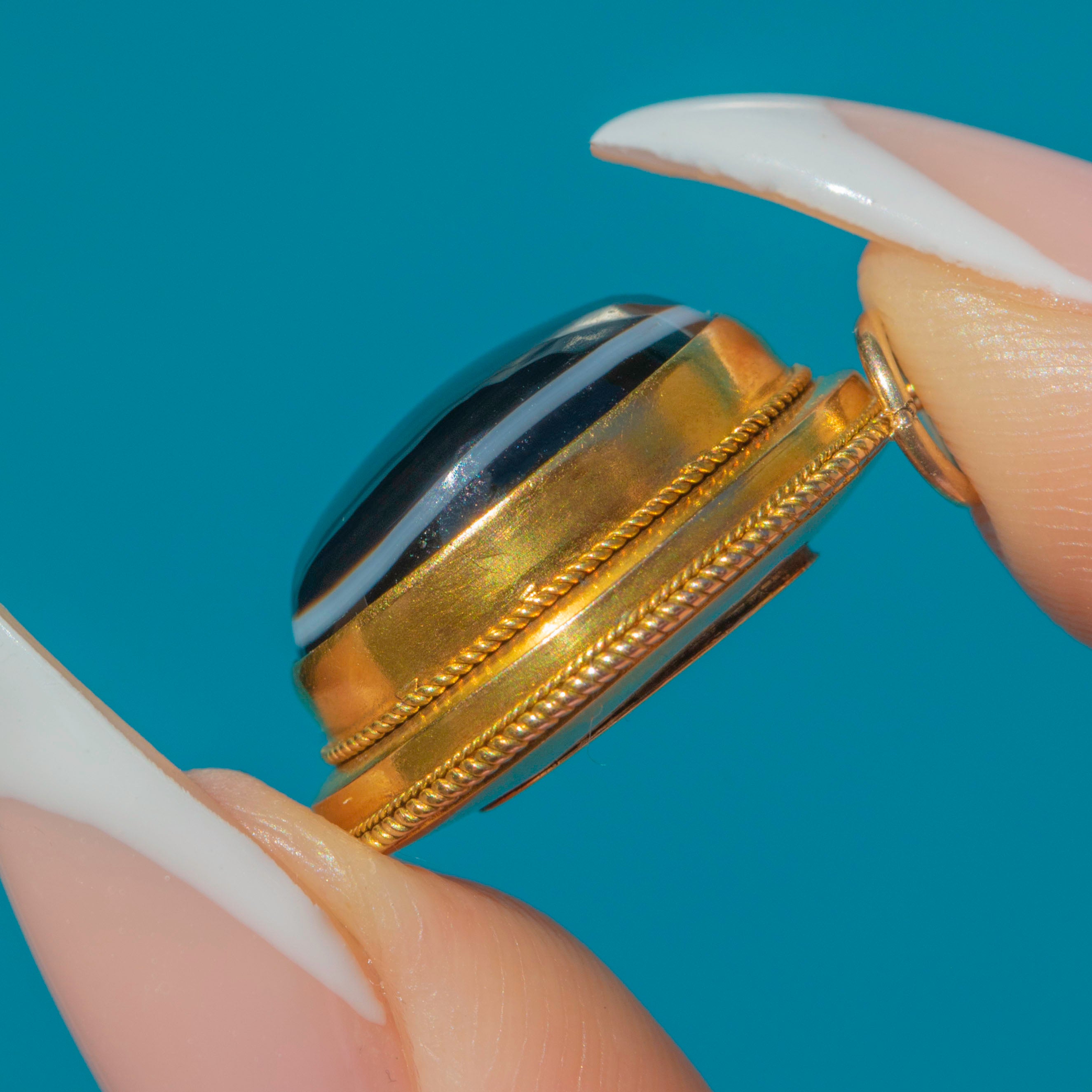 EXCELLENT. The Banded Agate is smooth and free from chips, displaying strong colour contrast between the black and white layers. The Gold mount is in superb condition with crisp rope-twist detailing and a rich tone. The conversion to pendant has been sensitively done, making this antique jewel ready to wear and enjoy.