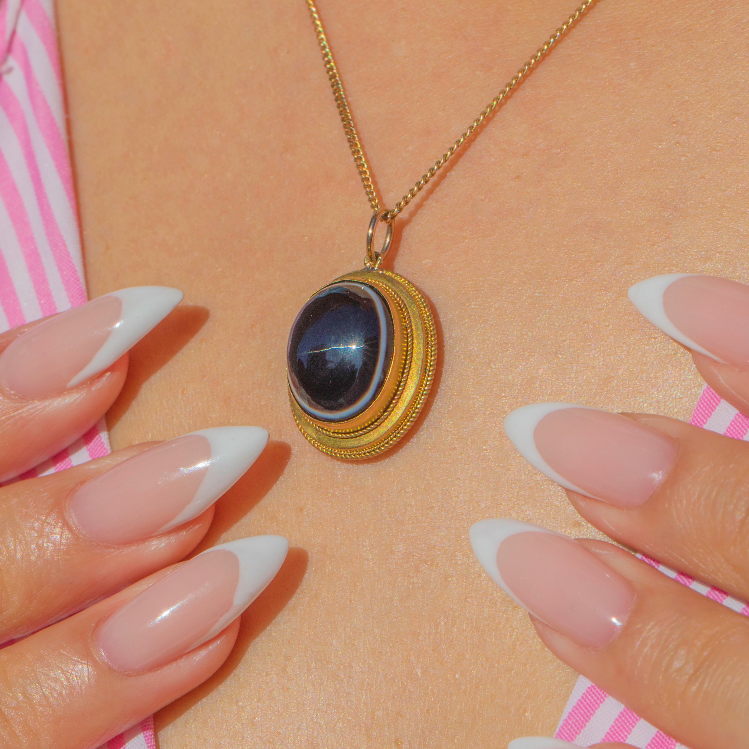 This Antique pendant showcases a striking Banded Agate cabochon, its deep black centre framed by a natural white band, creating bold contrast and timeless appeal. The gemstone is set in a beautifully crafted 18ct Gold mount, finished with fine rope-twist detailing around the border for added texture and richness.