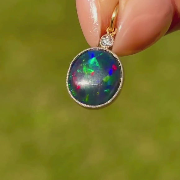 EXCELLENT. This antique 18ct Gold Black Opal Diamond charm is in excellent condition. Her glorious Opal is set securely in her bezel, with no chips or scuffs to her surface. On the underside of the Opal is a natural and uneven layer of 'potch', which contributes to her vivid dark colour, making her even more sough-after. Her glittering Diamond is also set securely with no fleabites visible. Simply add a chain and wear with pride!