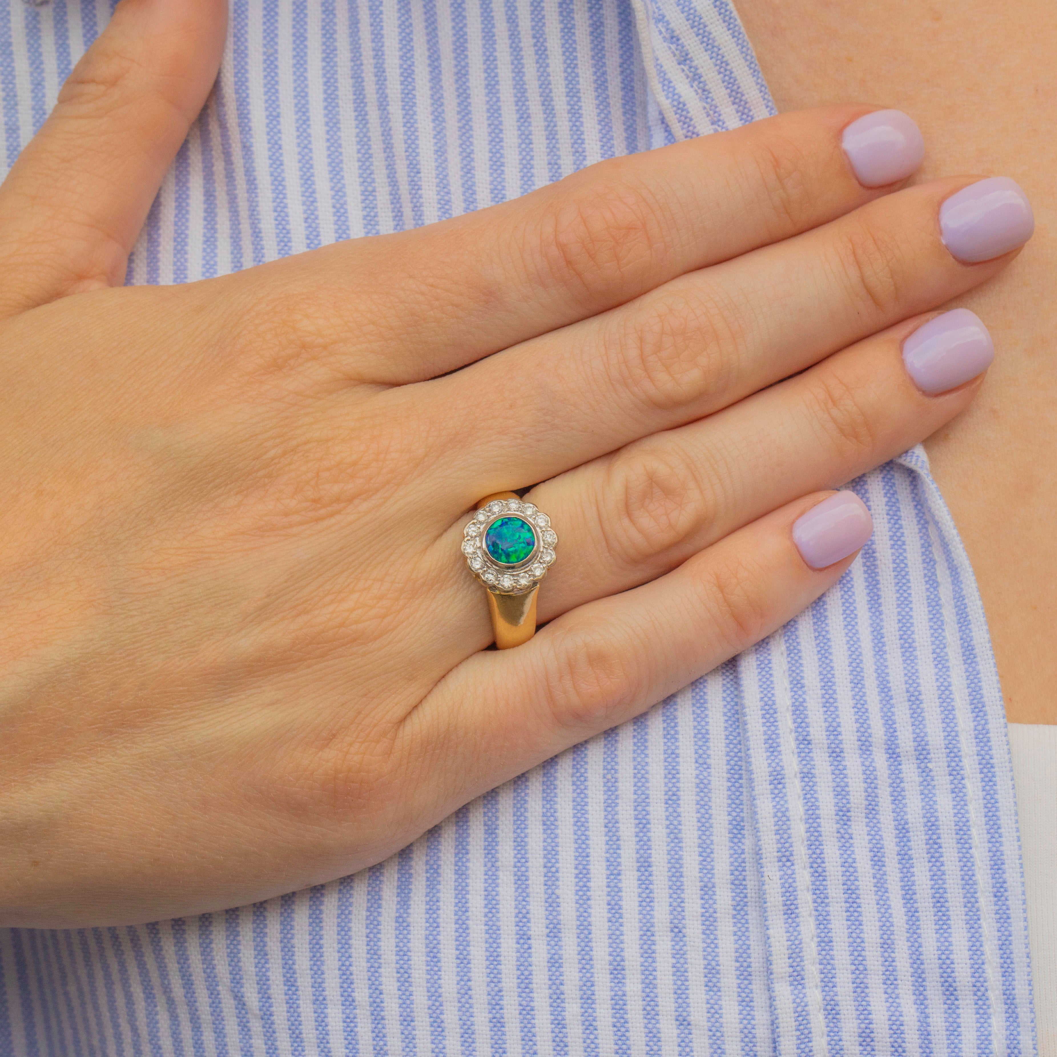 EXCELLENT. We are delighted to report that this 18ct Gold Black Opal & Diamond cluster ring is in excellent condition! The gemstones are pristine, free form chips or abrasions, and securely held within their settings. The ring band is smooth with an even, saturated hue throughout. This chunky delight promises years of wear and enjoyment!