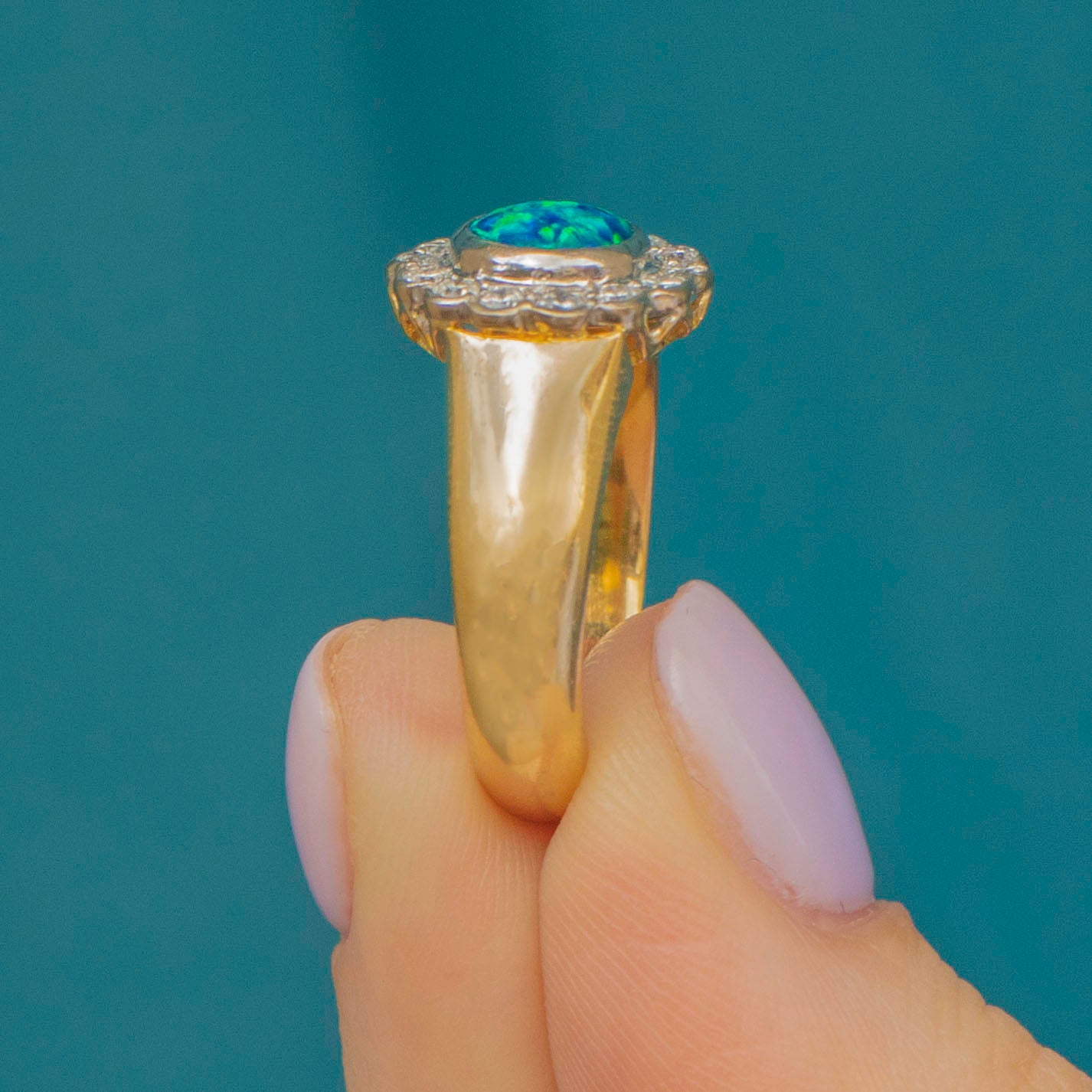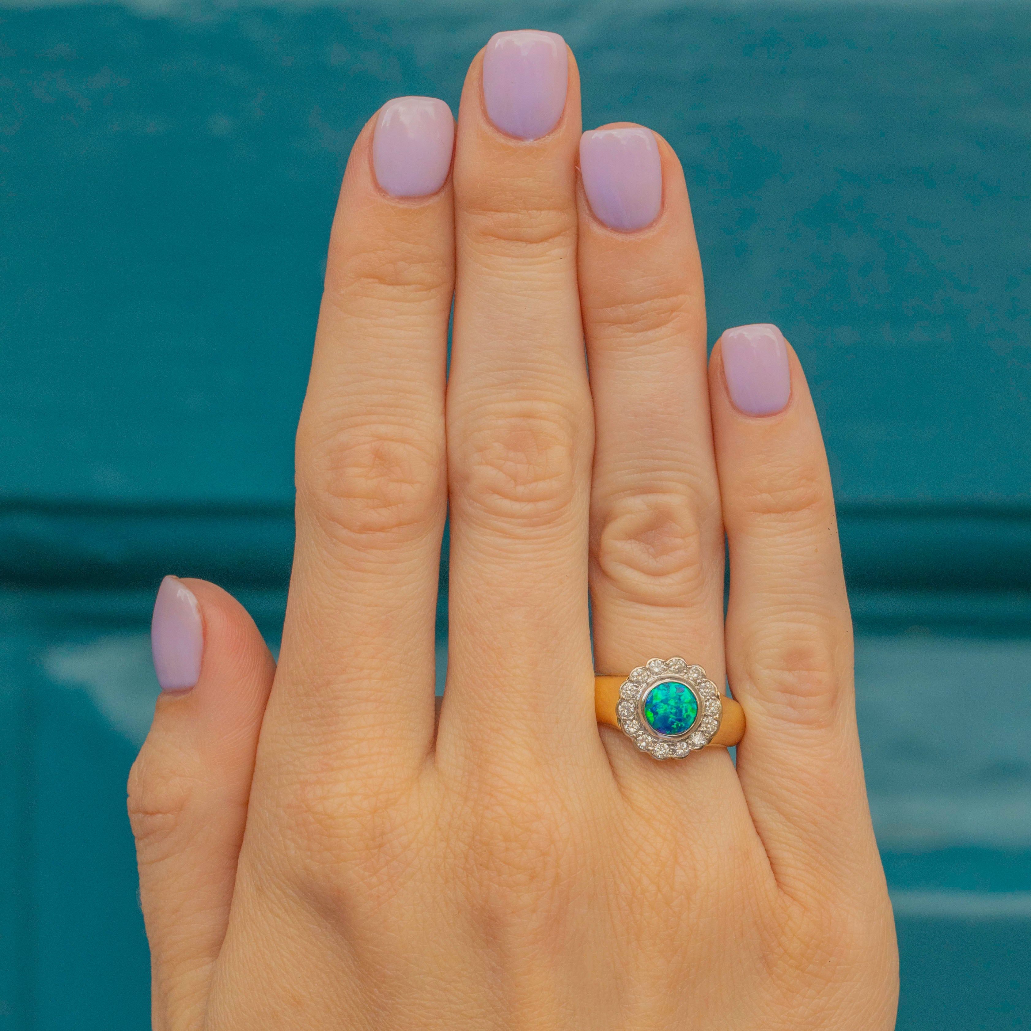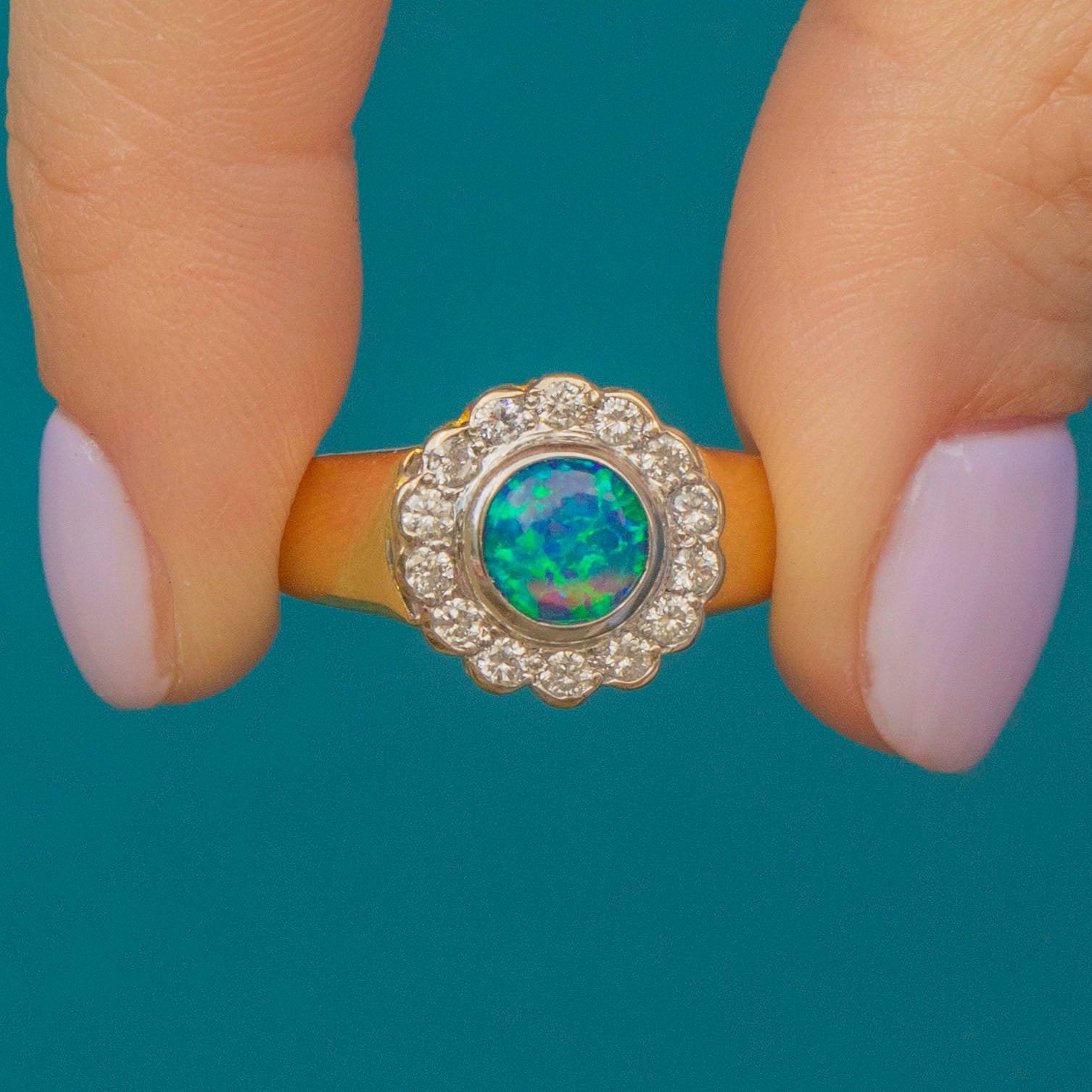 Bring statement to your outfit with this phenomenal 18ct Gold Black Opal & Diamond cluster ring! The star of the show is undeniably the outstanding gemstone cluster, displaying a vivid midnight blue Opal with electric cyan flashes, haloed by fourteen scintillating Diamonds set into lustrous 18ct White Gold, totalling 0.28ct.