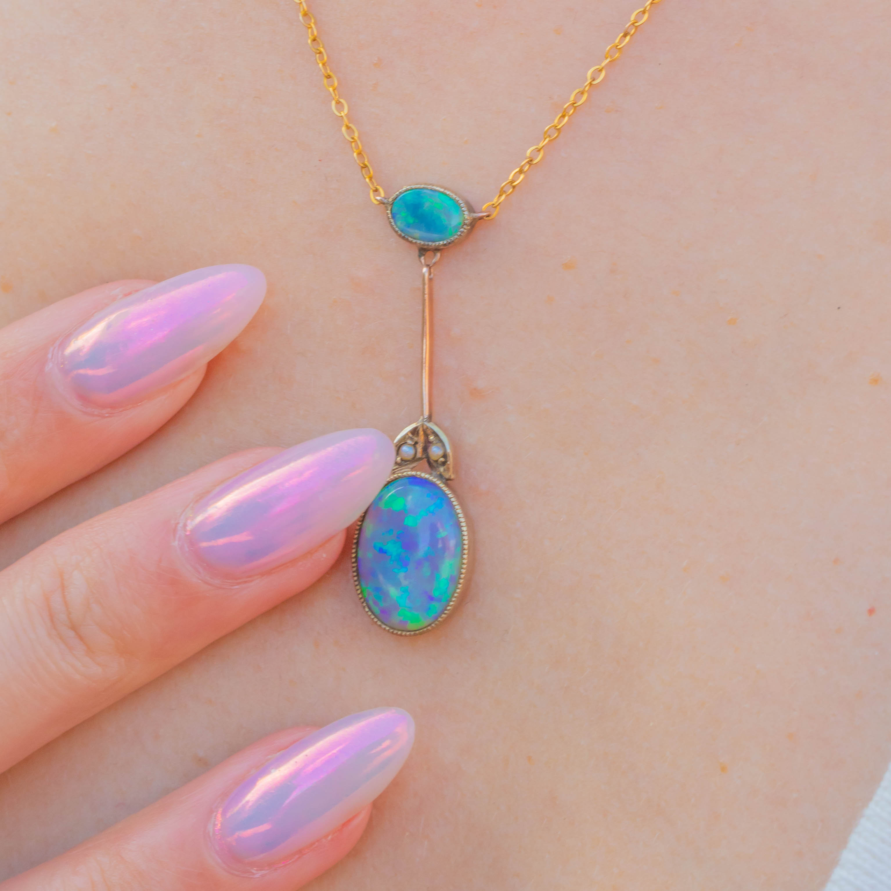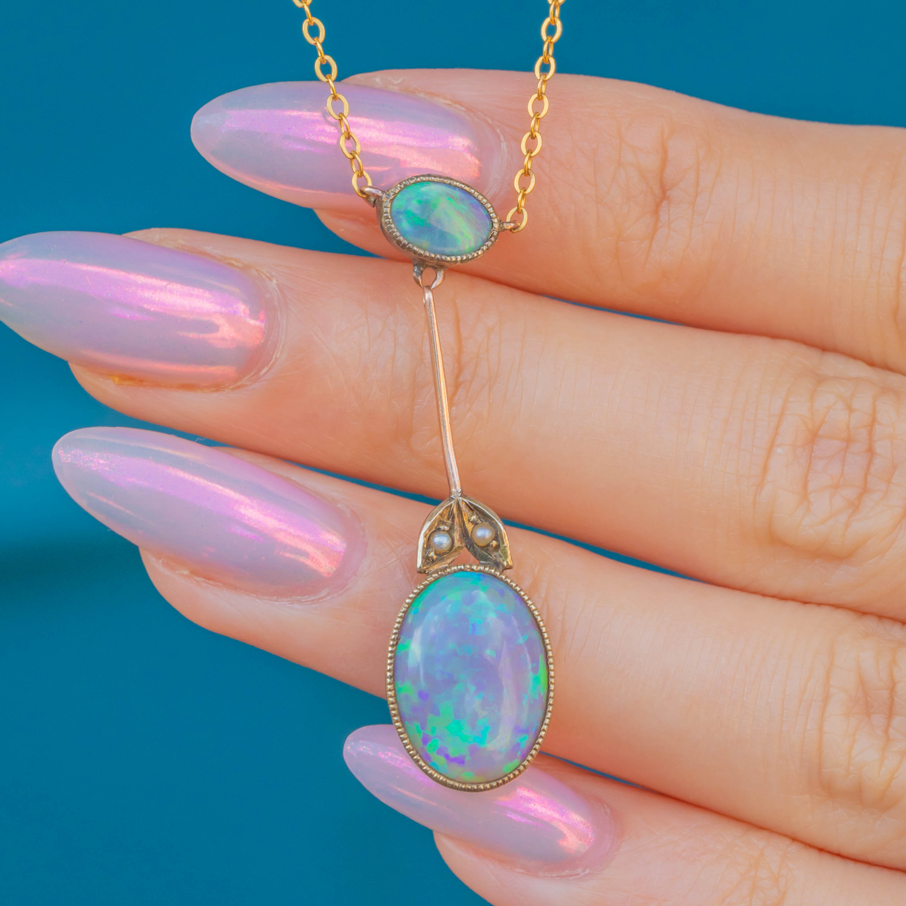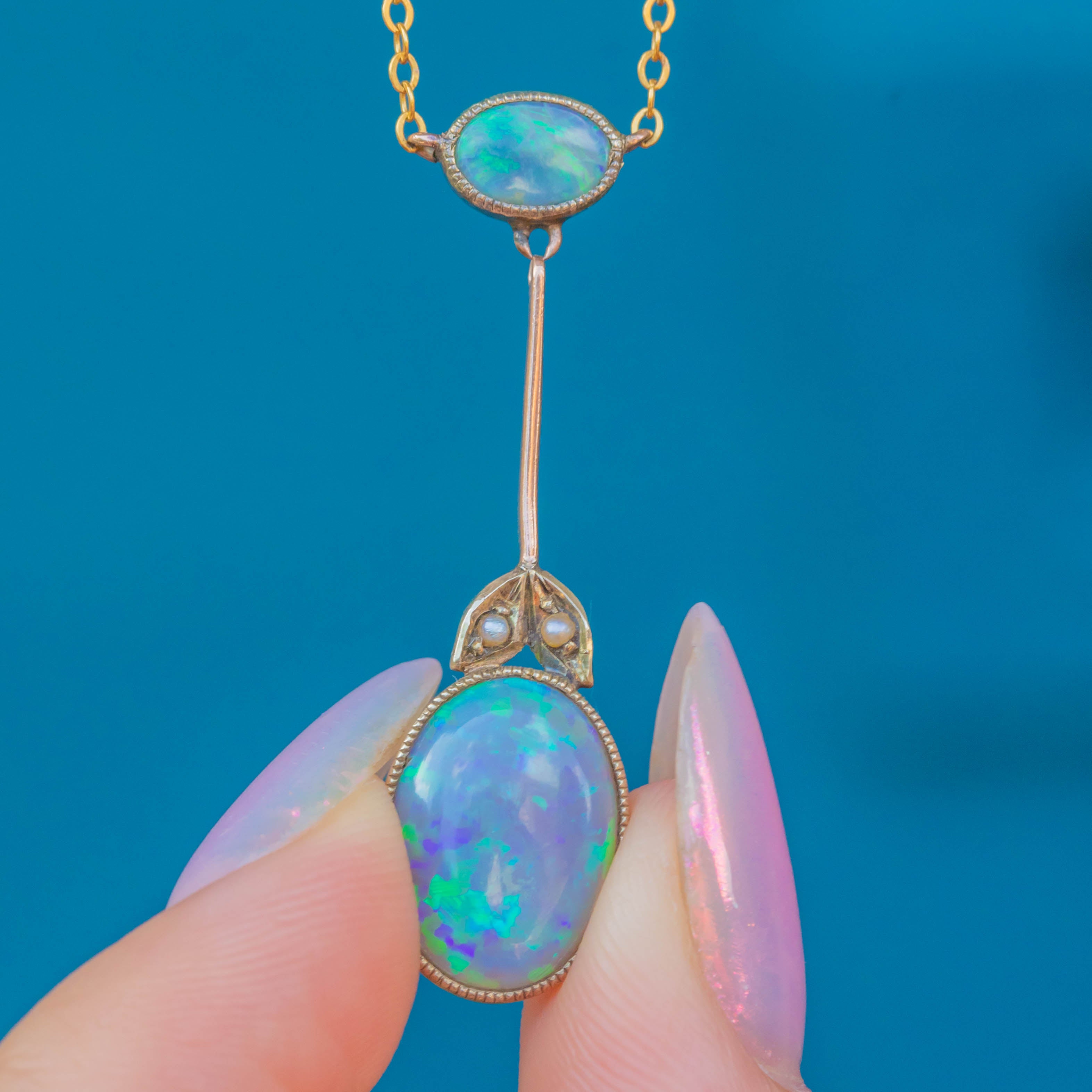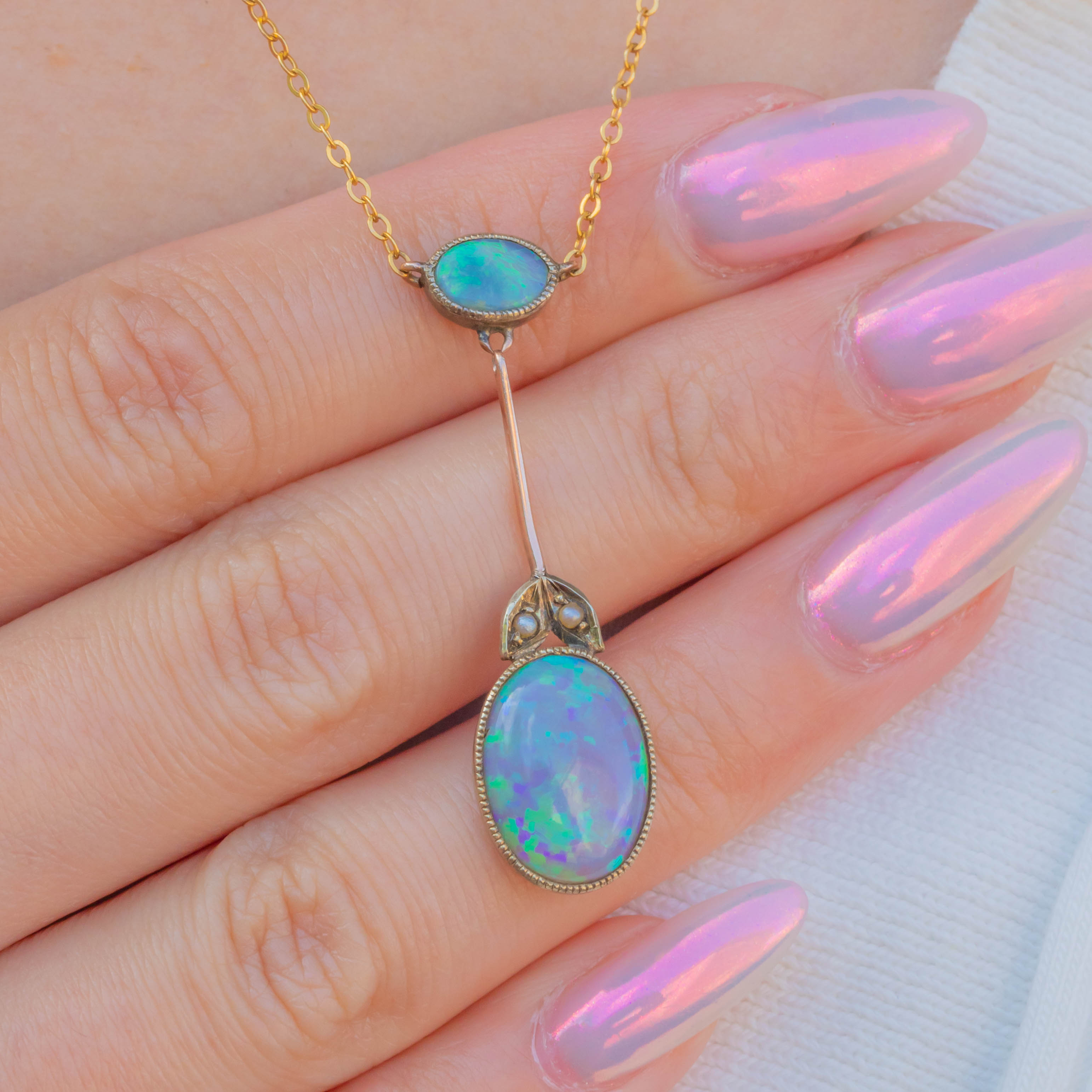 The Opals are connected by an elegant bar, fanning out at the base to create foliate details that are set with shimmering Seed Pearls. The pendant drop is suspended by a 17" chain, allowing the Opals to rest centrally across your décolletage.
