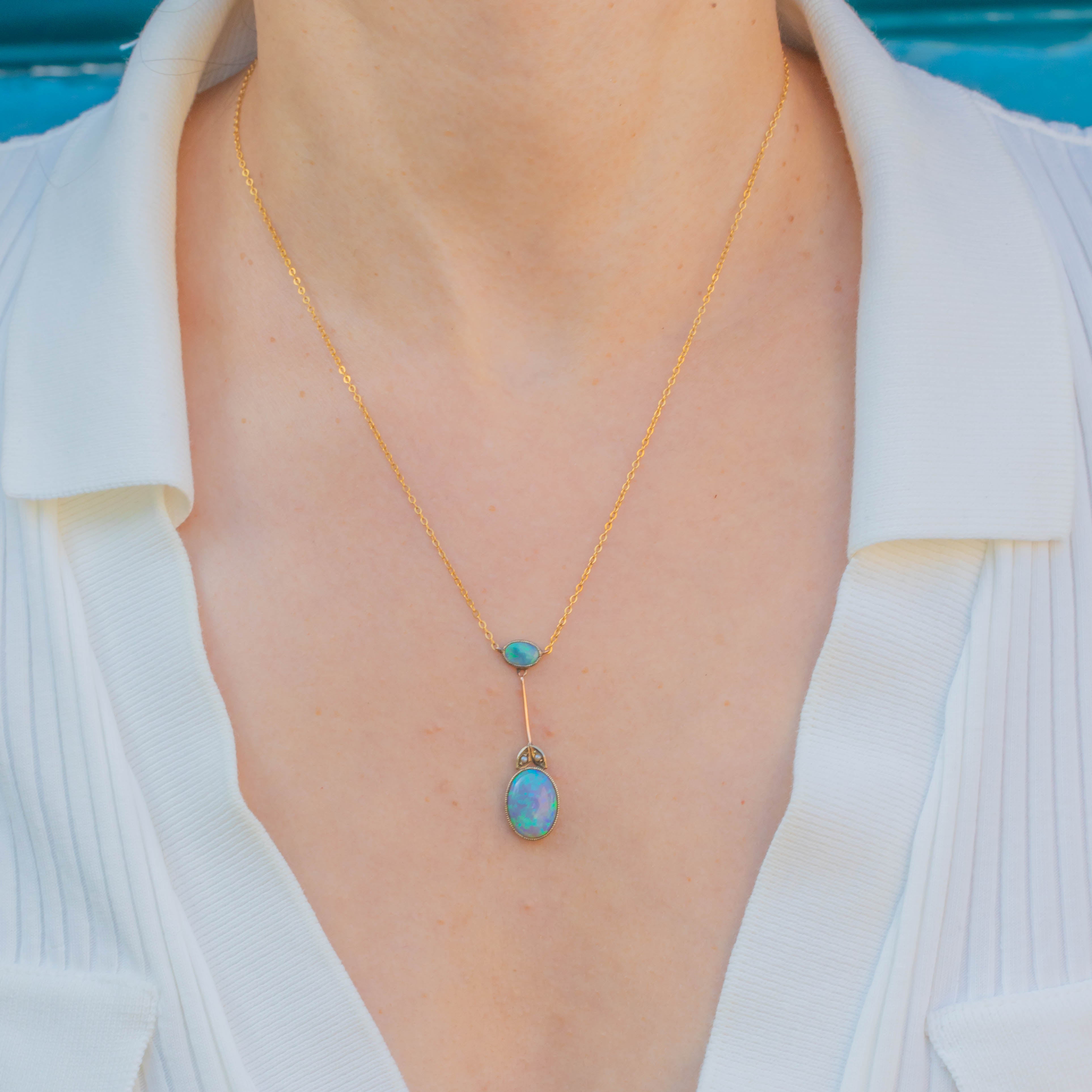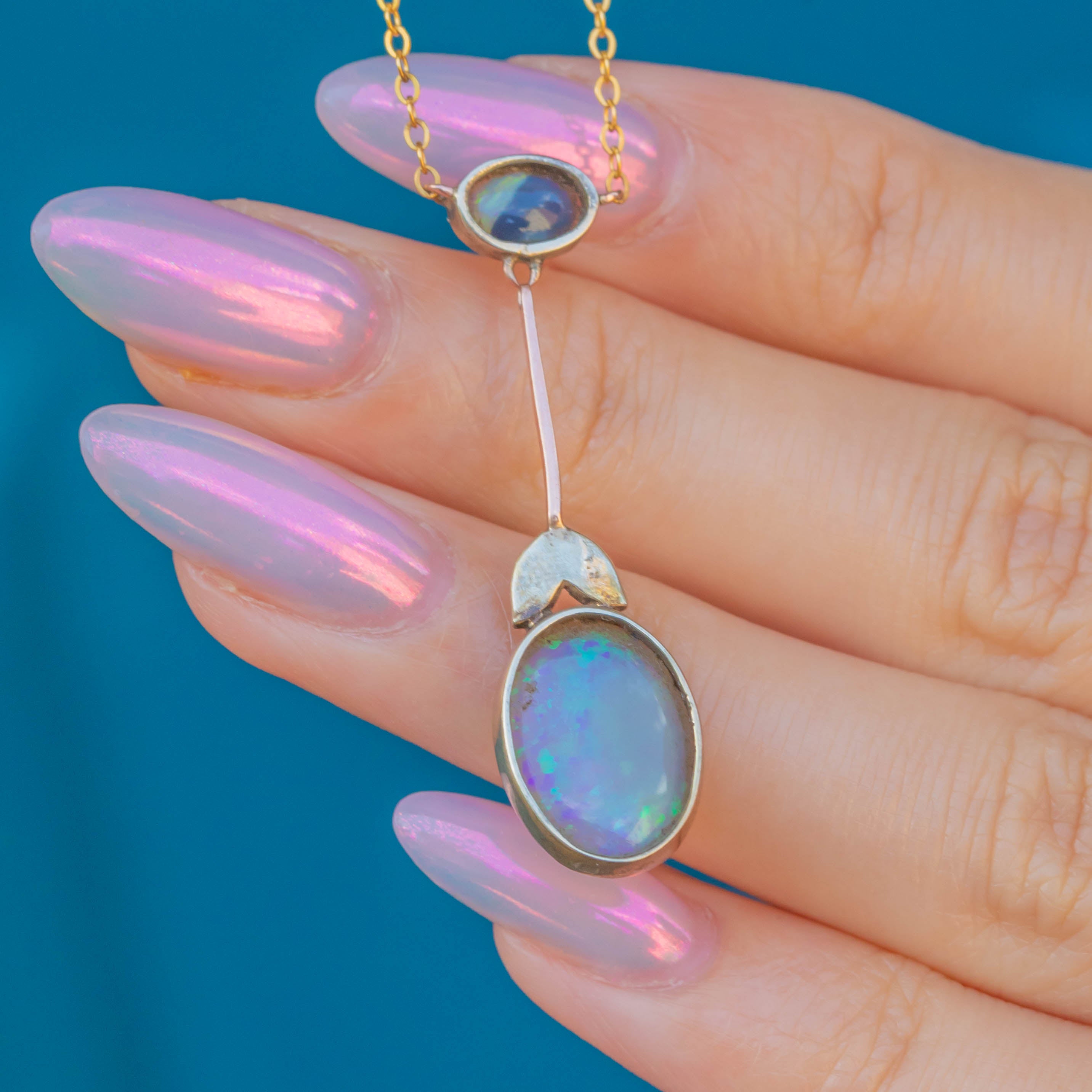 VERY GOOD: The Black Opals are smoothly domed, with no chips or scuffs, and both are secure within their bezel settings. The Gold is saturated, there is some mild surface wear throughout, including areas of discolouration, which is to be expected given the age of the piece. The chain links are securely connected, and the bolt ring is in fine working order, so you can wear this Edwradian Opal necklace with confidence!