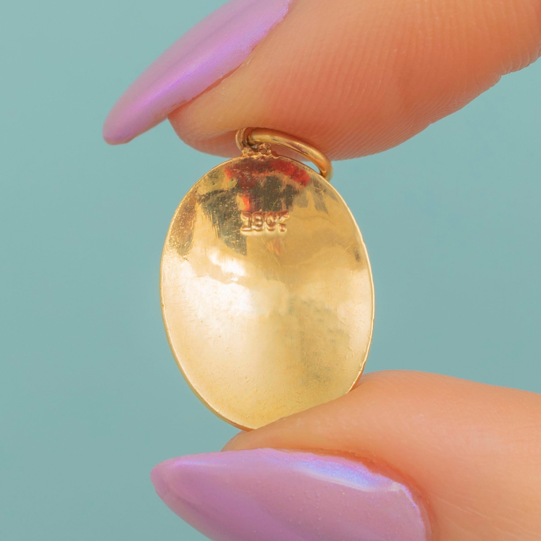 VERY GOOD. This antique 18ct Gold Blue Enamel oval pendant is in very good condition. The Gold is bright and buttery and the Enamel work is gorgeous. There are some light scratches on the surface of the Gold and a couple of minor nibbles around the edge of the Enamel. This wear is commensurate with age and is only visible under close inspection. With so much wear potential, don't hesitate to make this striking piece of Edwardian jewellery your newest acquisition!