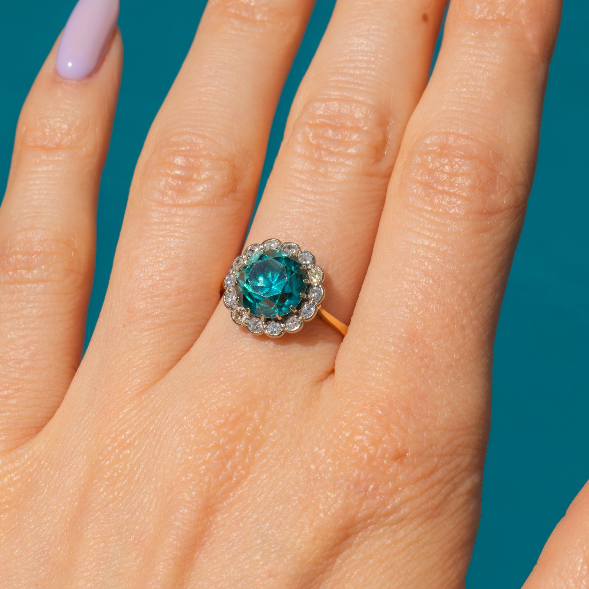 This is a striking antique 18ct Gold blue Zircon Diamond cluster ring! Home to a vivacious 4.00ct cerulean blue Zircon gemstone, this Edwardian ring is a timeless beauty that will impress wherever you take her.