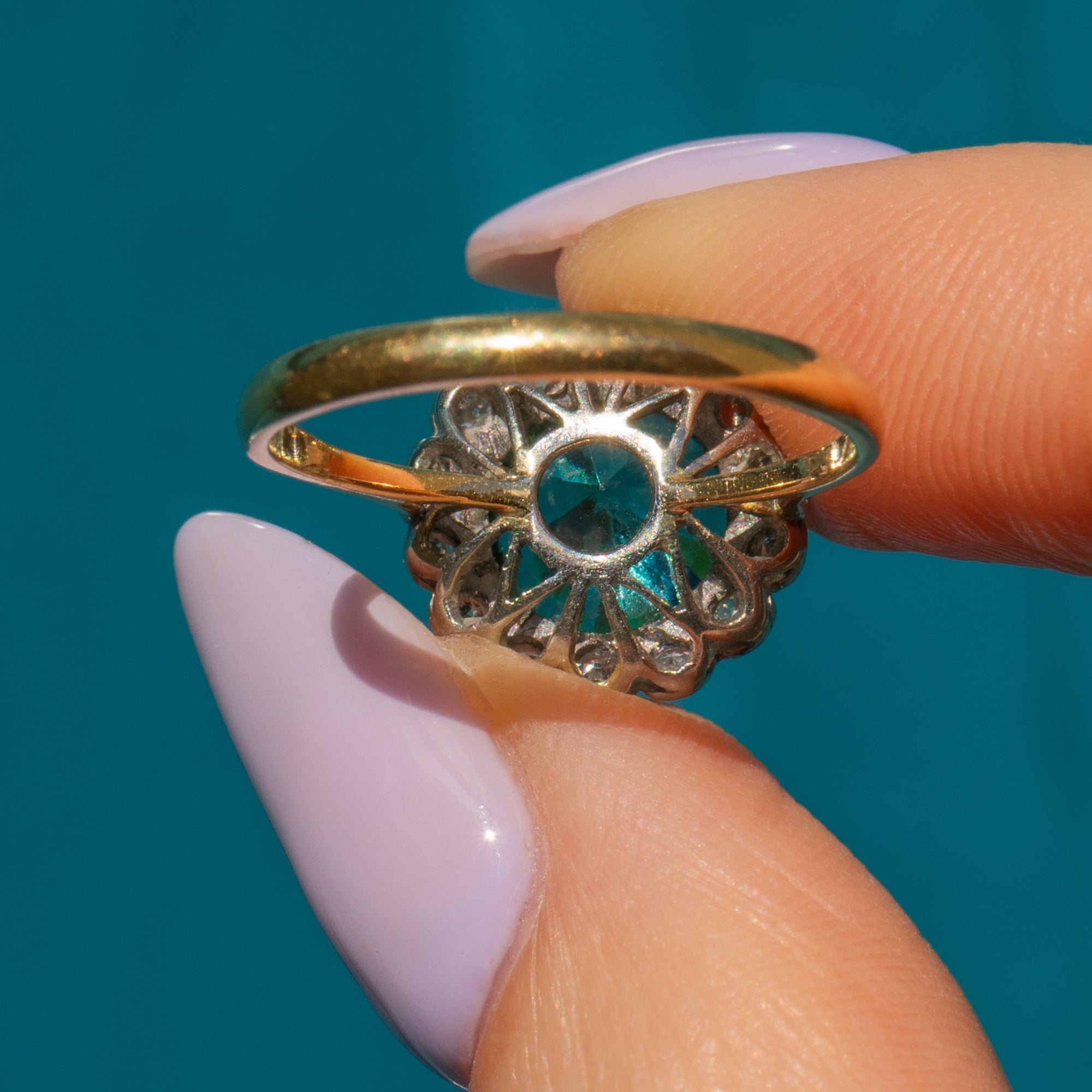 The blue Zircon gemstone is haloed by a beautifully bright selection of antique Diamonds, all set into 18ct White Gold. The band has been crafted from a rich 18ct yellow Gold, wrapping around your finger with the utmost comfort!