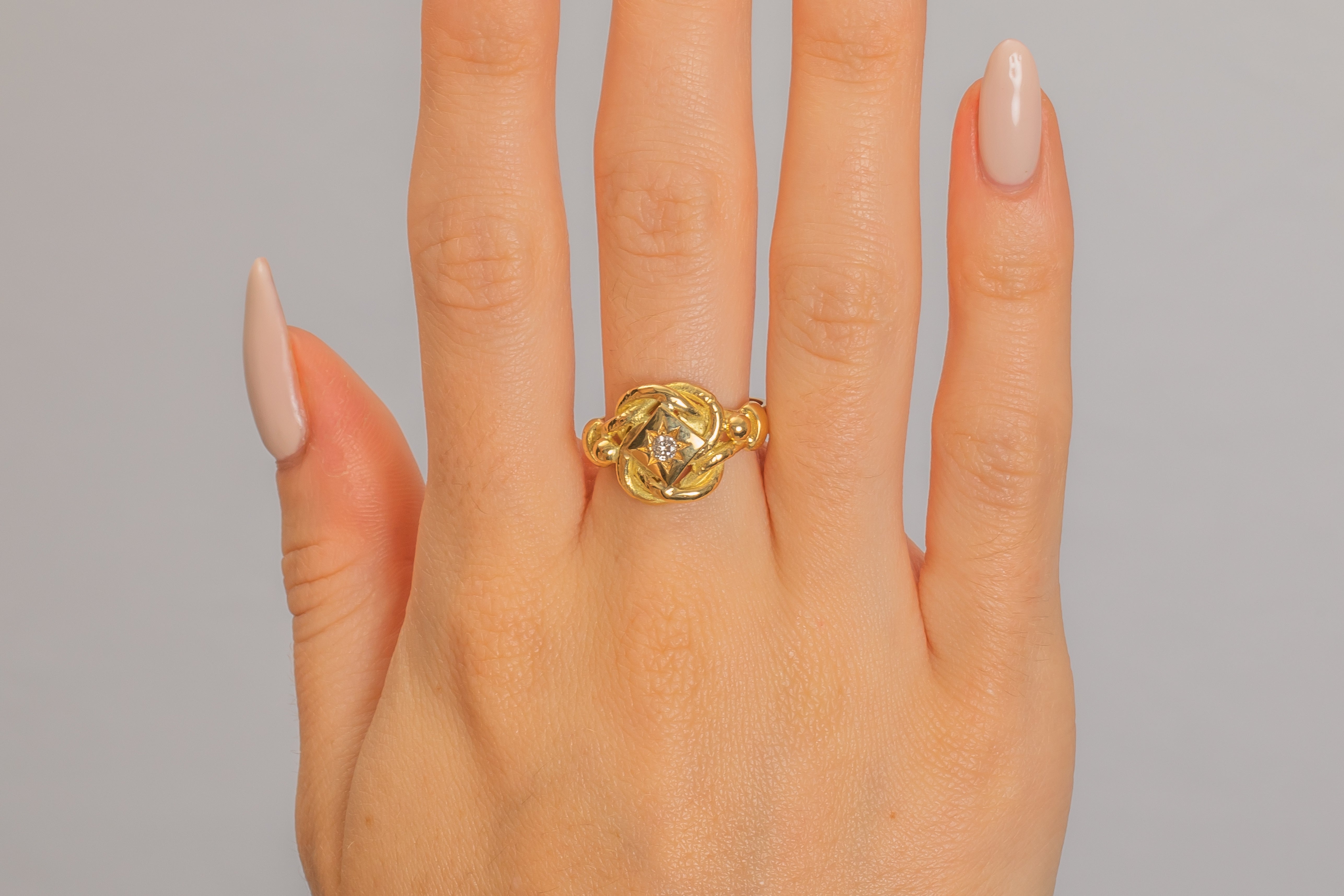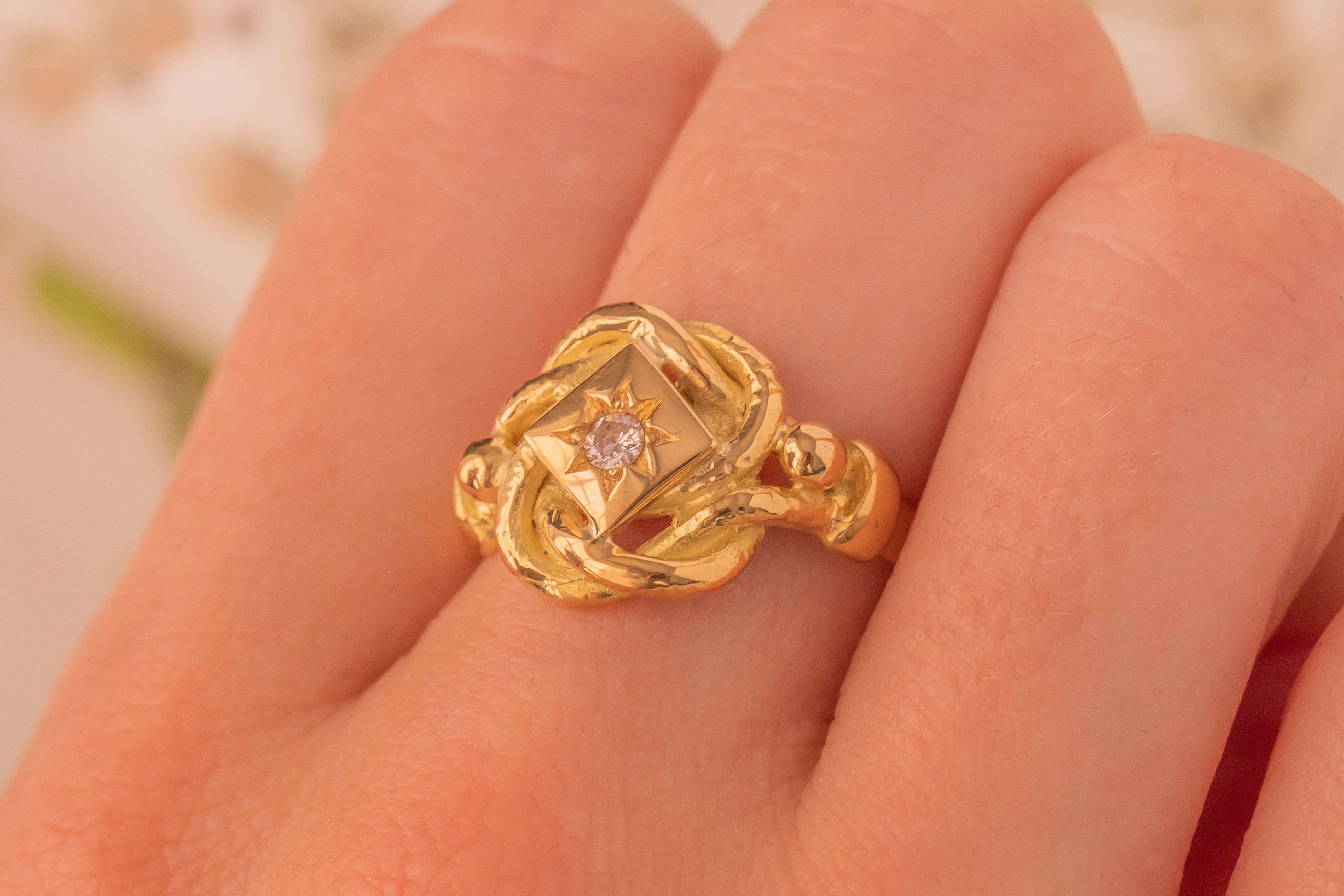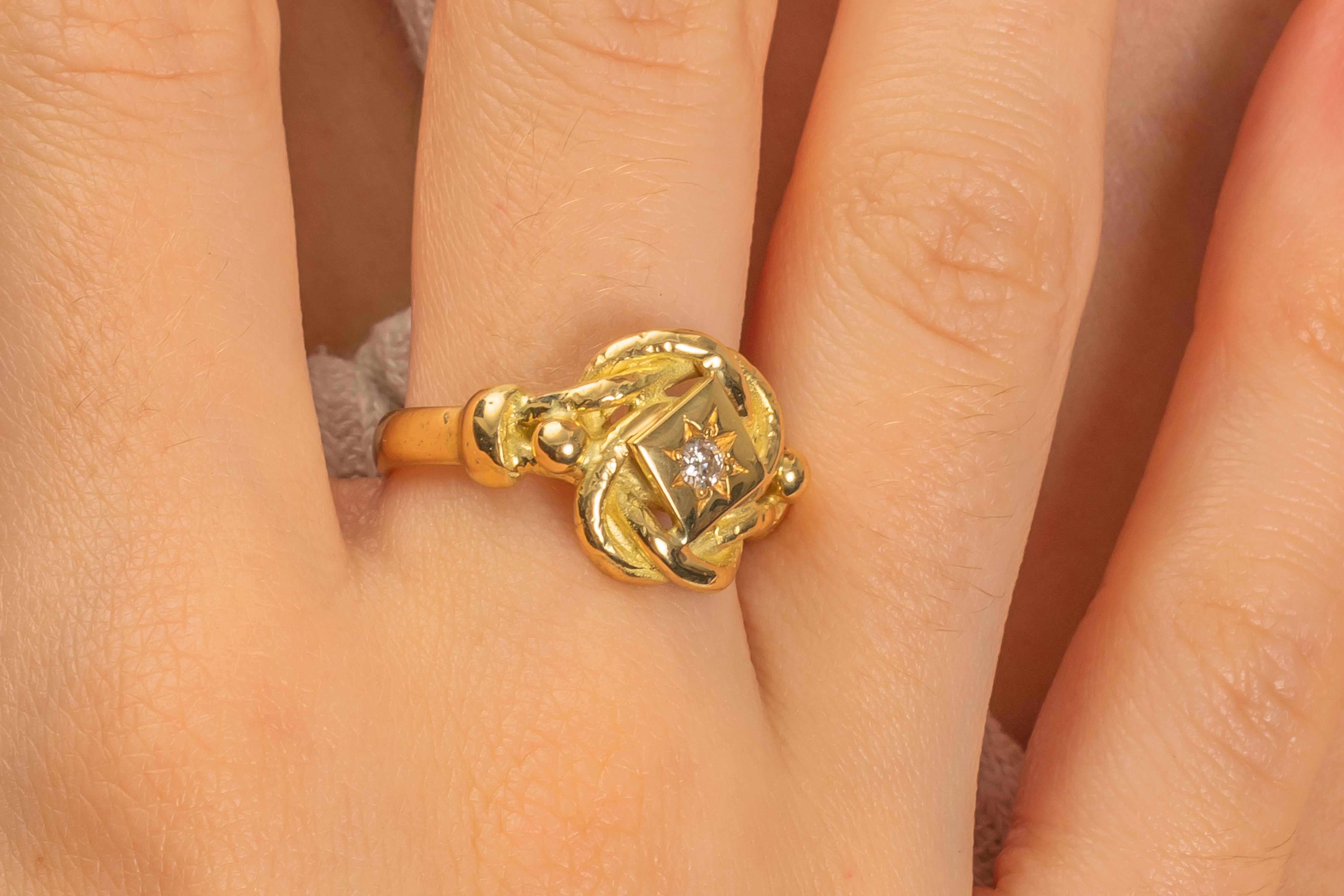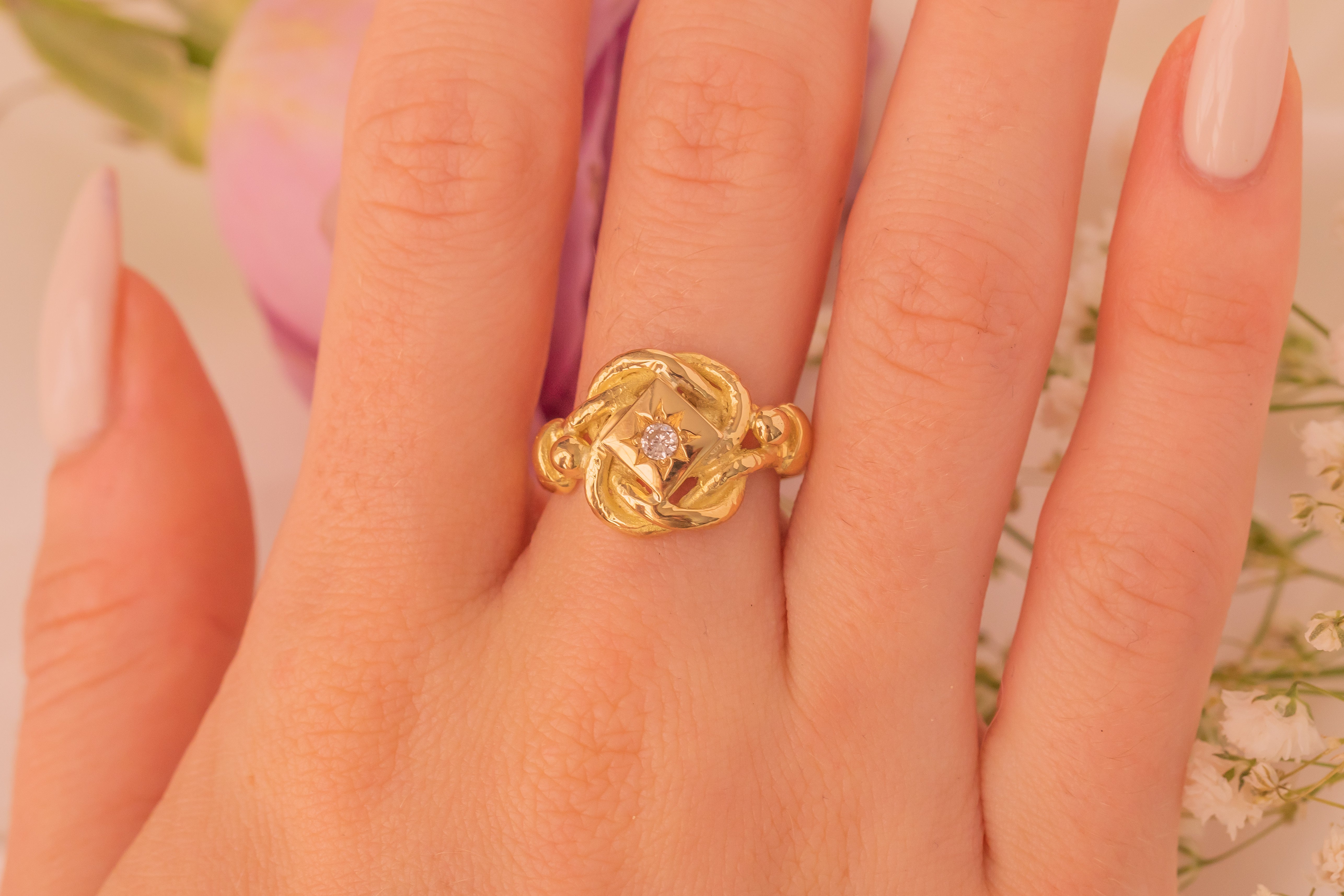 Bague ancienne lourde en or 18 carats avec nœud d'amoureux en diamant