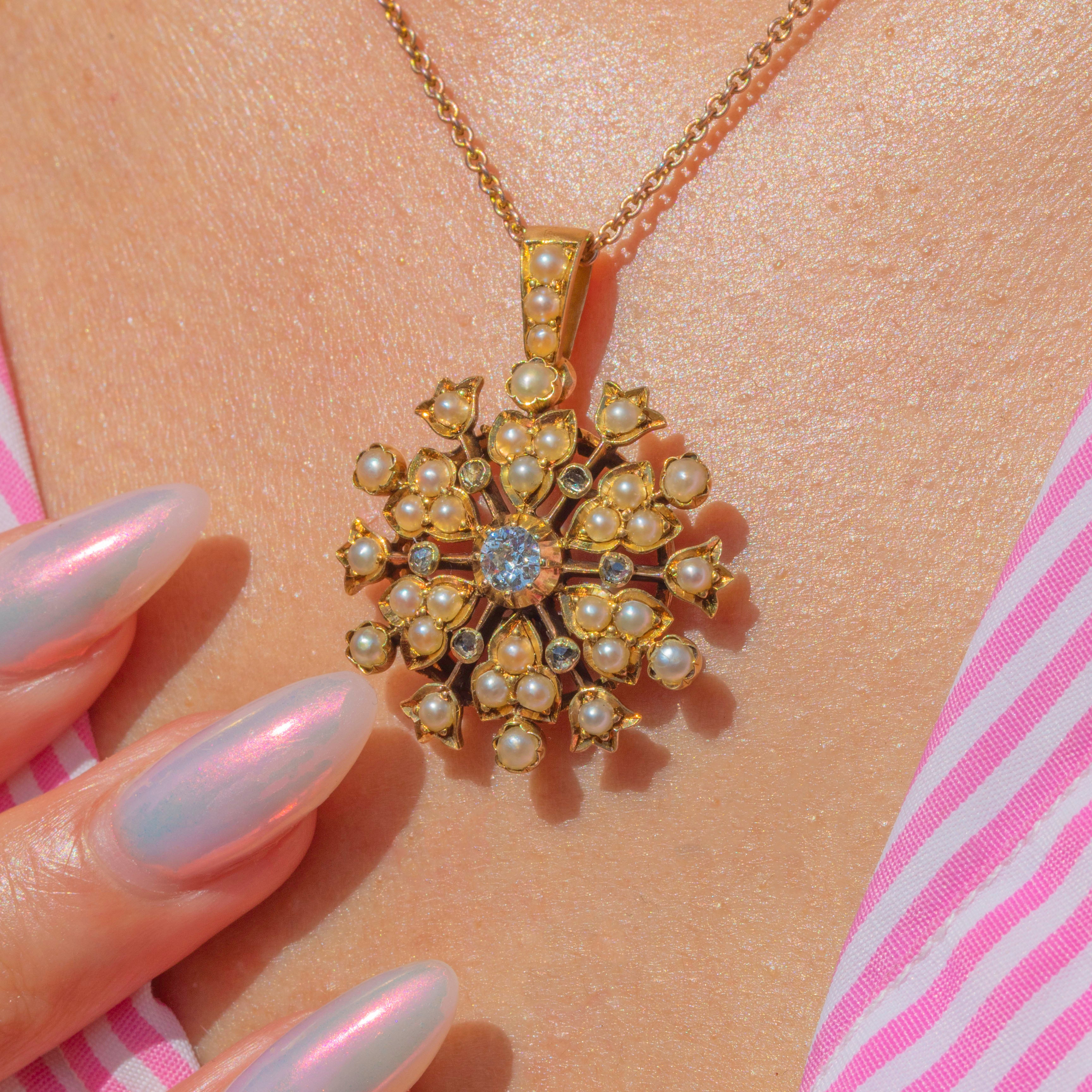 Formed from saturated 18ct Gold and bursting with 0.35cts of shimmering Diamonds and iridescent Pearls, this antique flower cluster pendant is a fine example of the intricate designs and exquisite craftsmanship of the Victorian era!
