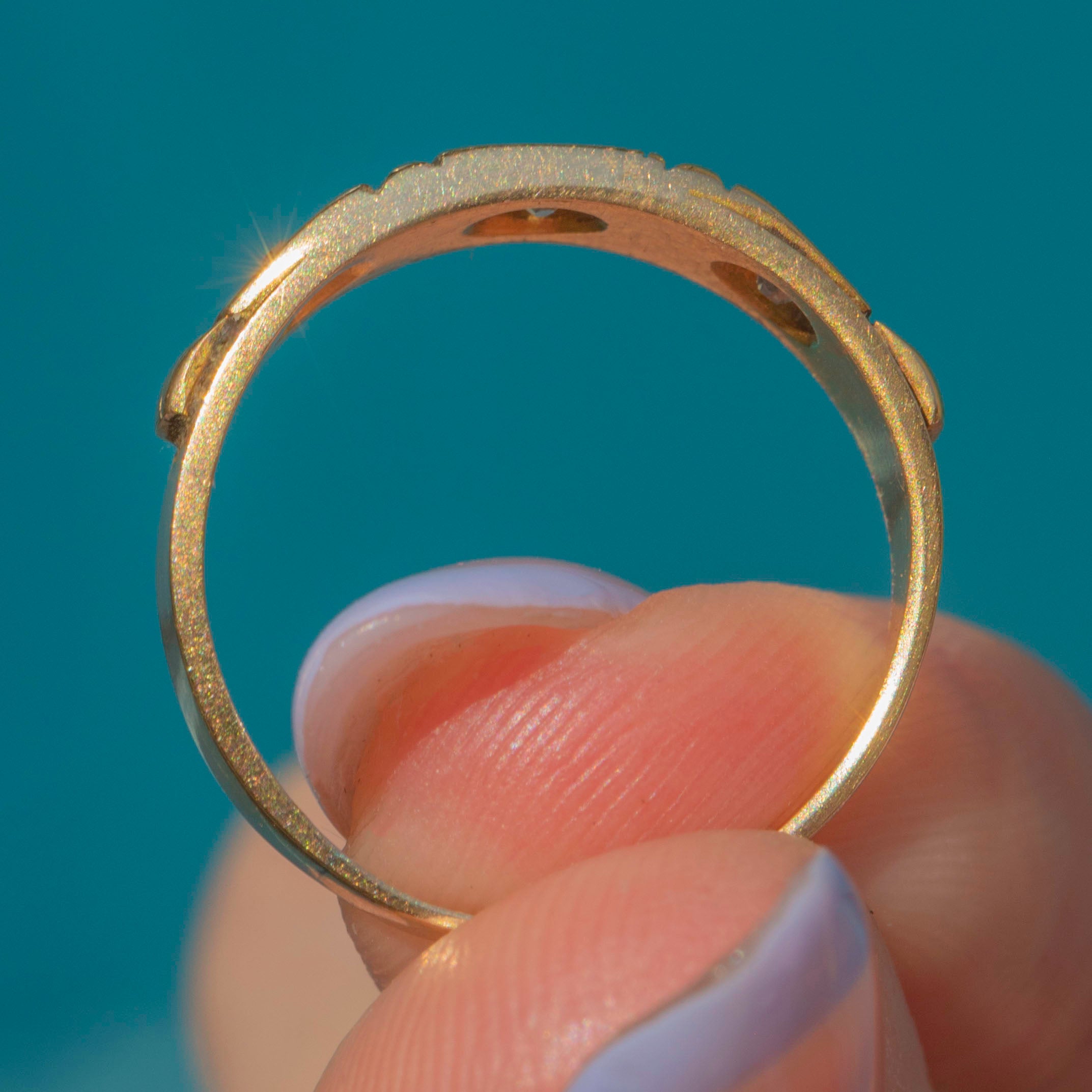 The three flush-set Diamonds add a subtle sparkling accent, displayed within star settings and geometric engraved details, giving this Victorian gypsy ring a bold look. With a low profile, you can easily style this antique Diamond ring as a standalone piece or add it to a curated ring stack!