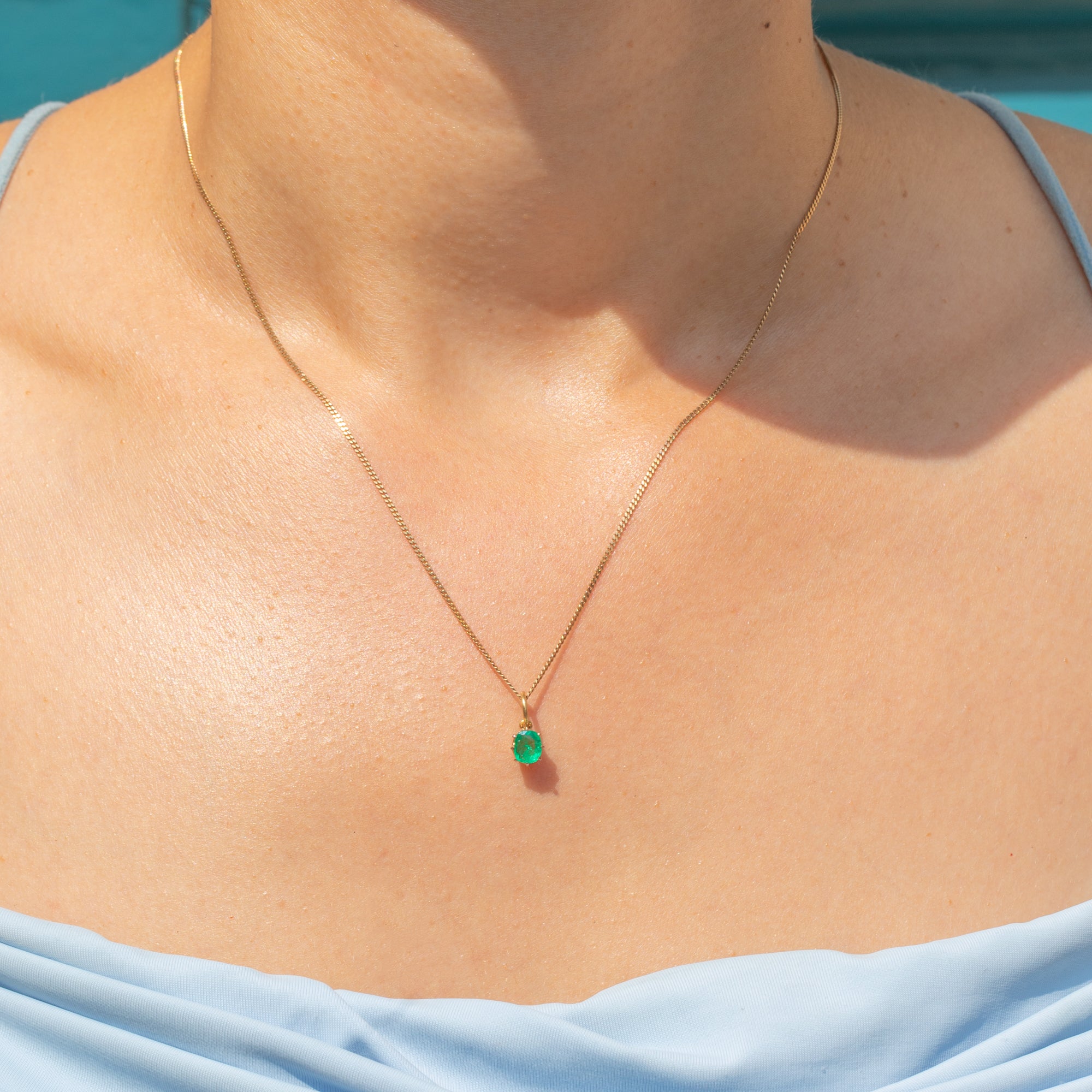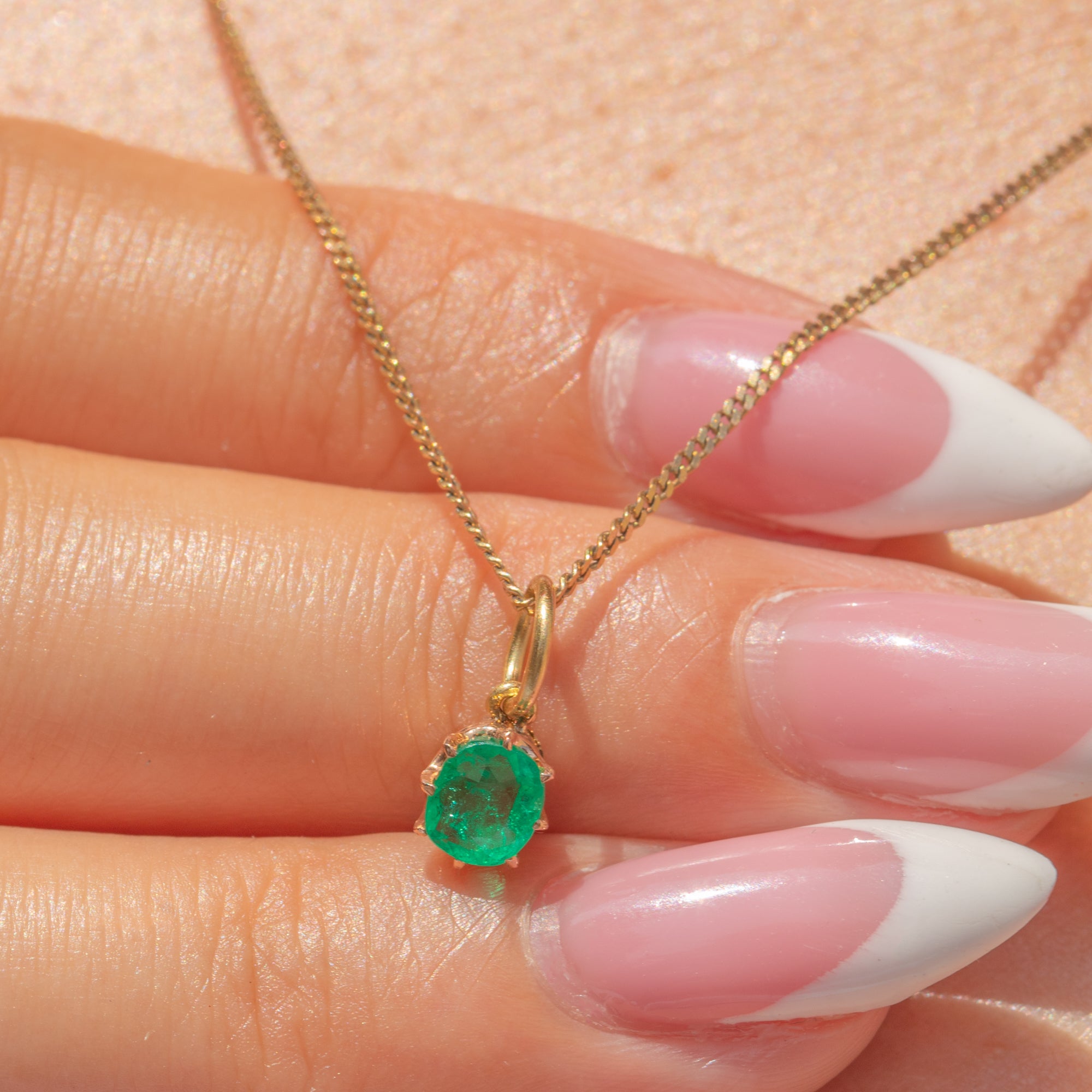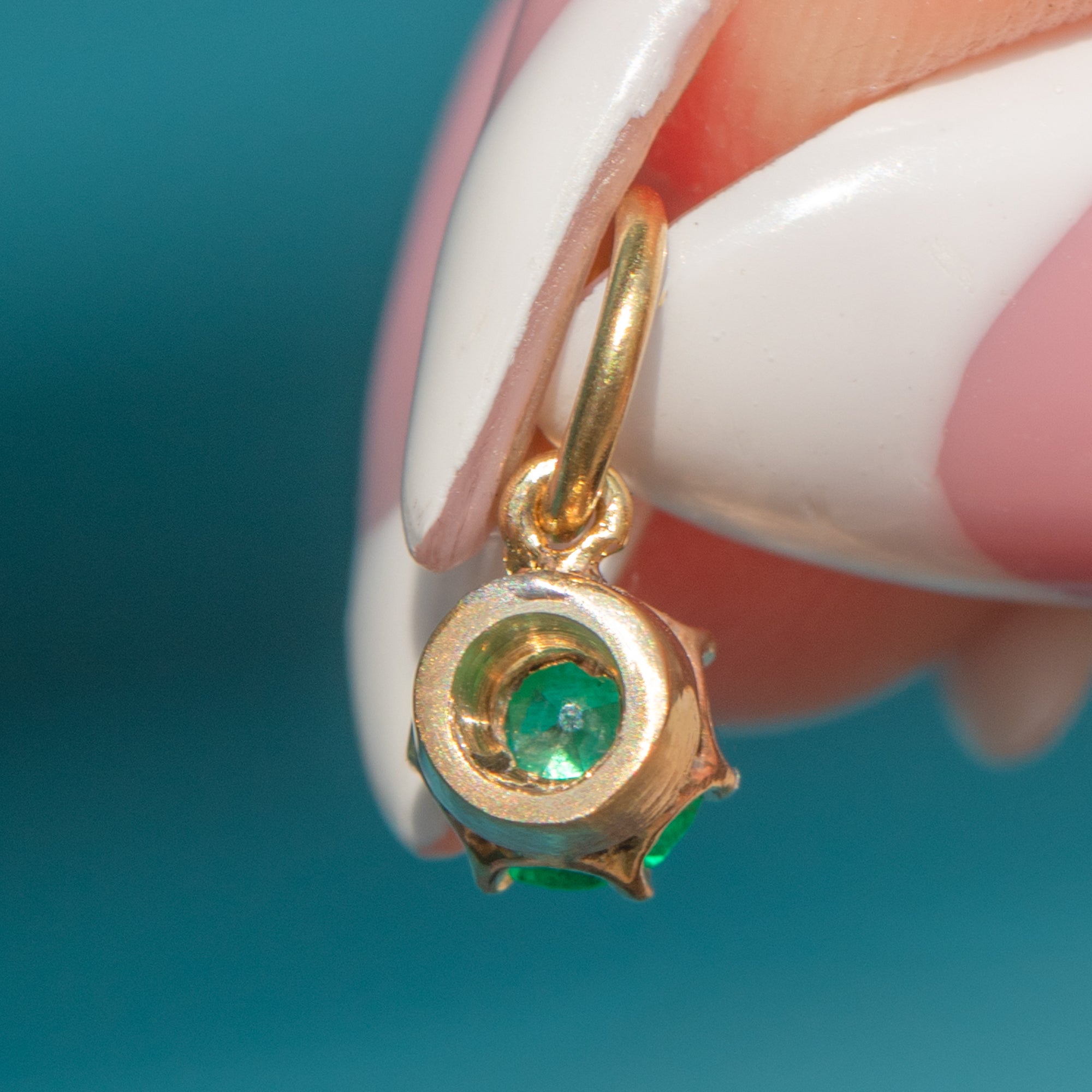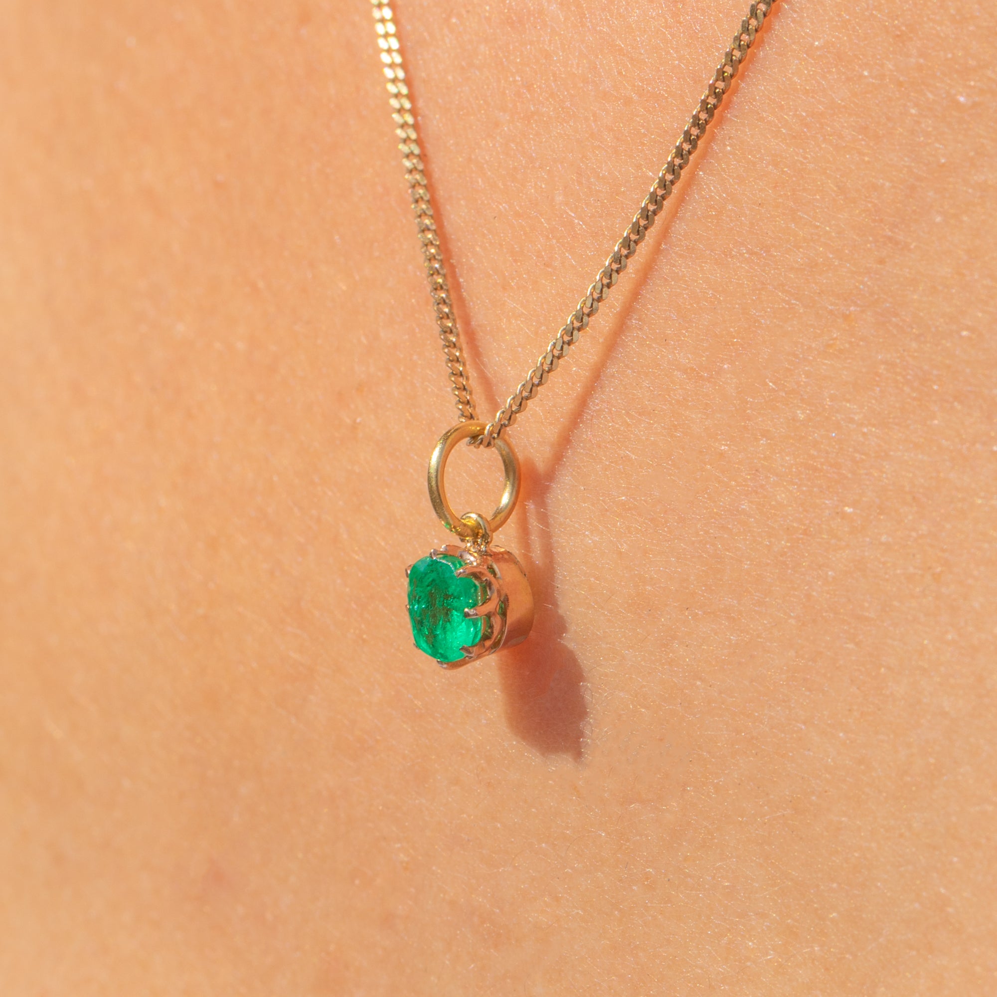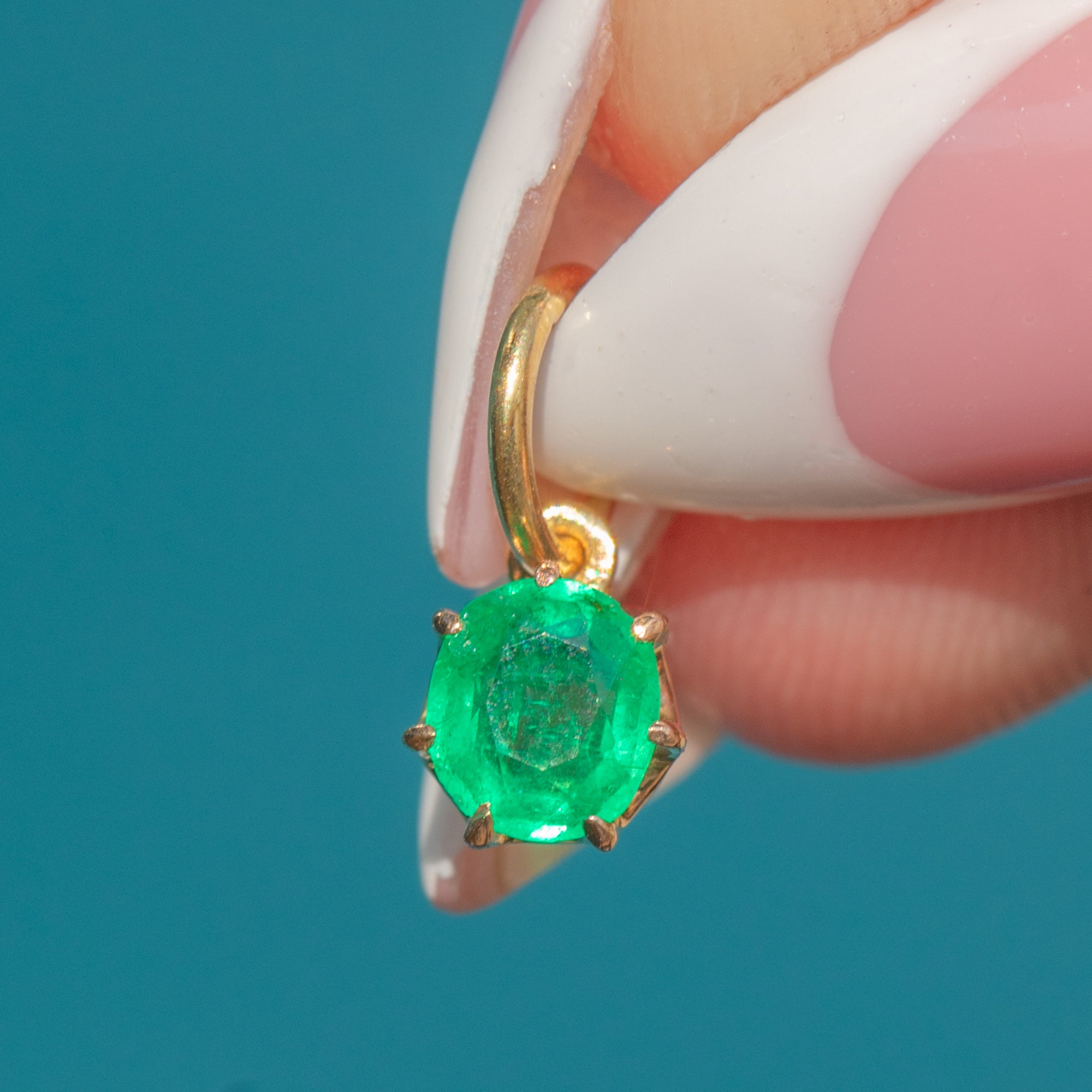 An elegant Victorian charm crafted from 18ct Gold, featuring a stunning green Emerald held in a refined claw setting. The natural inclusions highlight the authenticity and unique character of the gorgeous gemstone.