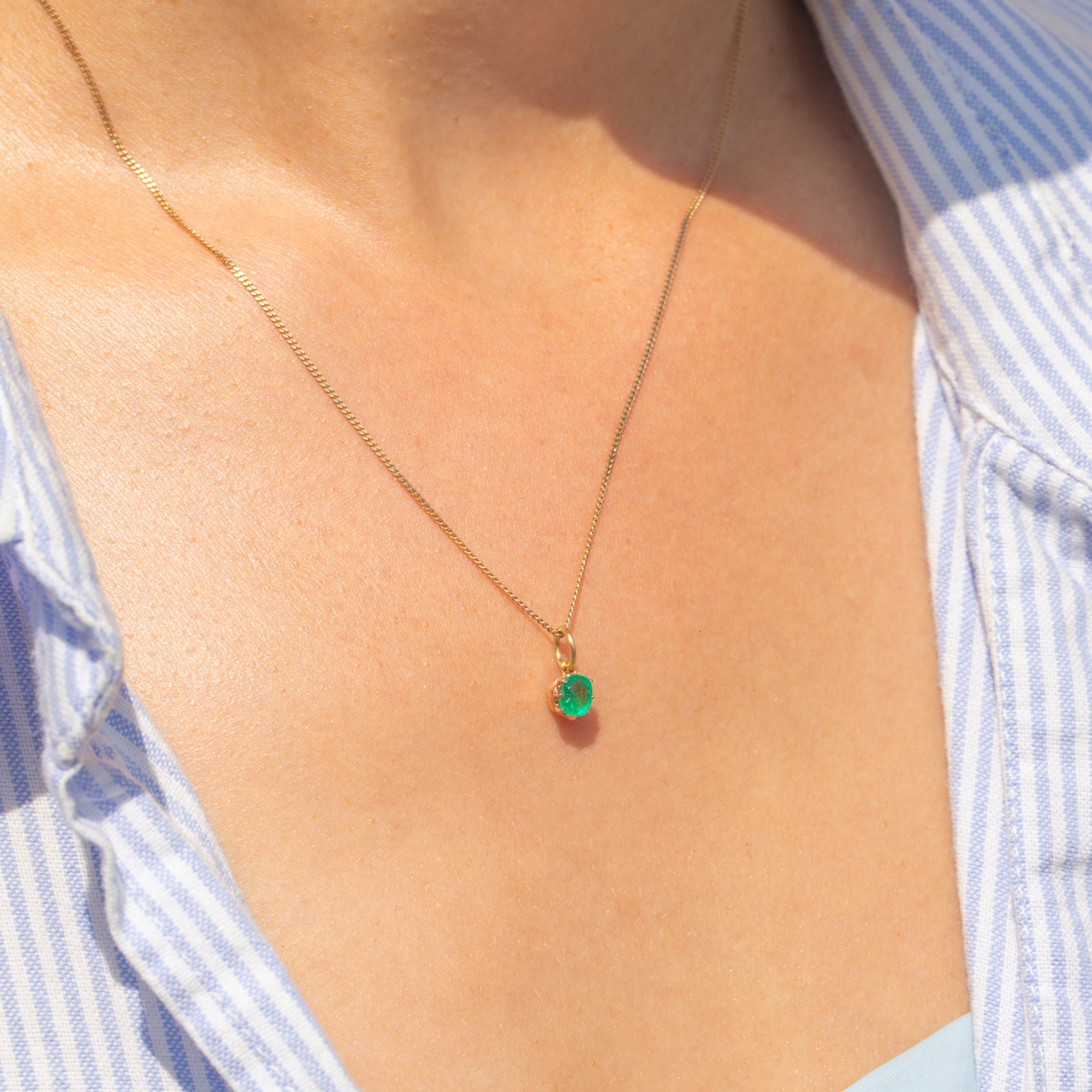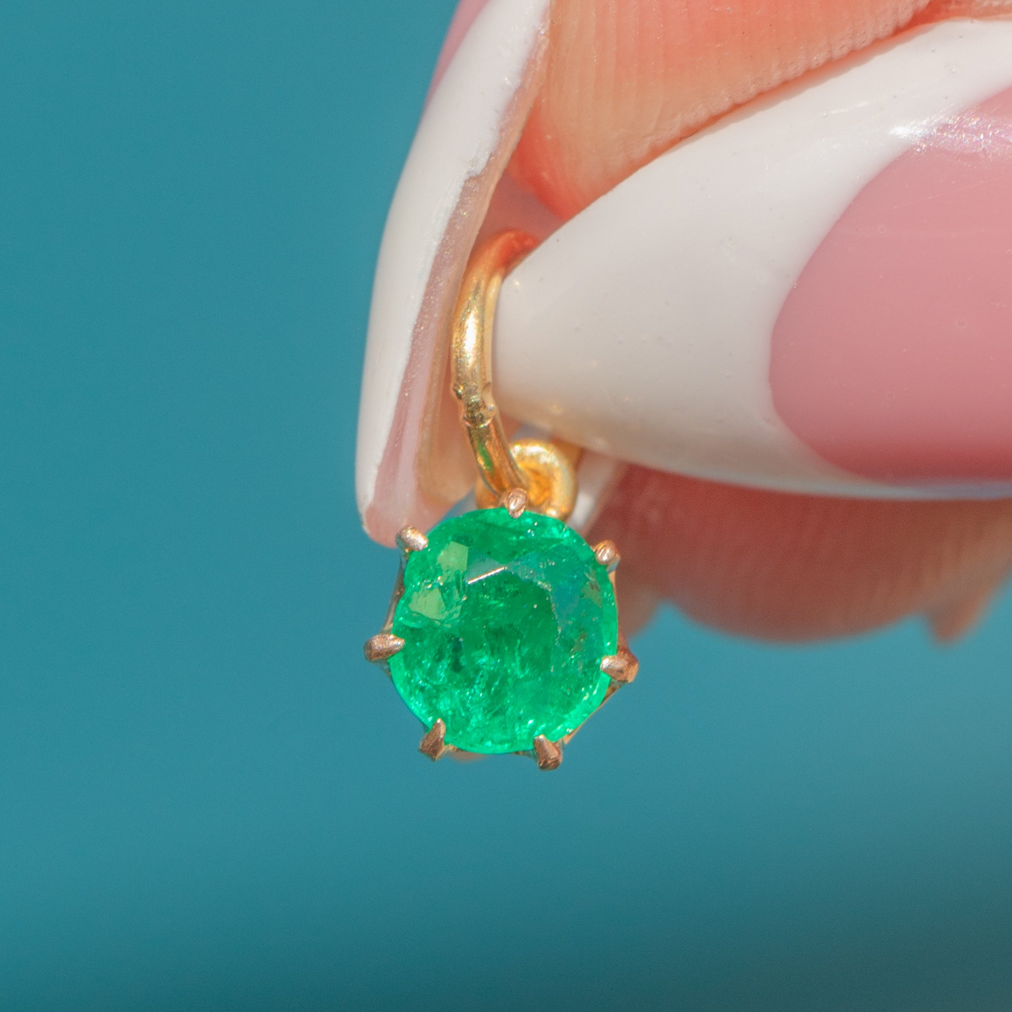 A refined Victorian charm crafted in 18ct Gold, featuring a vivid green Emerald in a classic claw setting. The stone’s natural beauty and colour are fully showcased.