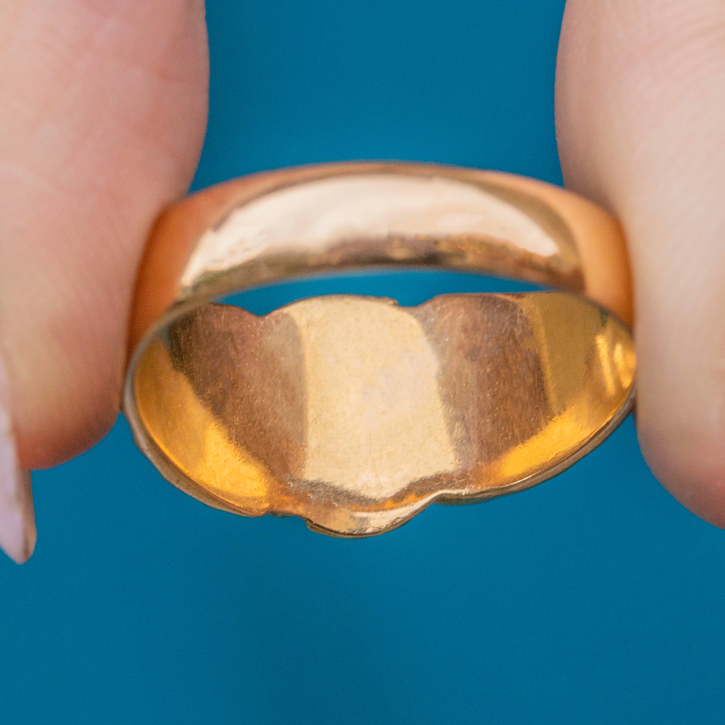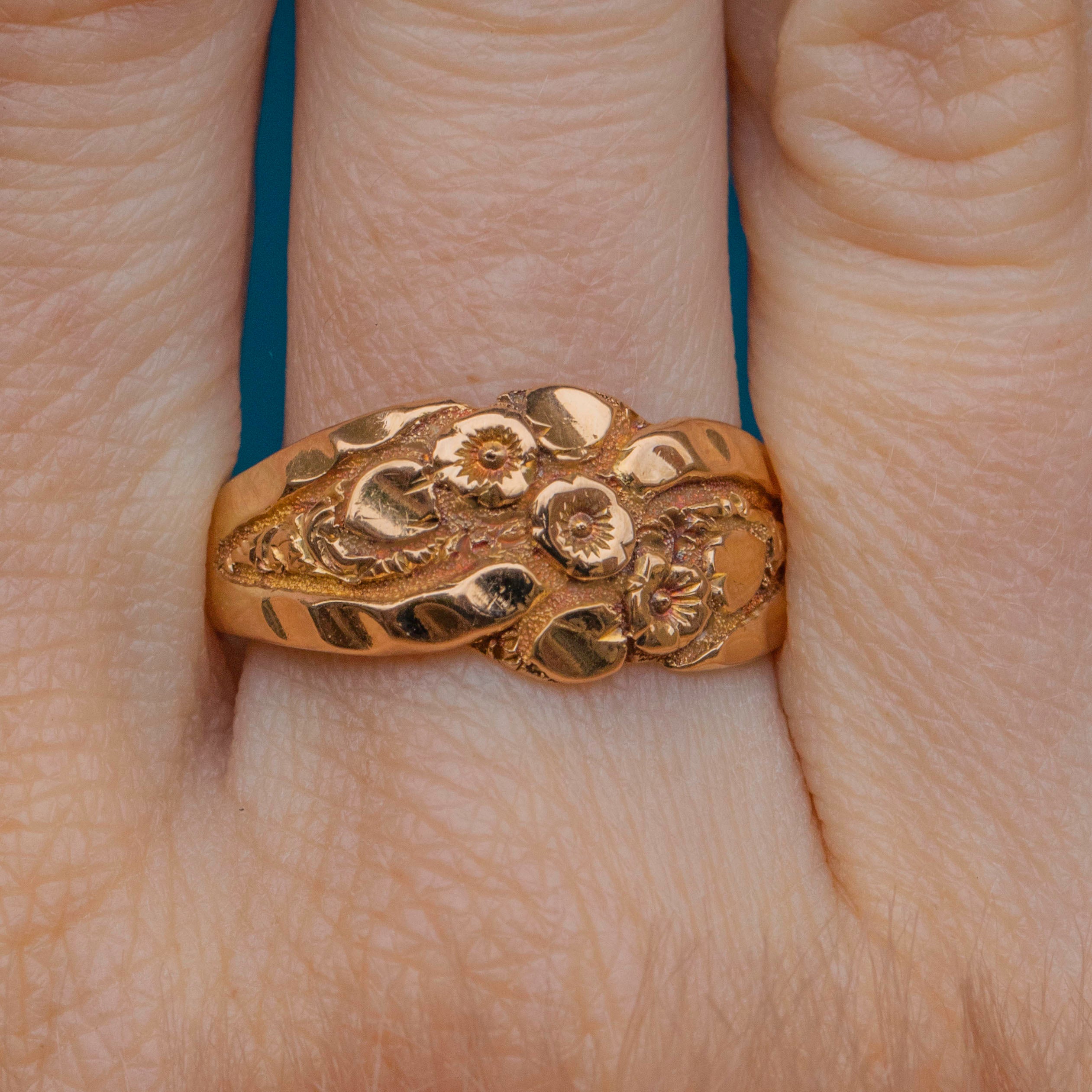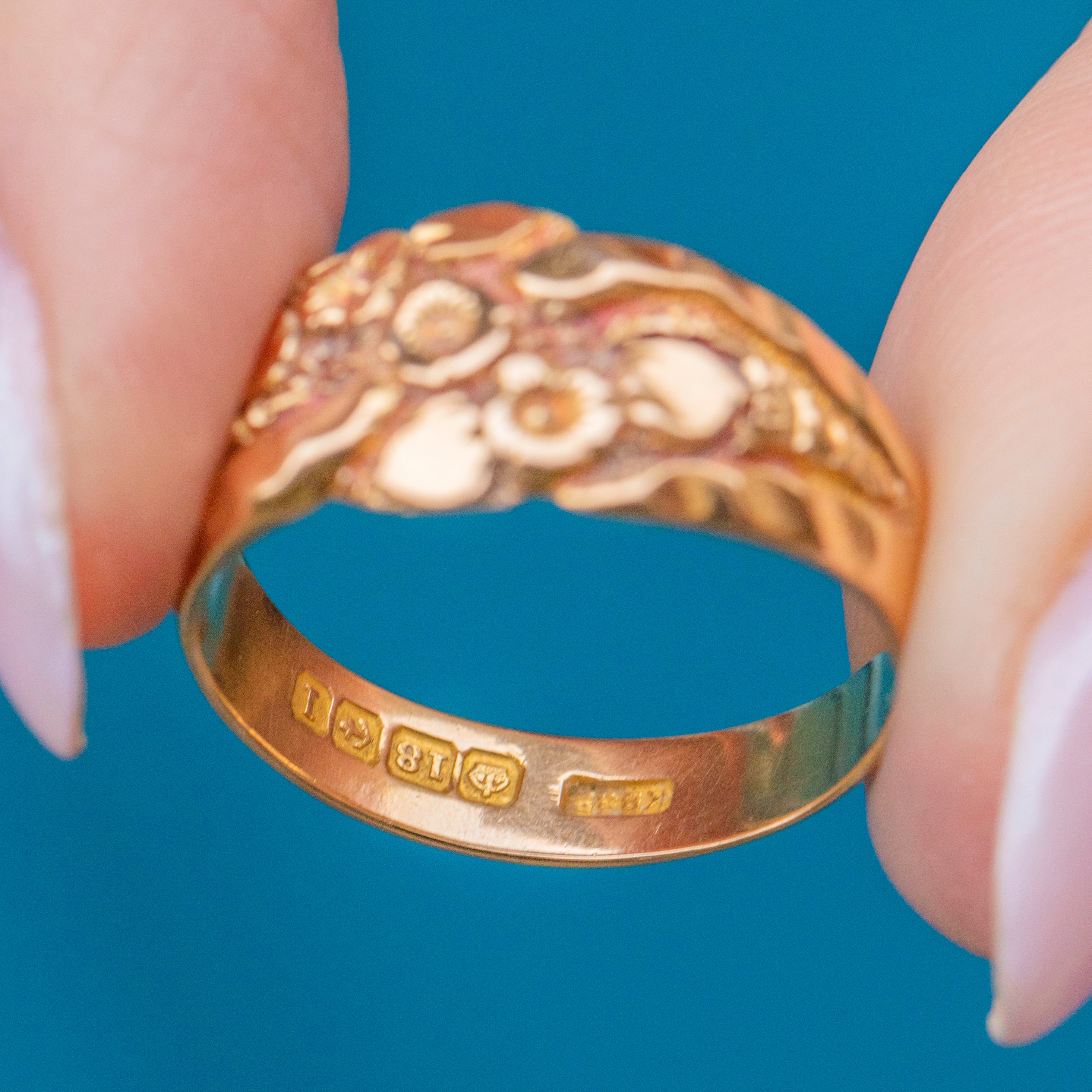 This beautiful antique 18ct Gold engraved heart forget-me-not keeper ring is bursting with romantic sentiment! Crafted from a sumptuous 18ct Gold, this Edwardian ring features sweet floral engravings symbolising everlasting love making her the perfect love token.