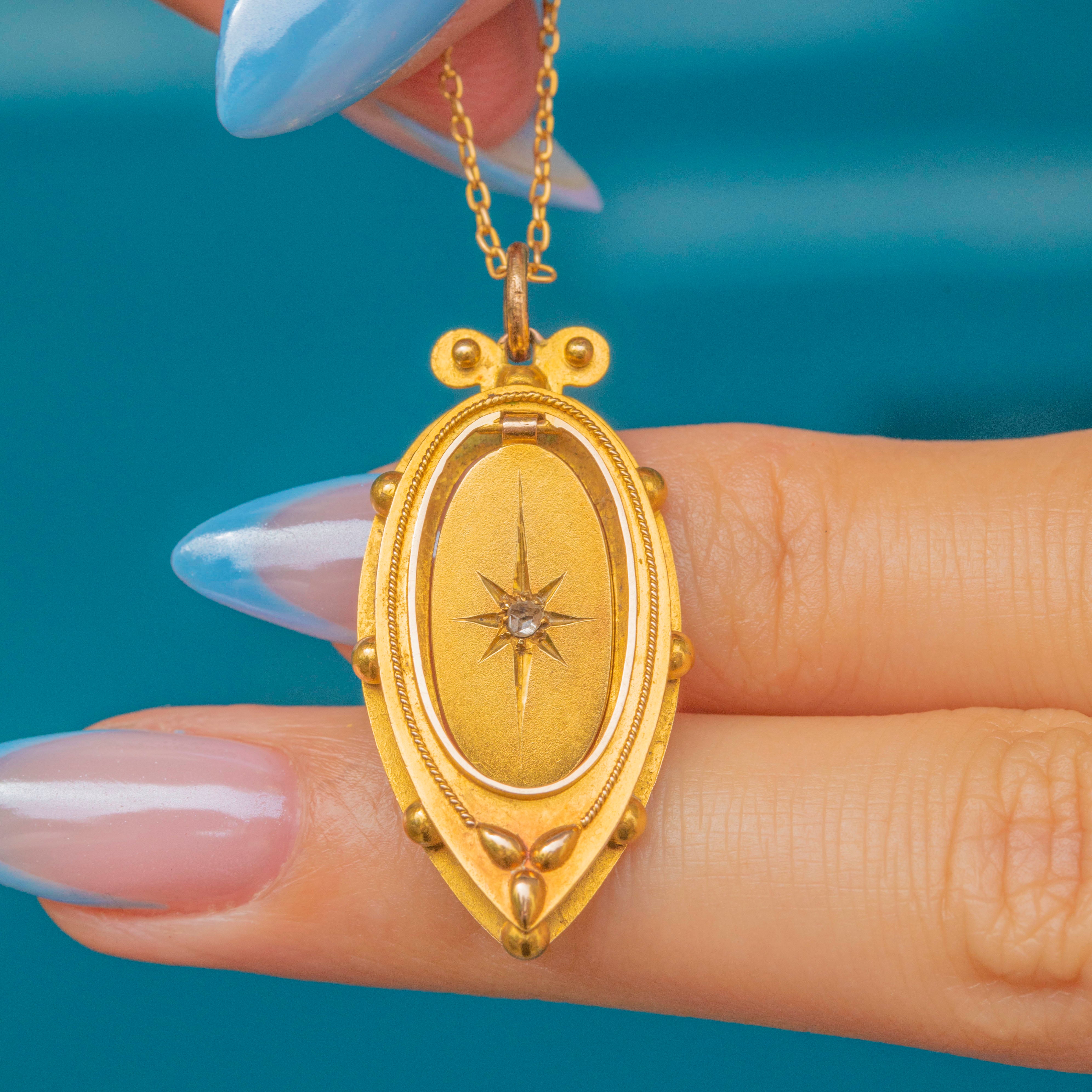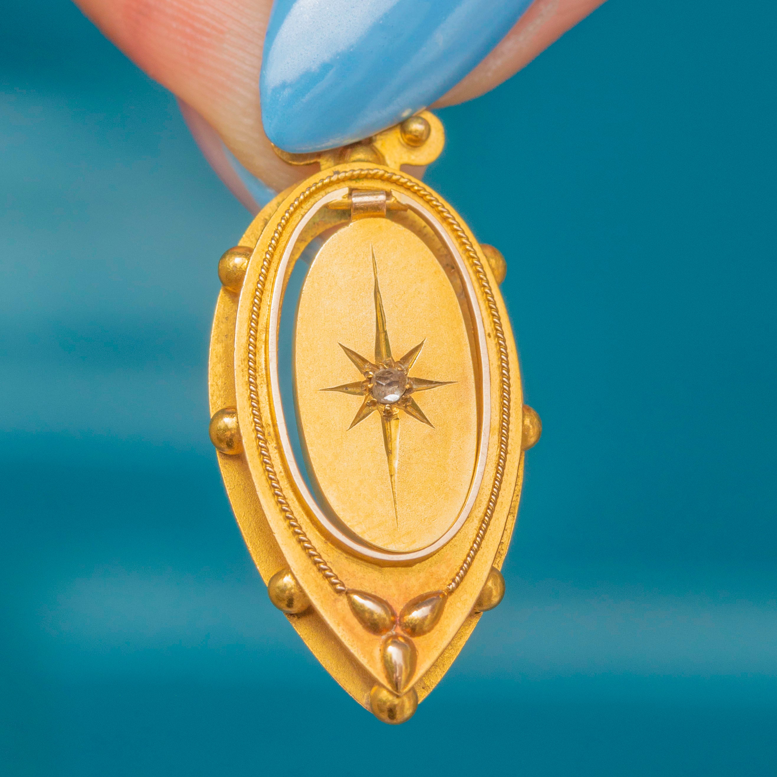 Suspended from a buttery 18ct Gold chain, this large oval Etruscan drop pendant is adorned with a sparkling rose-cut Diamond set in a charming star motif - it simply radiates celestial allure!