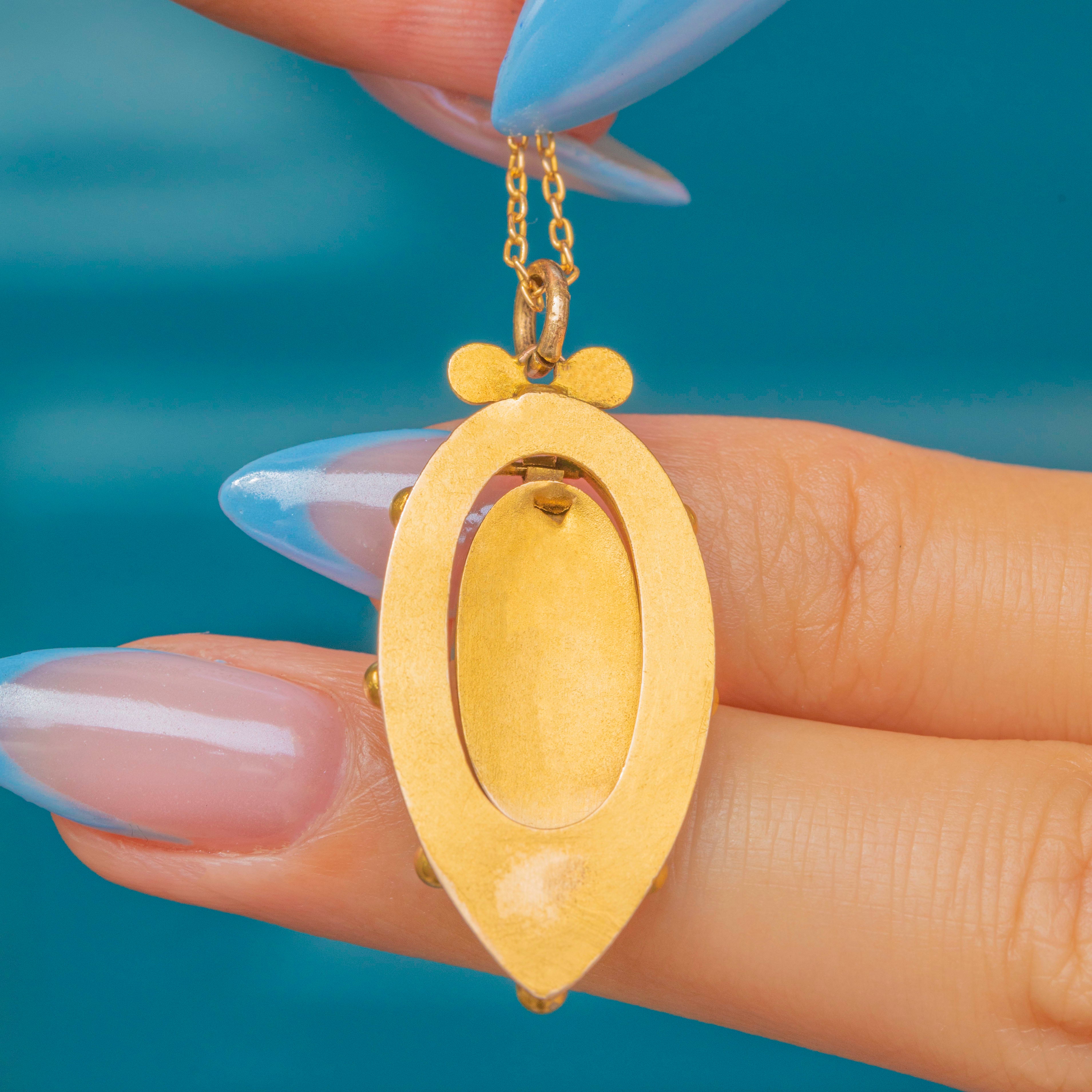 EXCELLENT: The 18ct Gold is bright and buttery, and its engravings have remained crisp. The Diamond is set securely within its settings and each of the links of the chain are uniform and secure. With its bolt ring in perfect working order, you can wear this Victorian pendant and chain with utmost confidence.