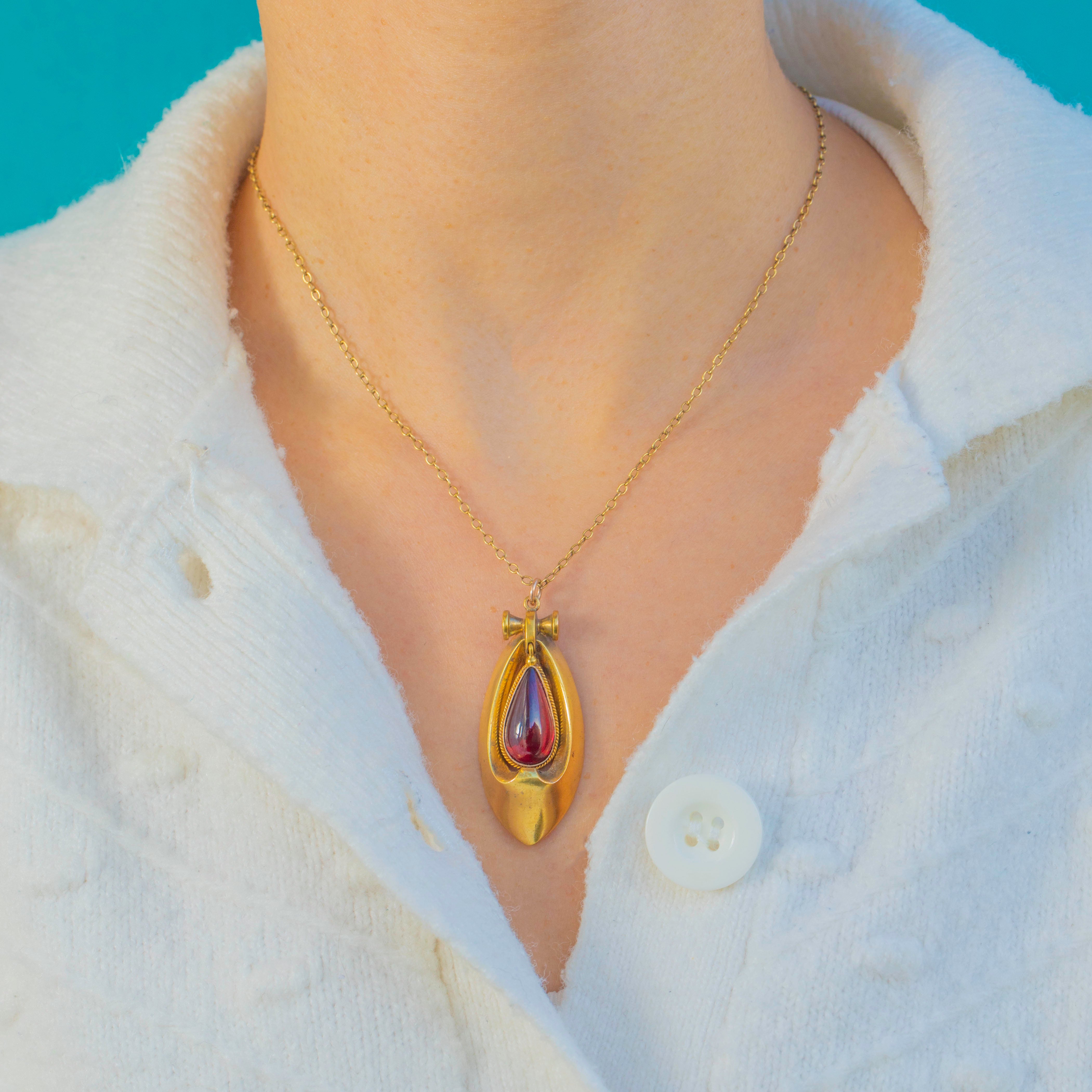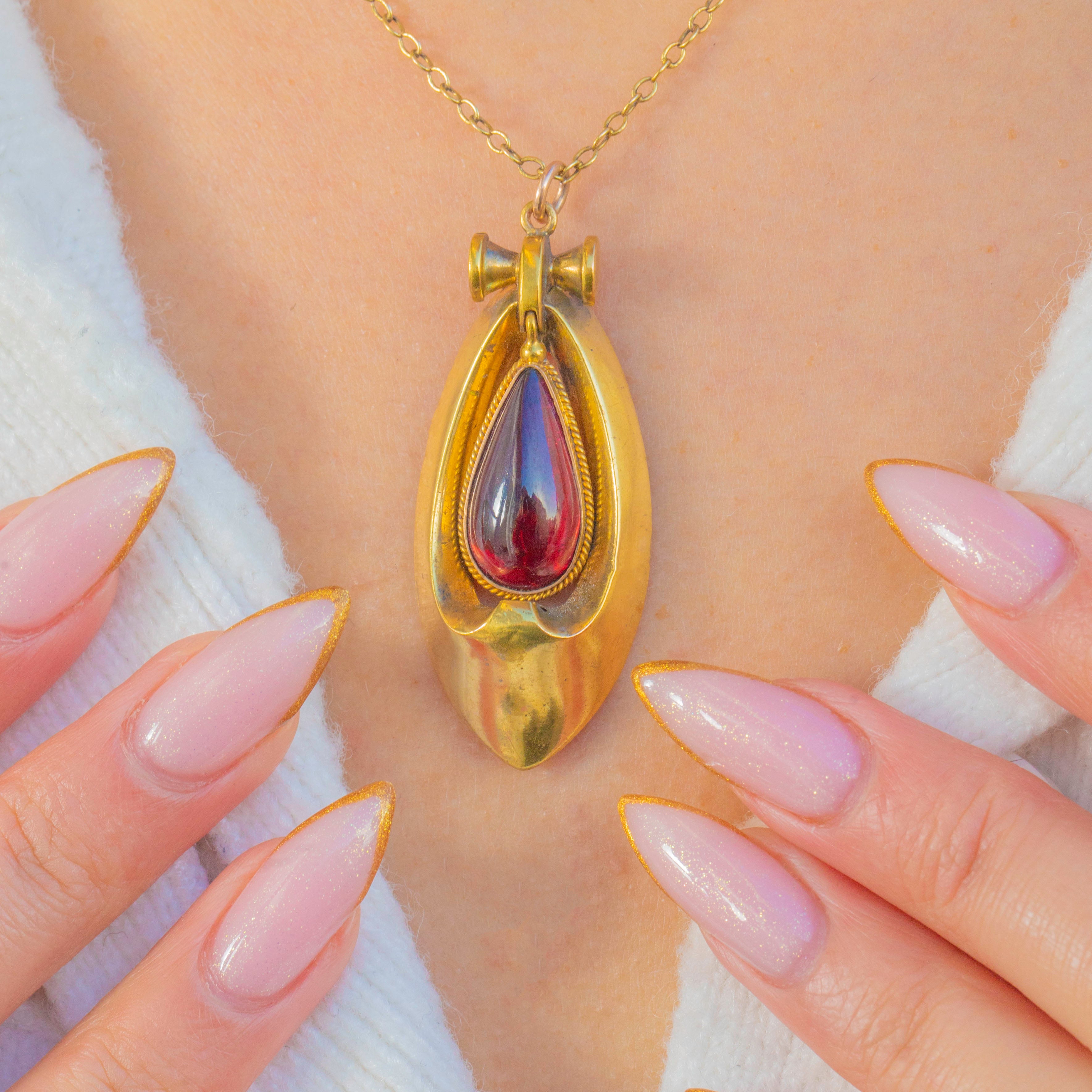 Pendentif ancien en or 18 carats style Renaissance étrusque avec grenat, 1884 Article ajouté