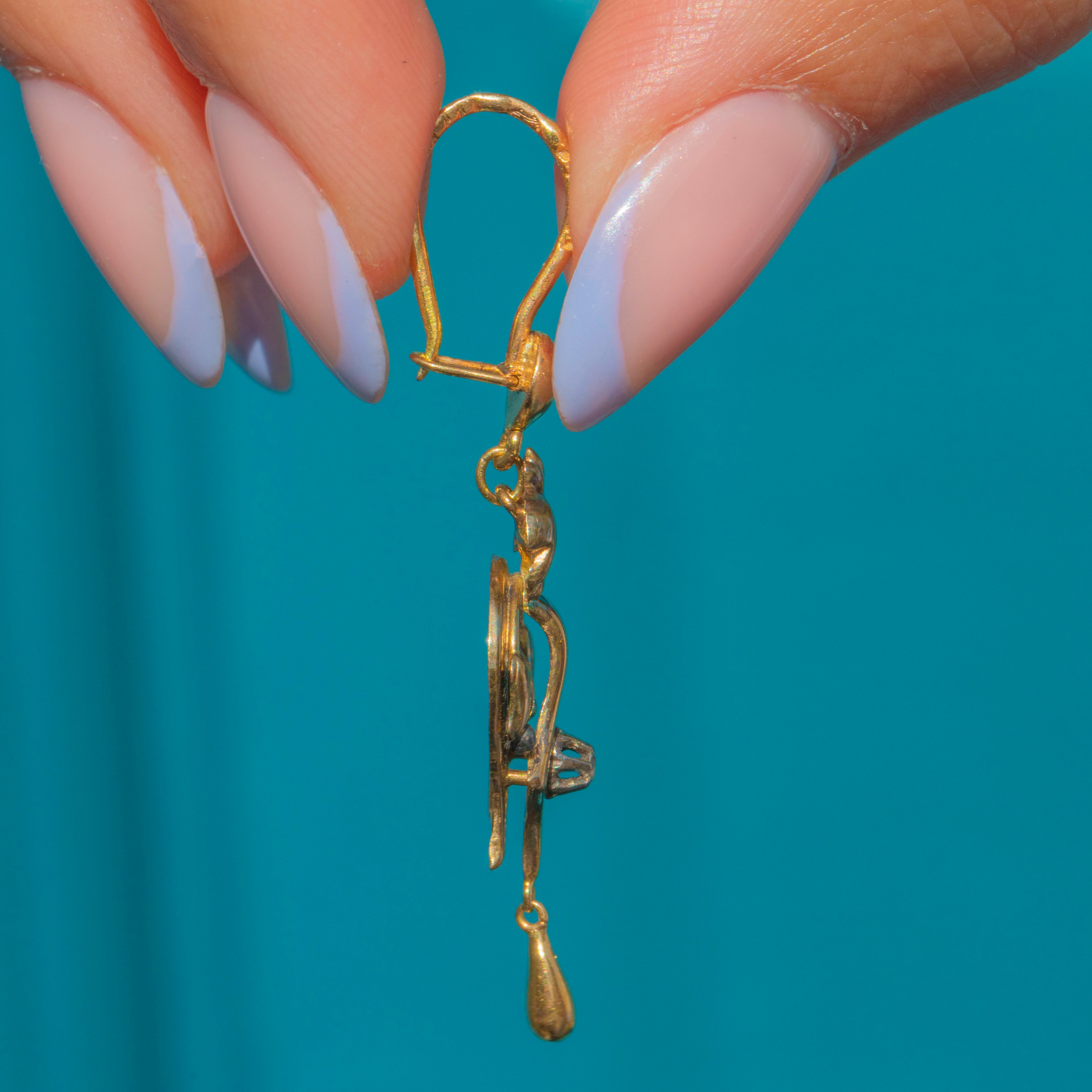 GOOD-VERY GOOD: These Victorian 18ct Gold floral Diamond drop earrings are in good condition. Each earring has formed beautifully and the Gold is buttery. There are some notable signs of wear and discolouration to the Gold, commensurate with age. The Diamonds are securely set and with her lever backs in perfect working order, they can be worn with utmost confidence.