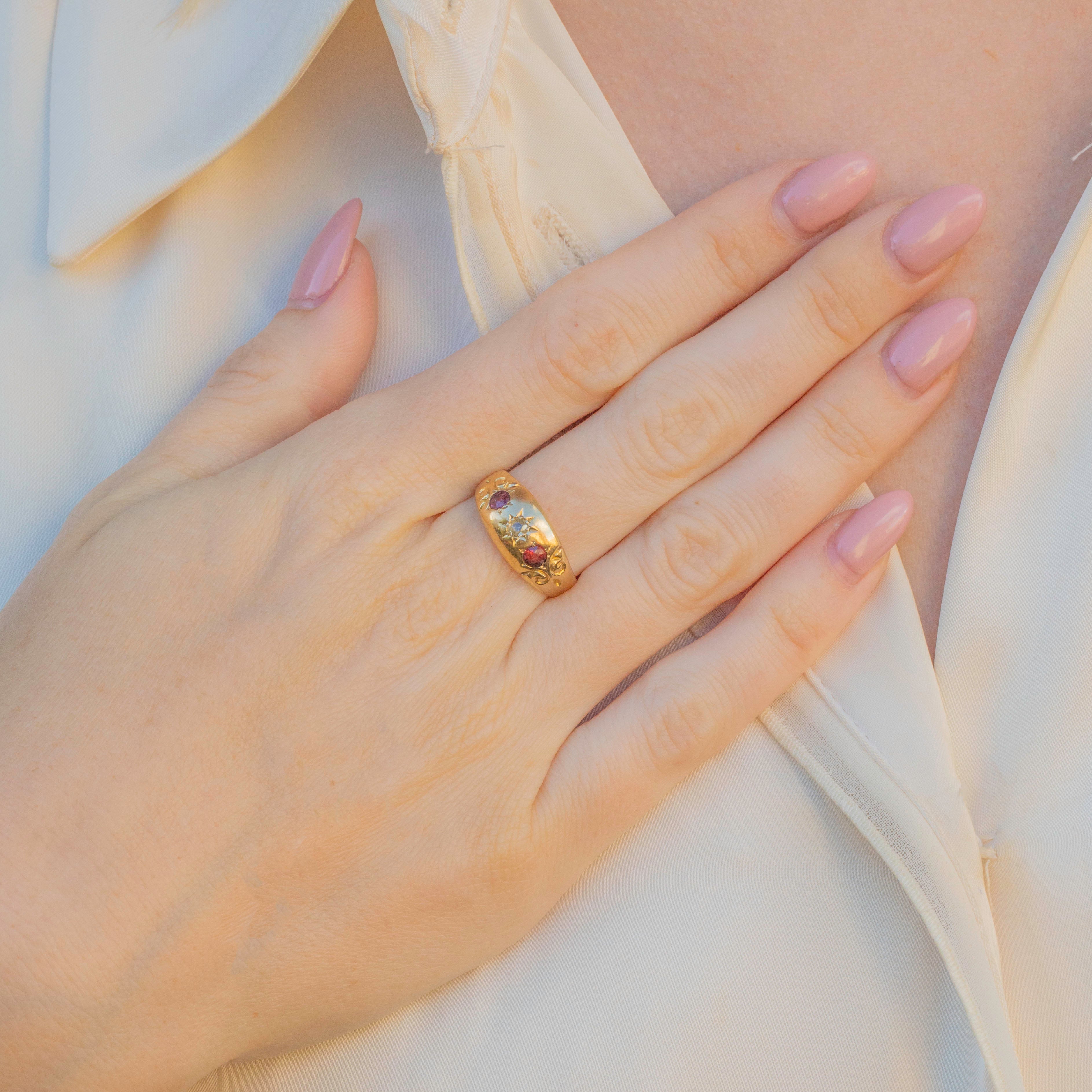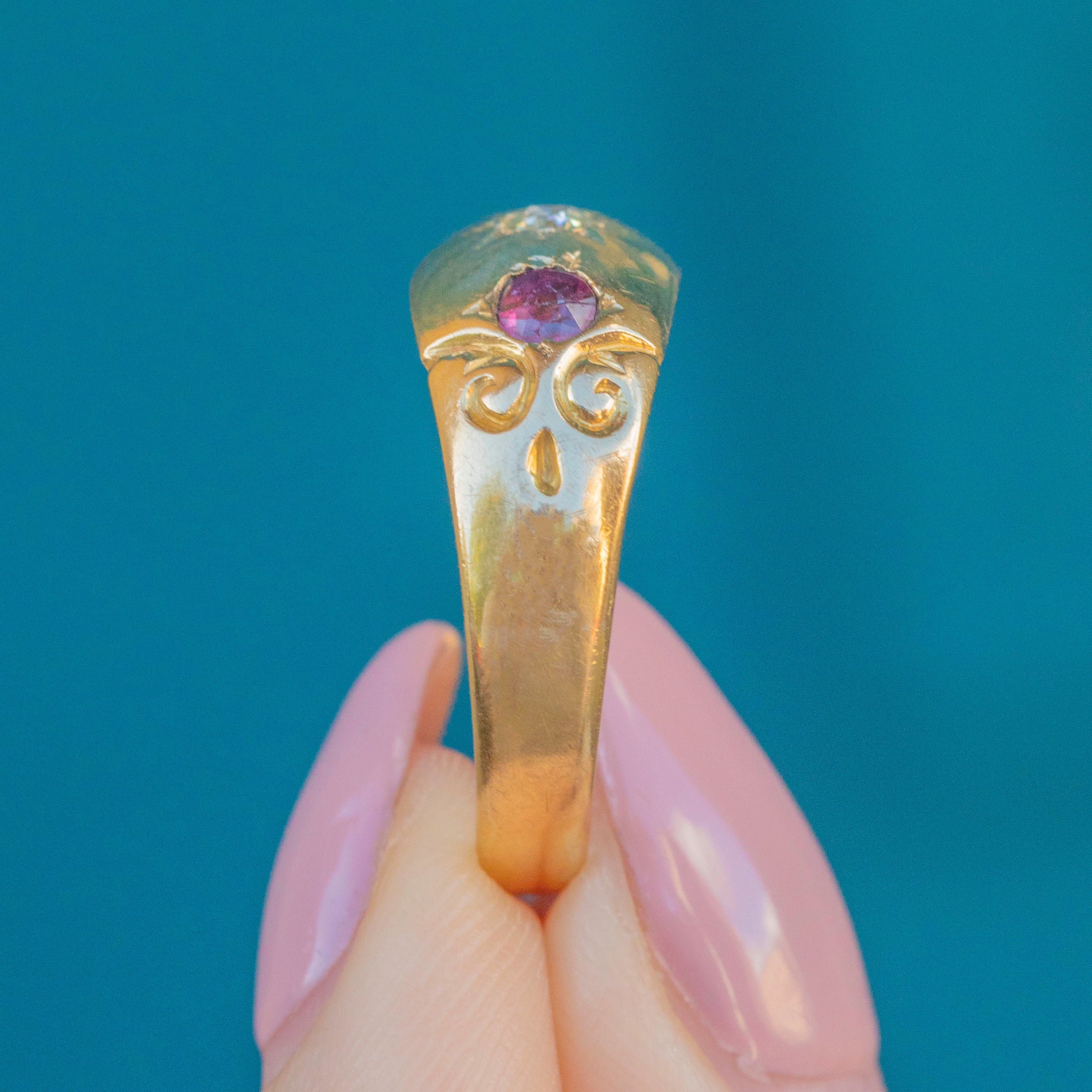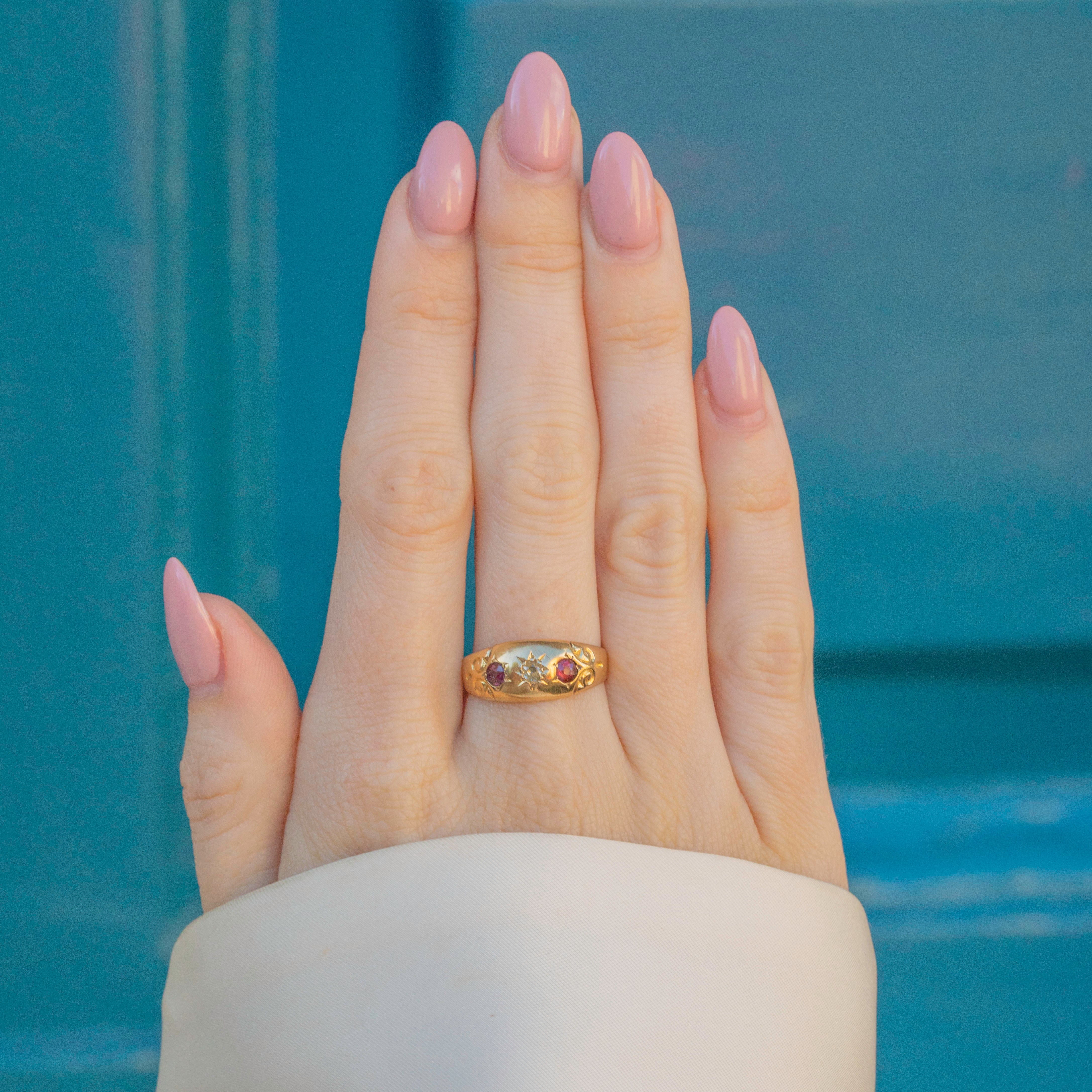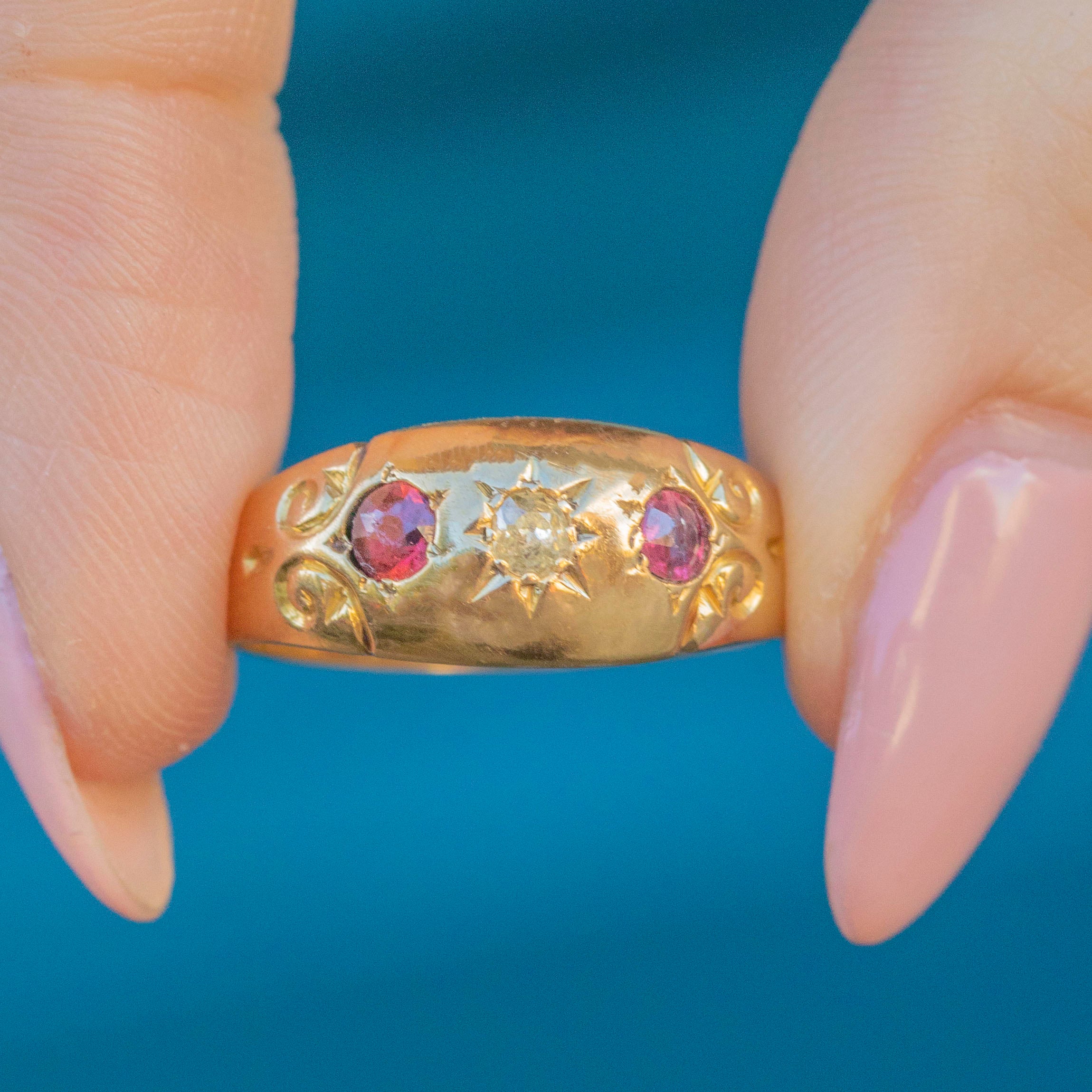Featuring two cherry-red Garnet stones and a single sparkling star-set Diamond, this Edwardian 18ct Gold ring certainly does not disappoint! With a full set of English hallmarks inside the band, we can accurately date this Edwardian delight to 1902!