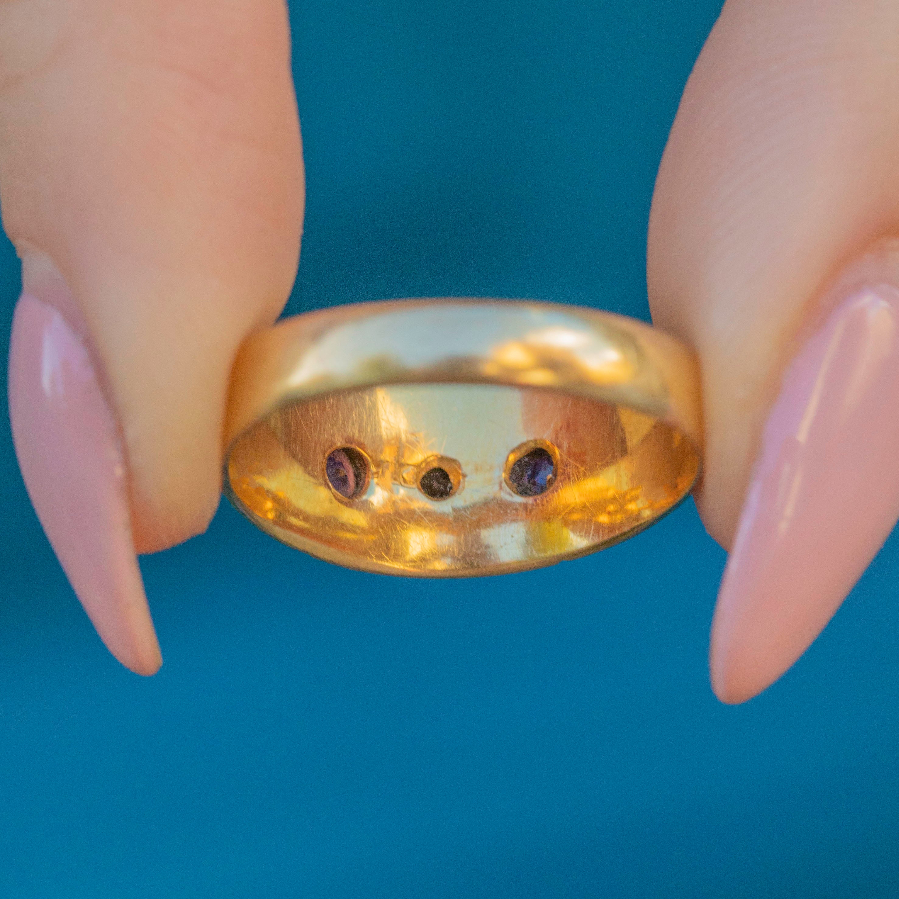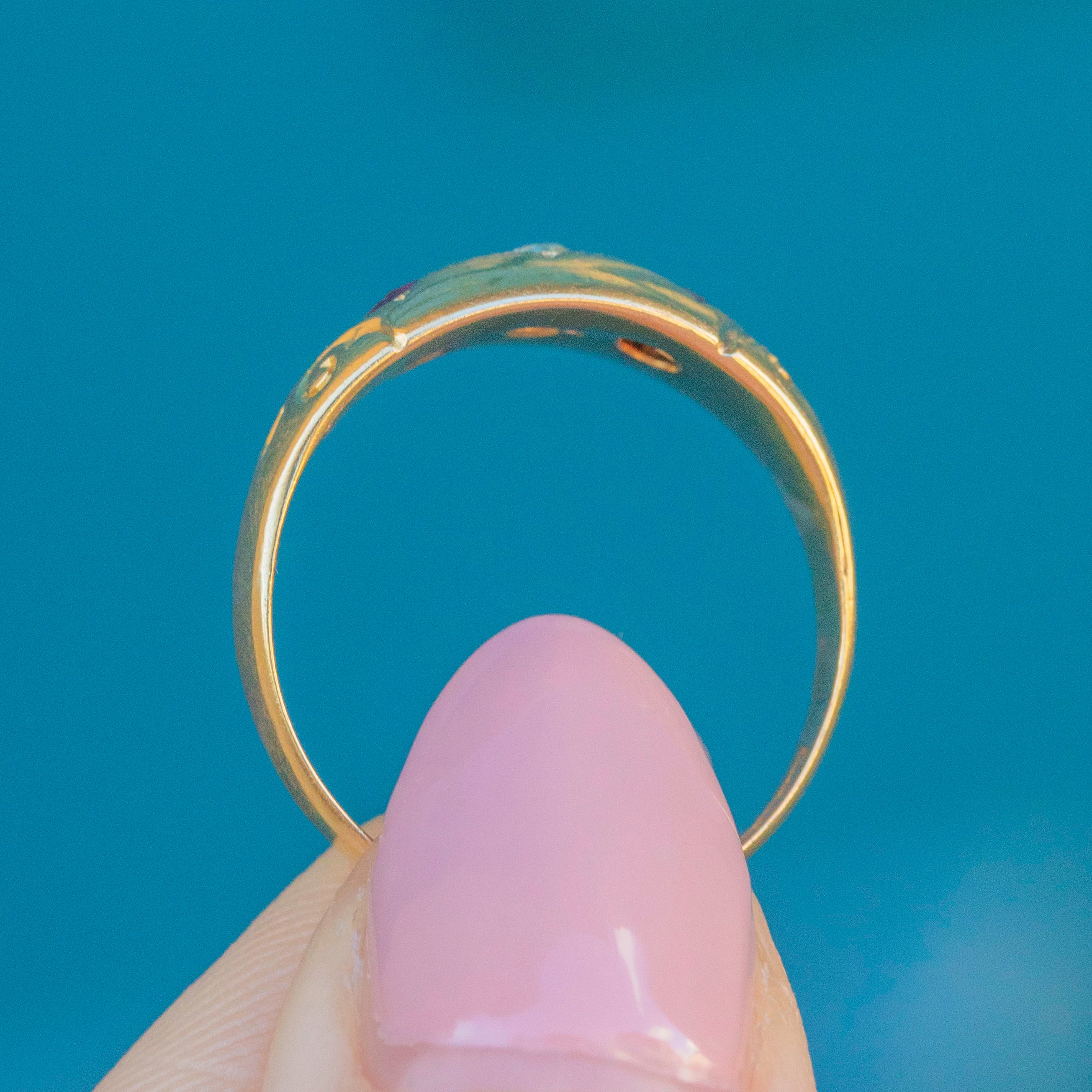 EXCELLENT. This antique 18ct Gold Garnet Diamond gypsy ring is in wonderful condition. Her gemstones are all securely set, with no chips to note. The Gold remains in great nick, with no dings to note! The hallmarks are fully legible, making this the perfect Edwardian treasure for your jewellery collection!