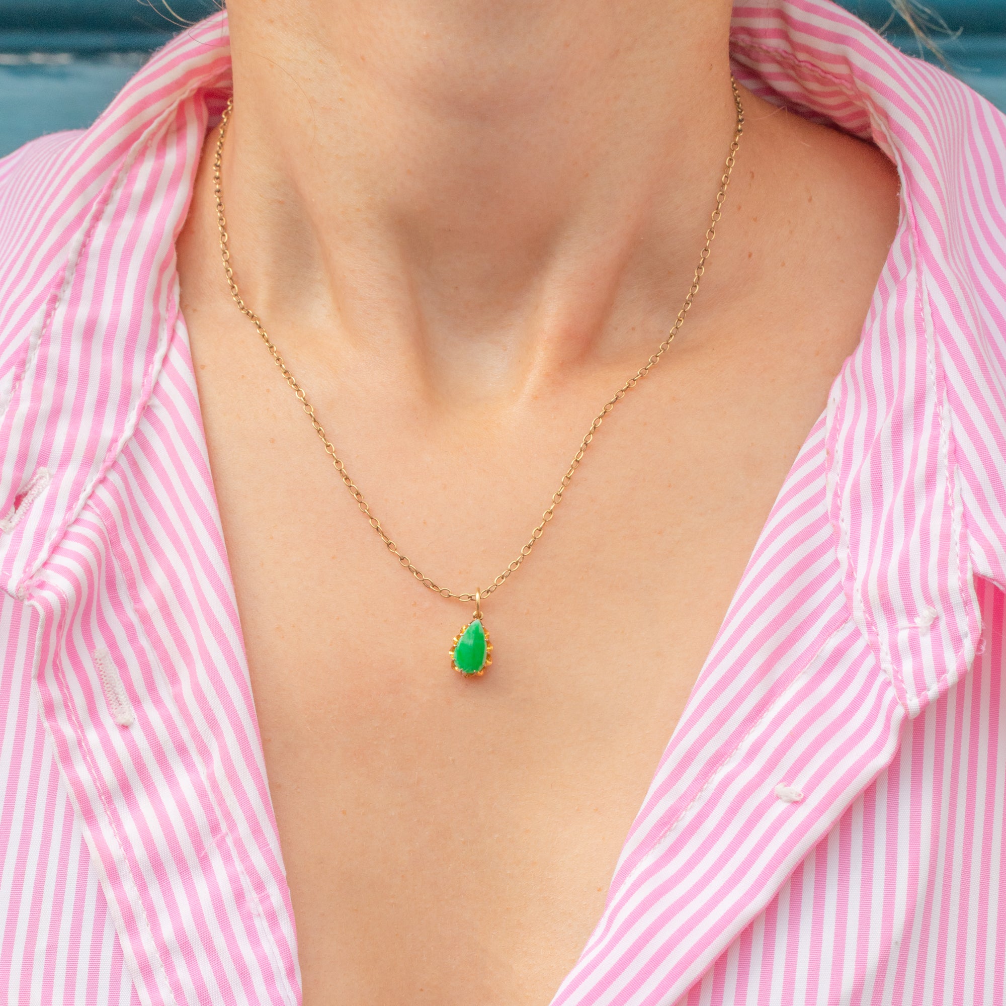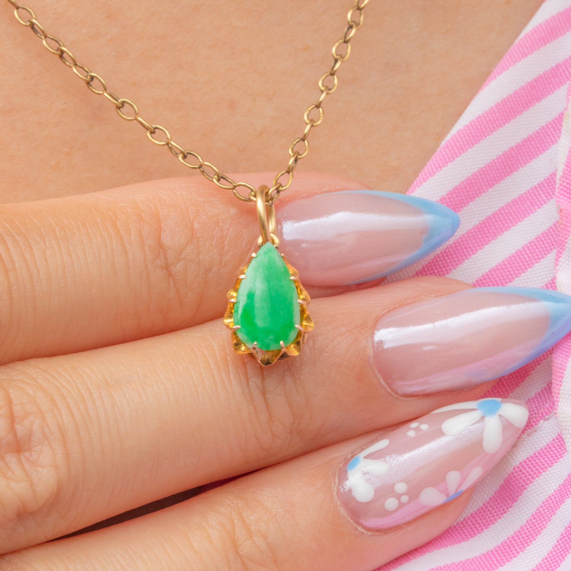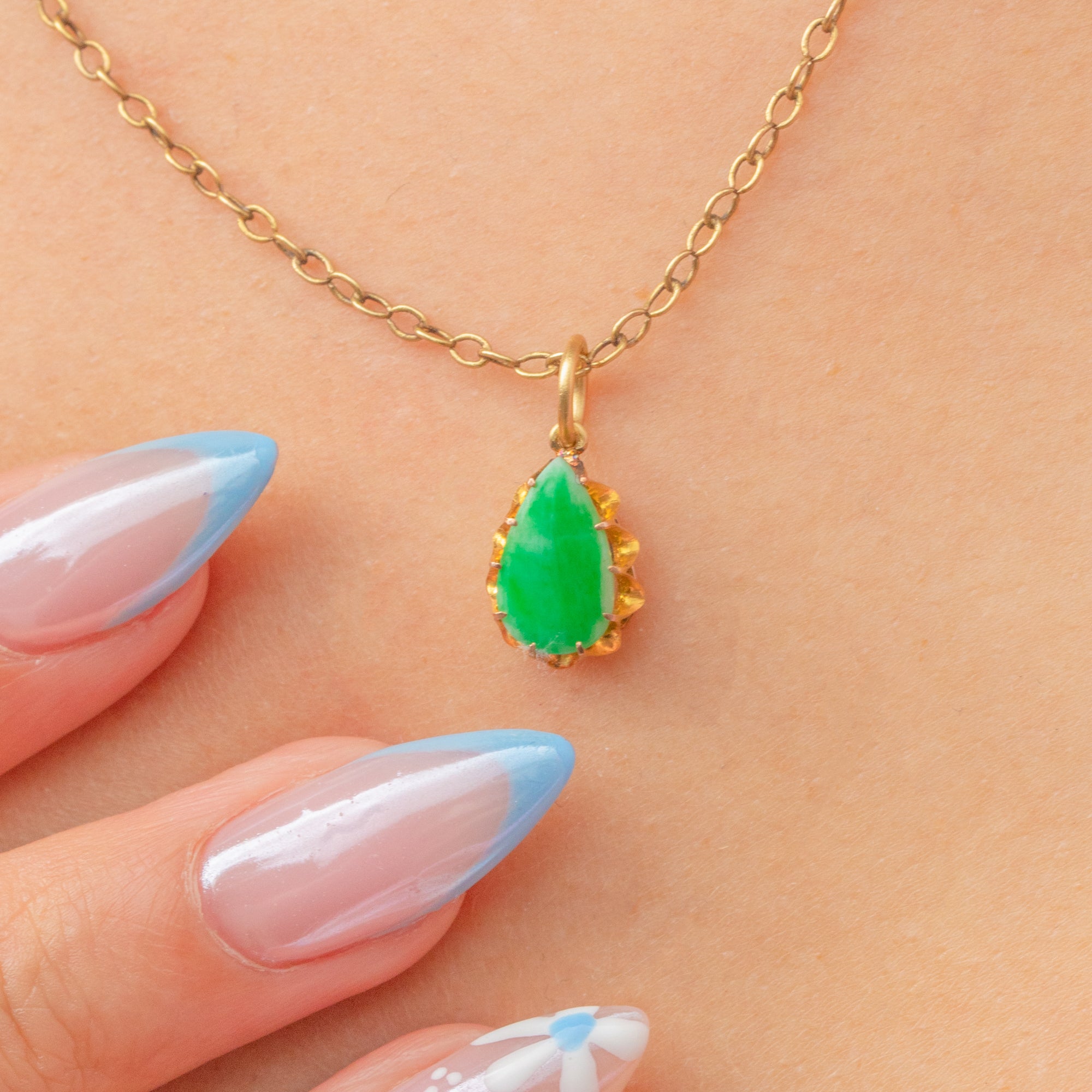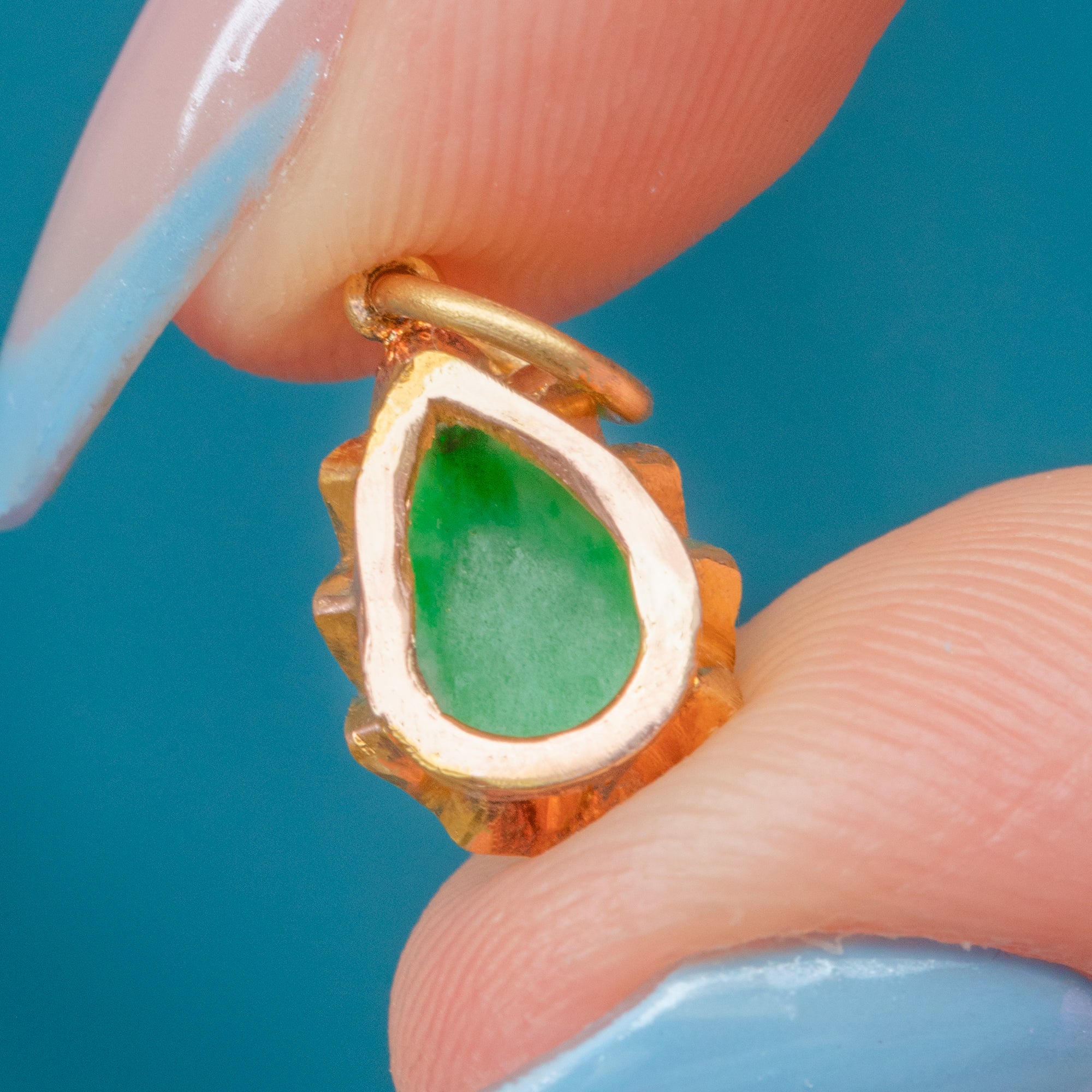 The Jade is hugged by bright and buttery 18ct Gold claws and suspends from a large jump ring, making this petite charm ideal for adding to your curated neck stack or bracelet.